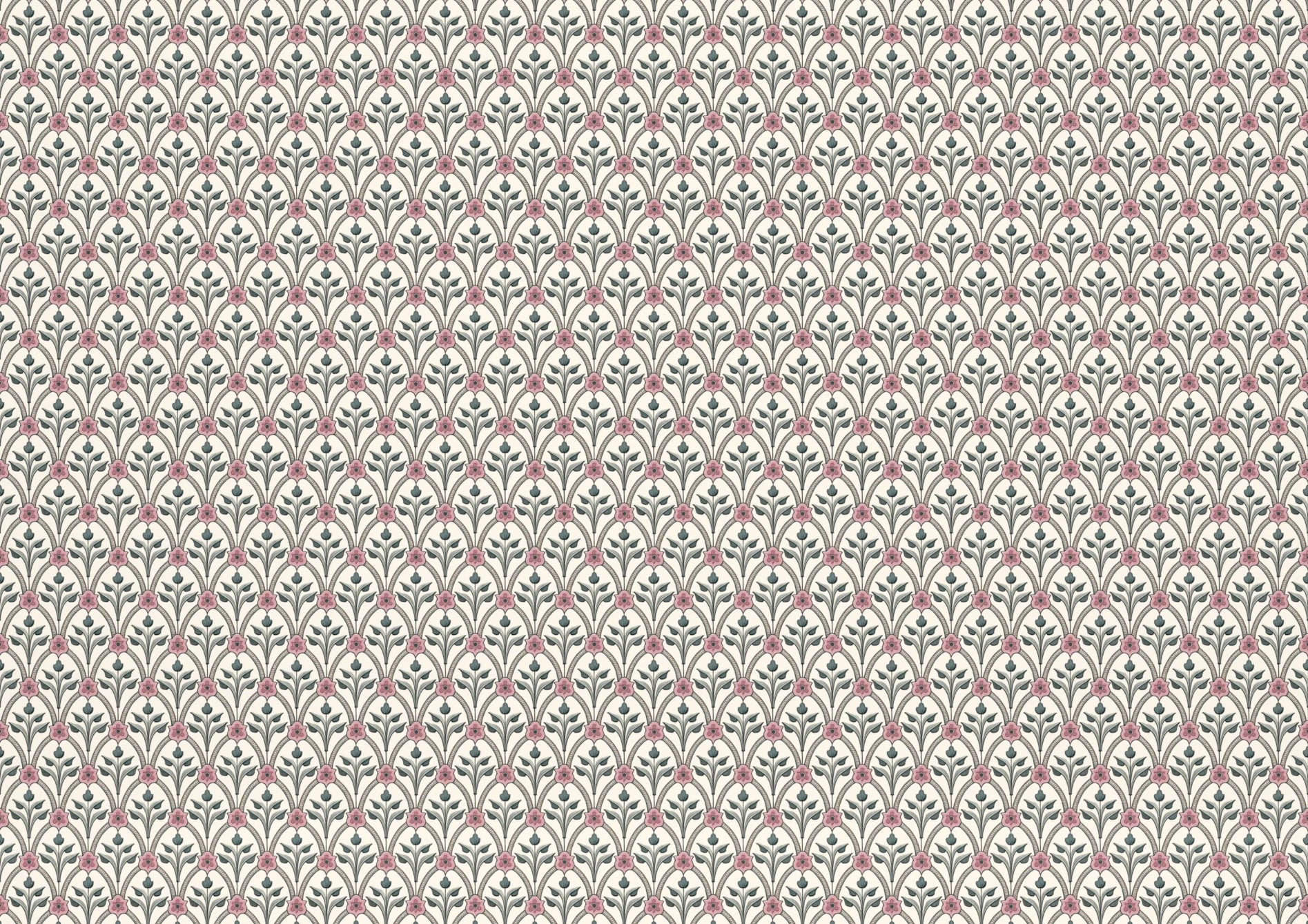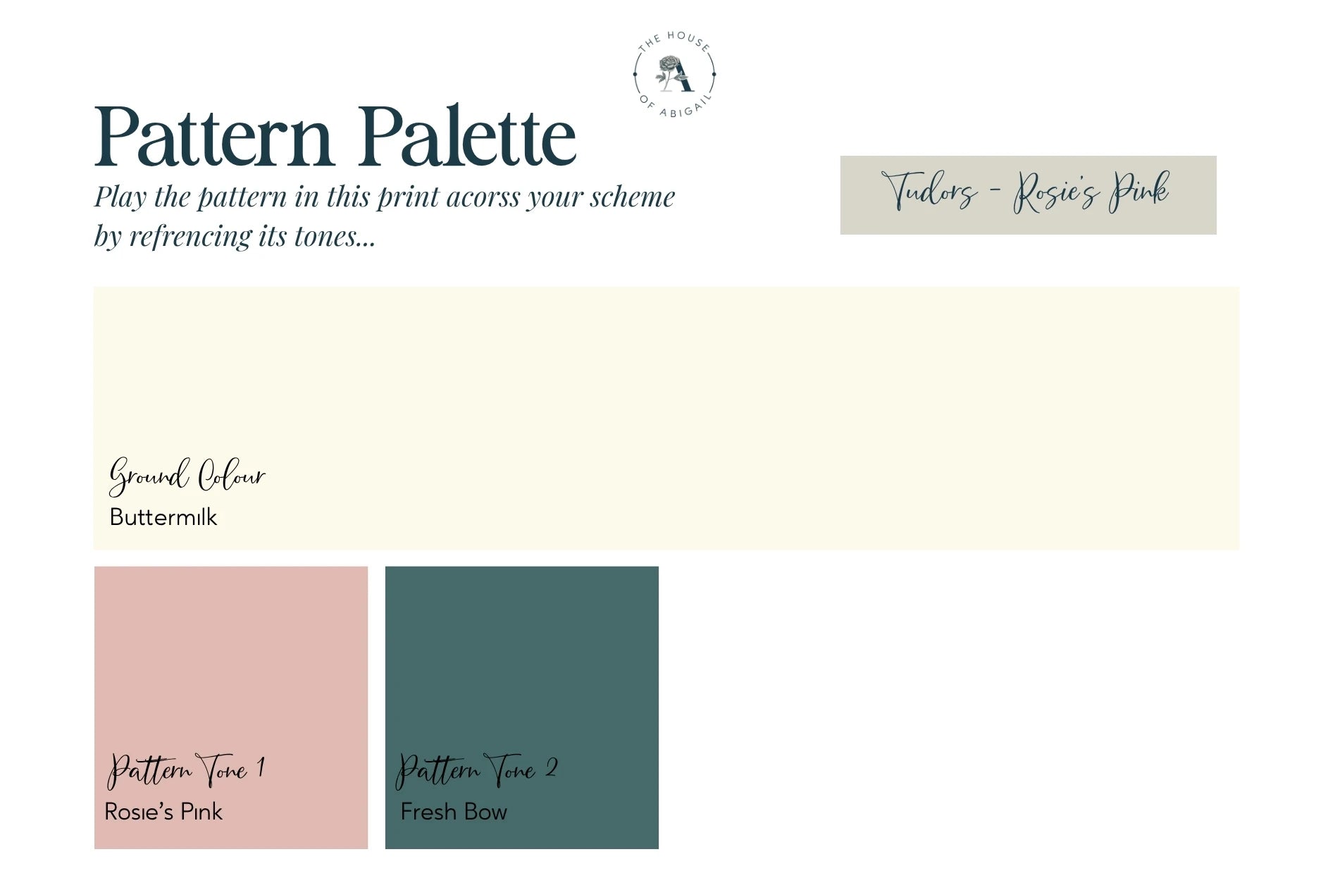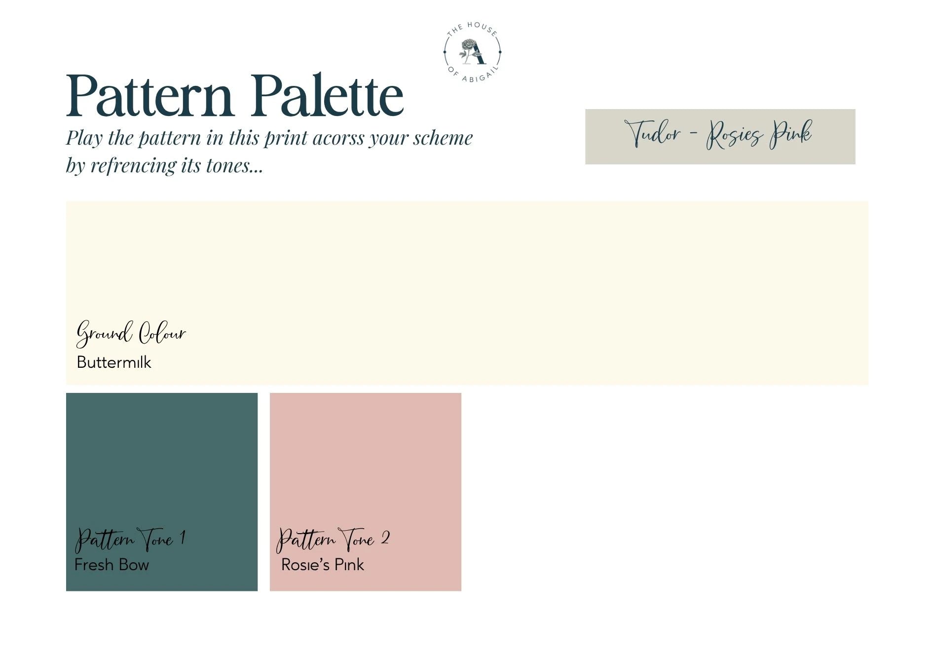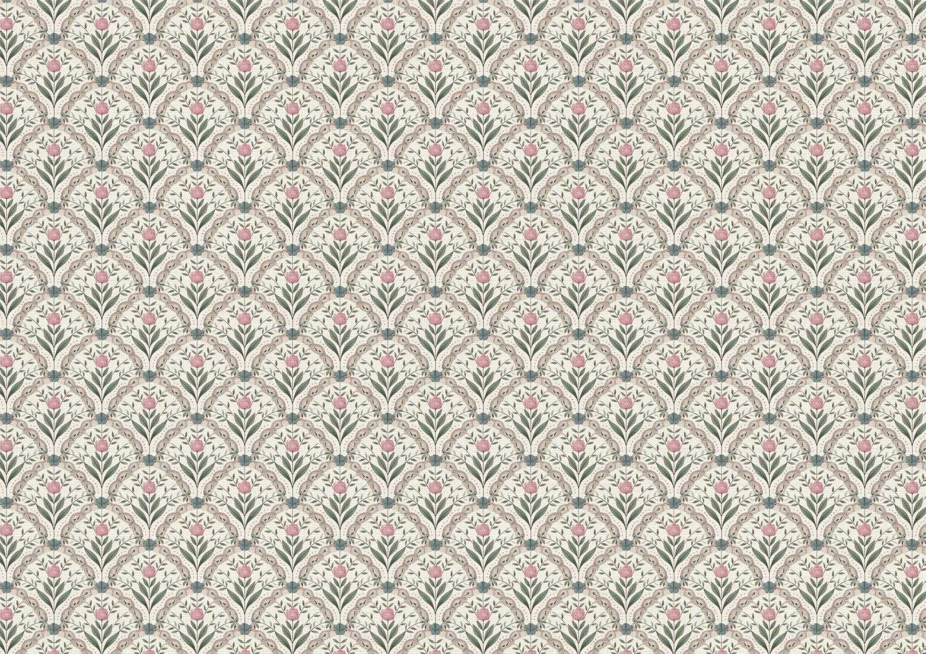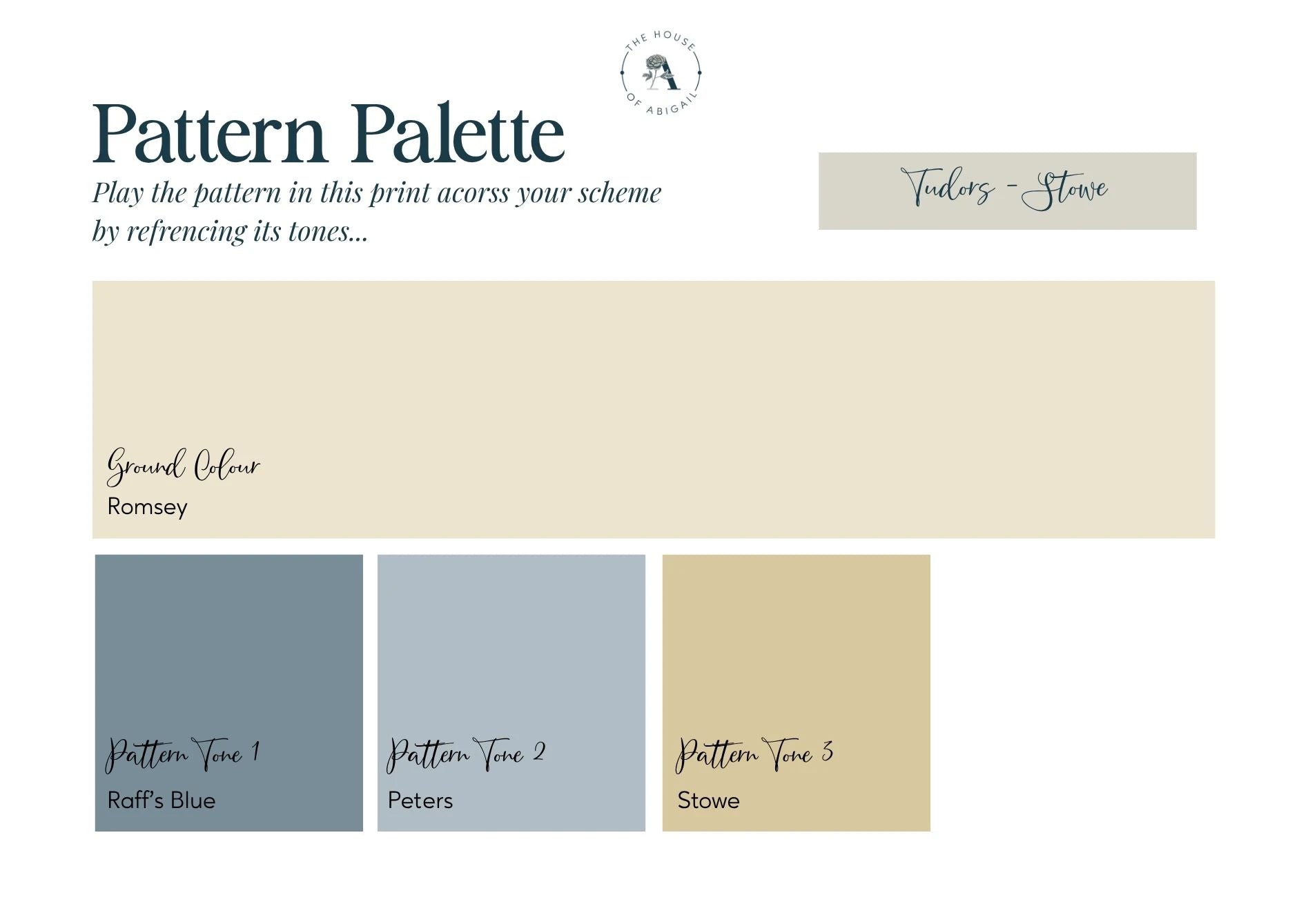 Tudors is a bold, structured motif inspired by medieval carvings, stained glass tracery, and decorative church stonework. Stylised florals rise in rhythmic, gothic arches, forming a strong vertical repeat that feels both ornamental and architectural. With a Stowe floral, set against a Romsey ground, the design balances soft botanical detail with graphic precision and historic grandeur.