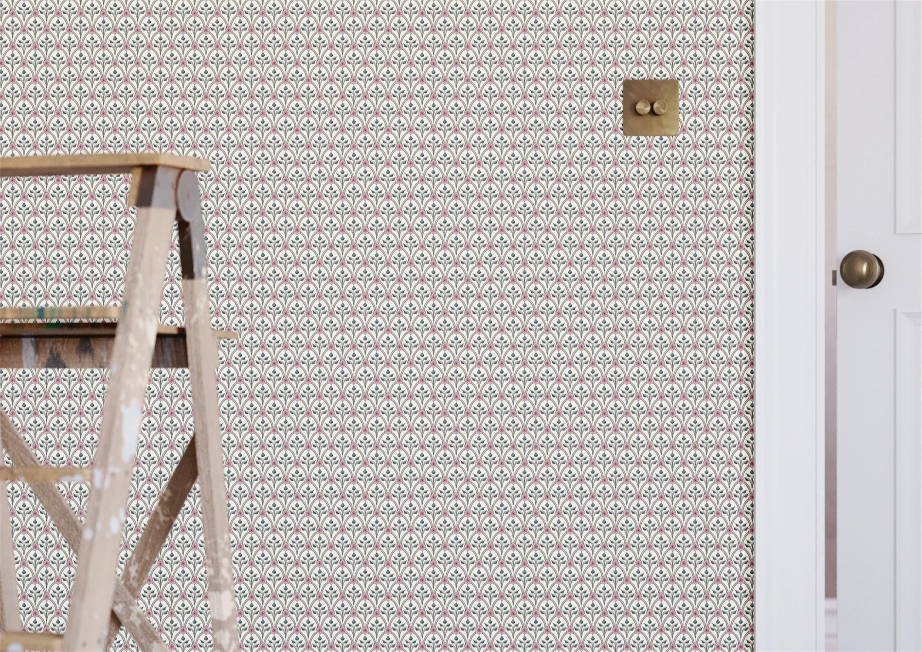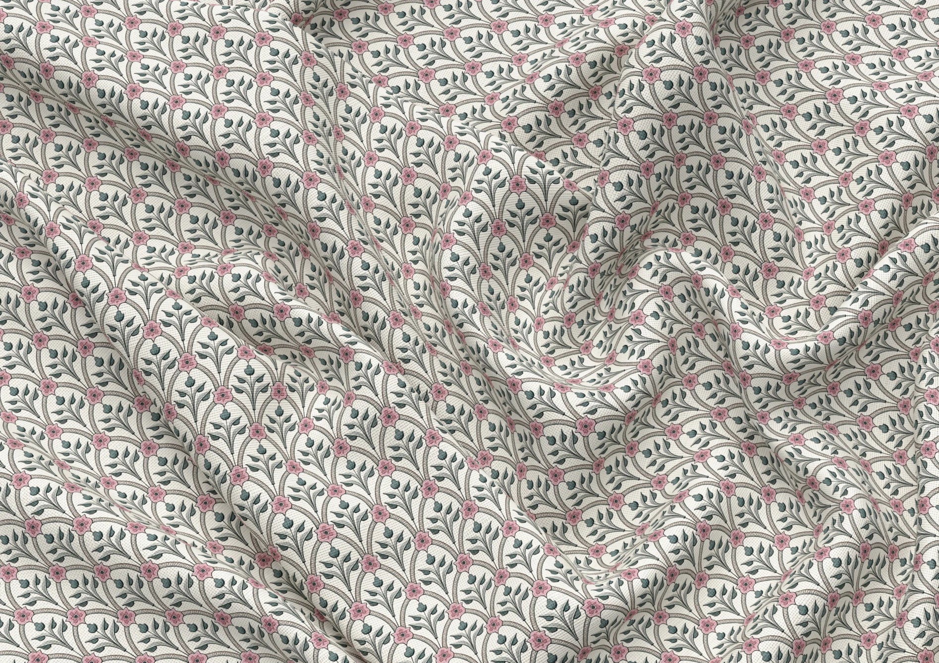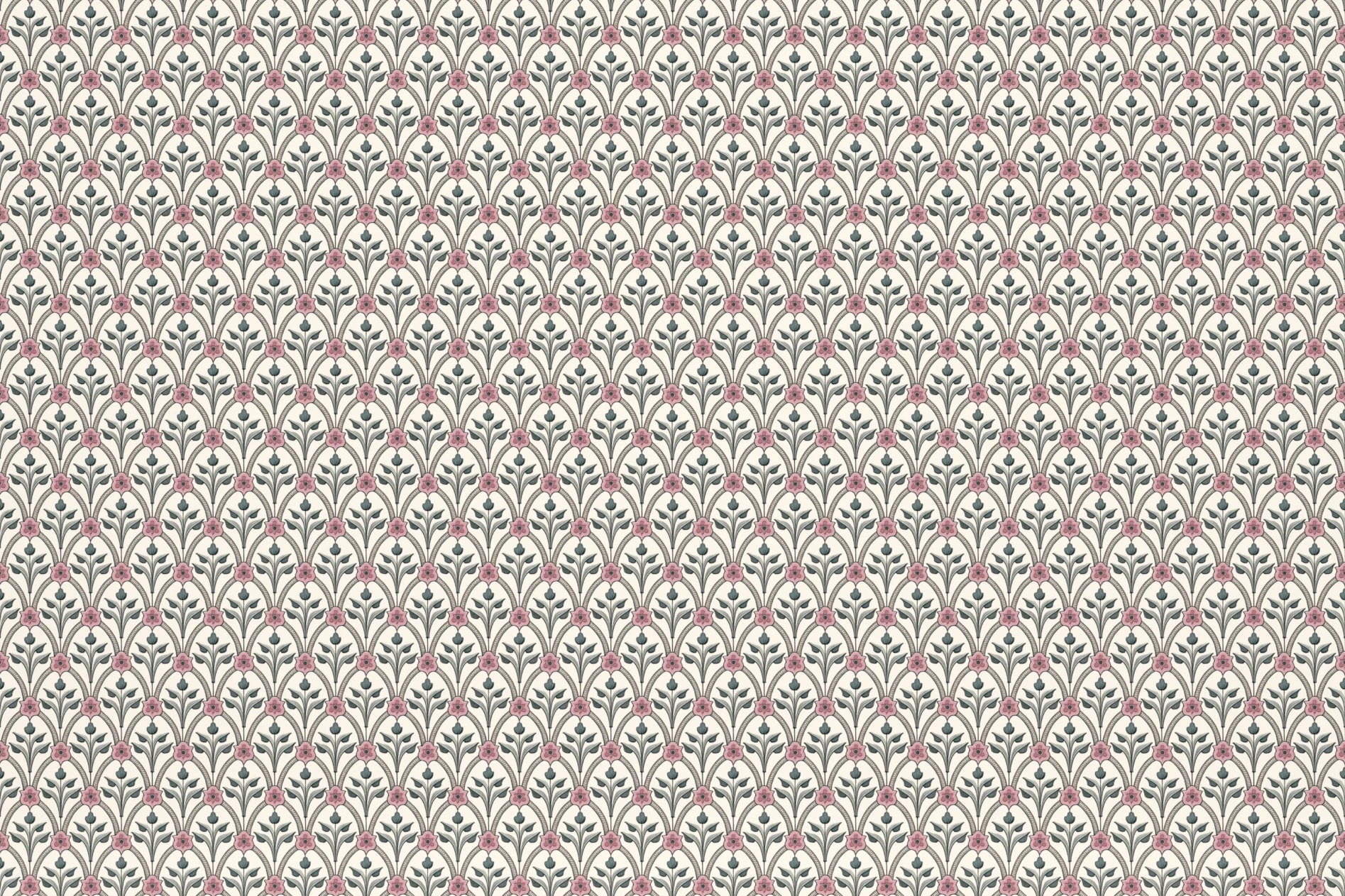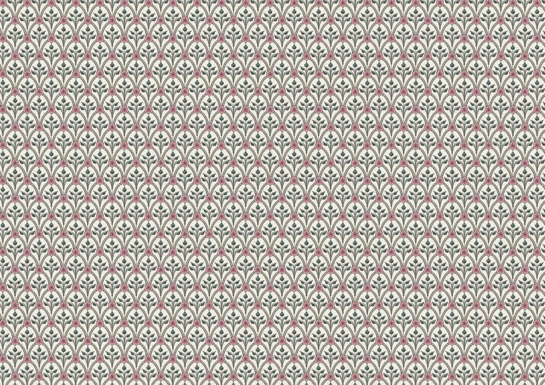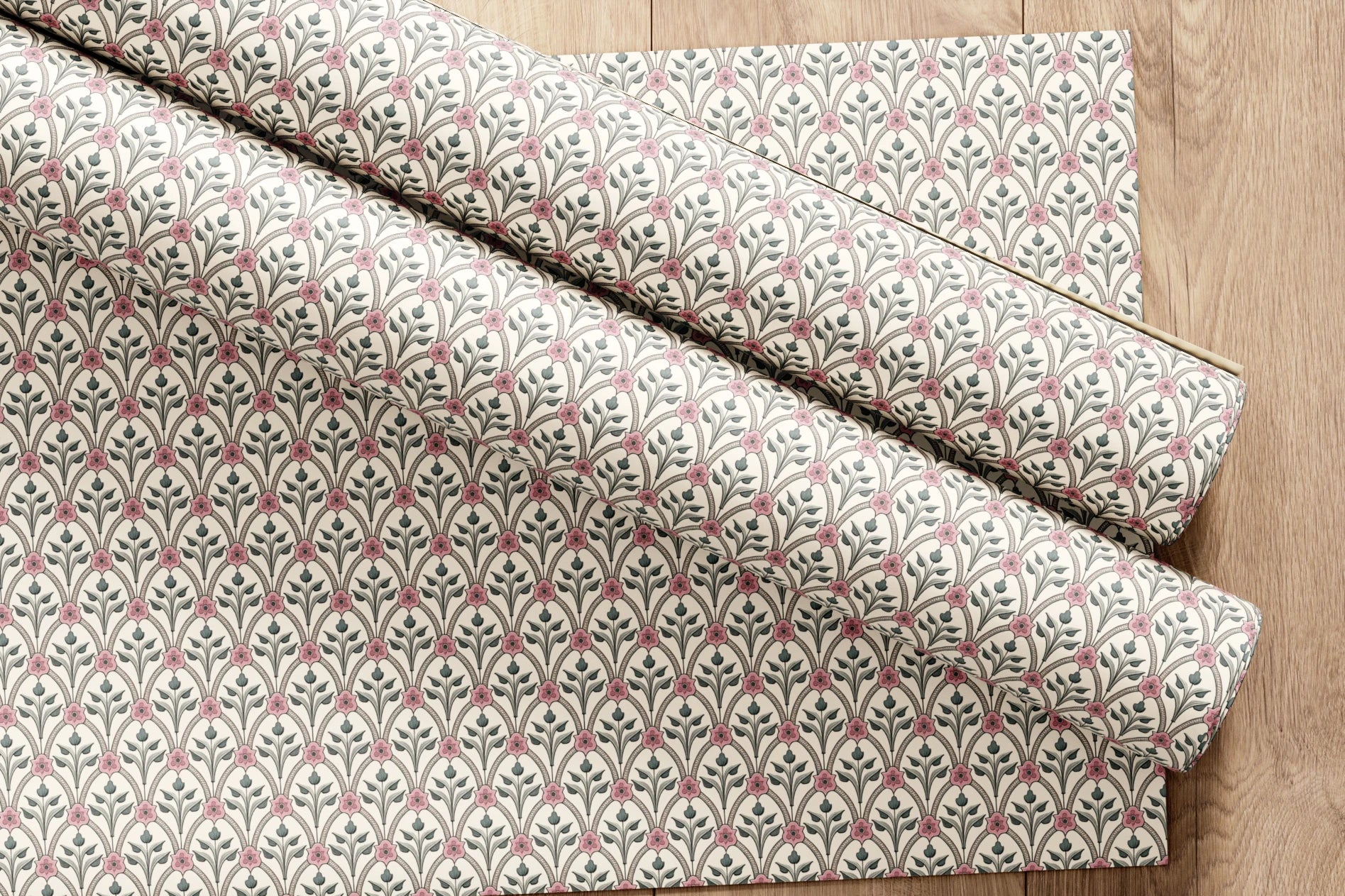 Tudors is a bold, structured motif inspired by medieval carvings, stained glass tracery, and decorative church stonework. Stylised florals rise in rhythmic, gothic arches, forming a strong vertical repeat that feels both ornamental and architectural. With a Stowe floral, set against a Romsey ground, the design balances soft botanical detail with graphic precision and historic grandeur.
