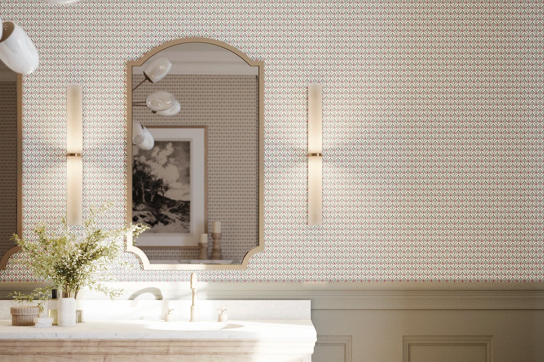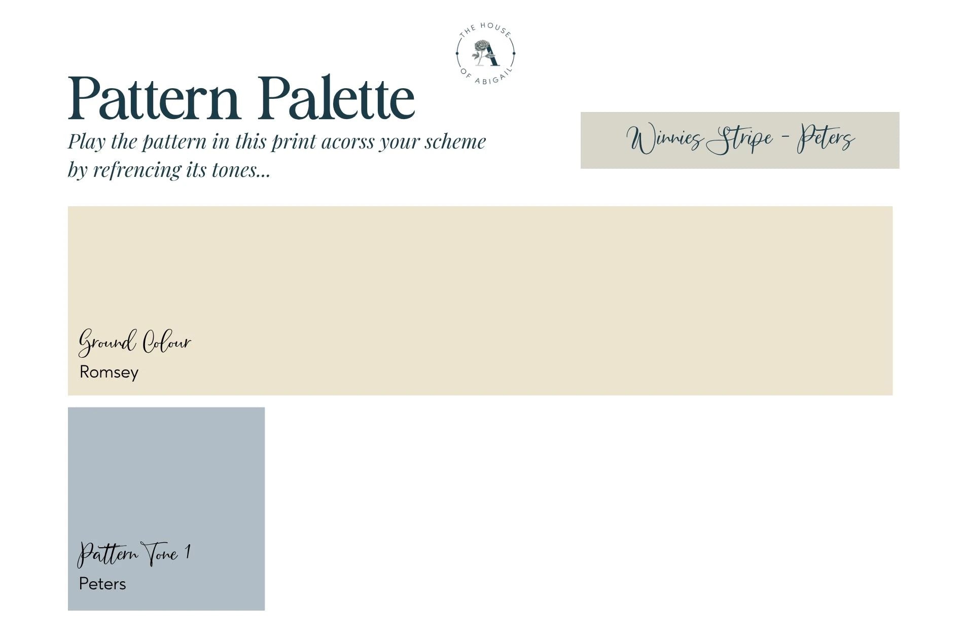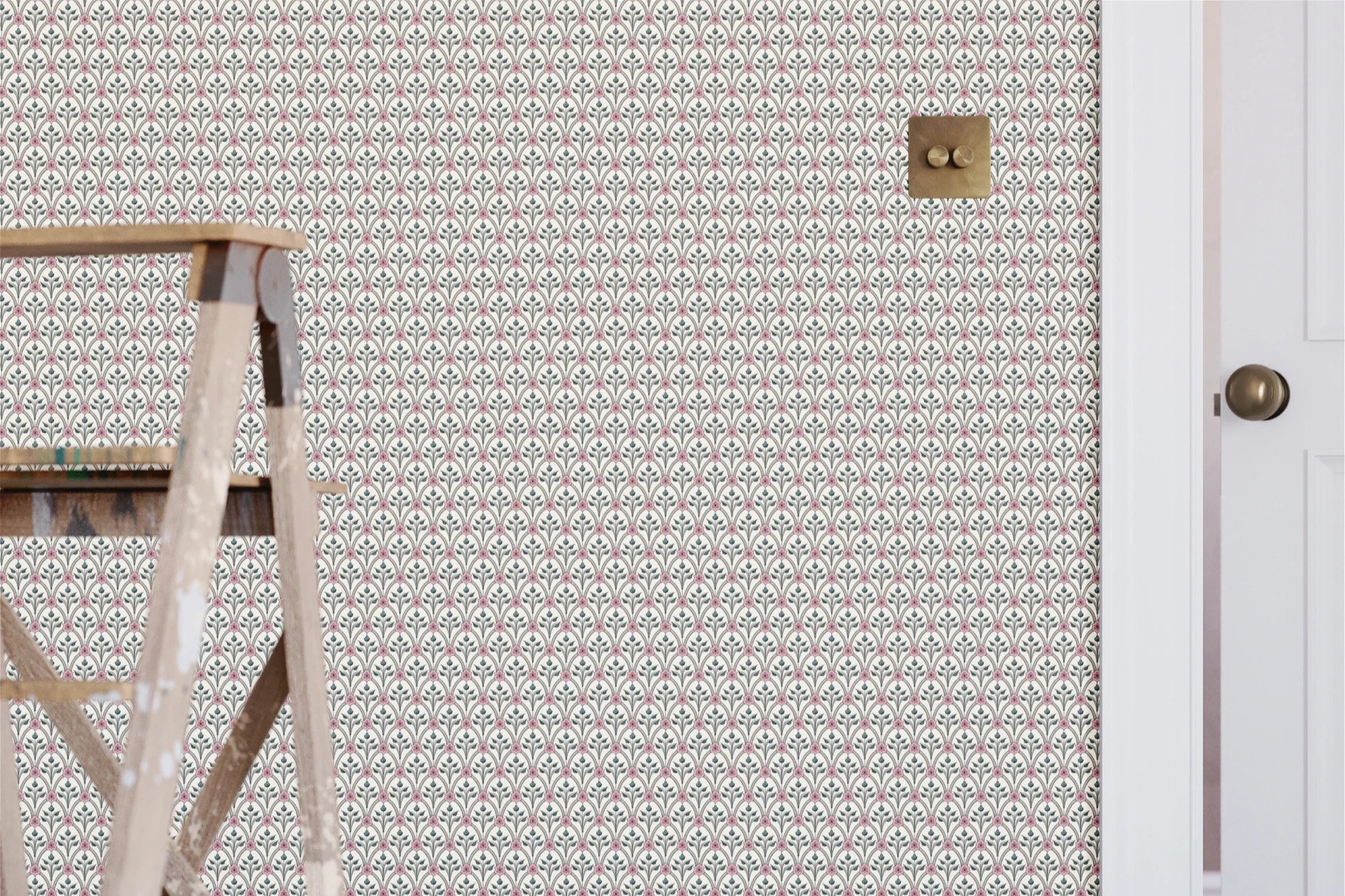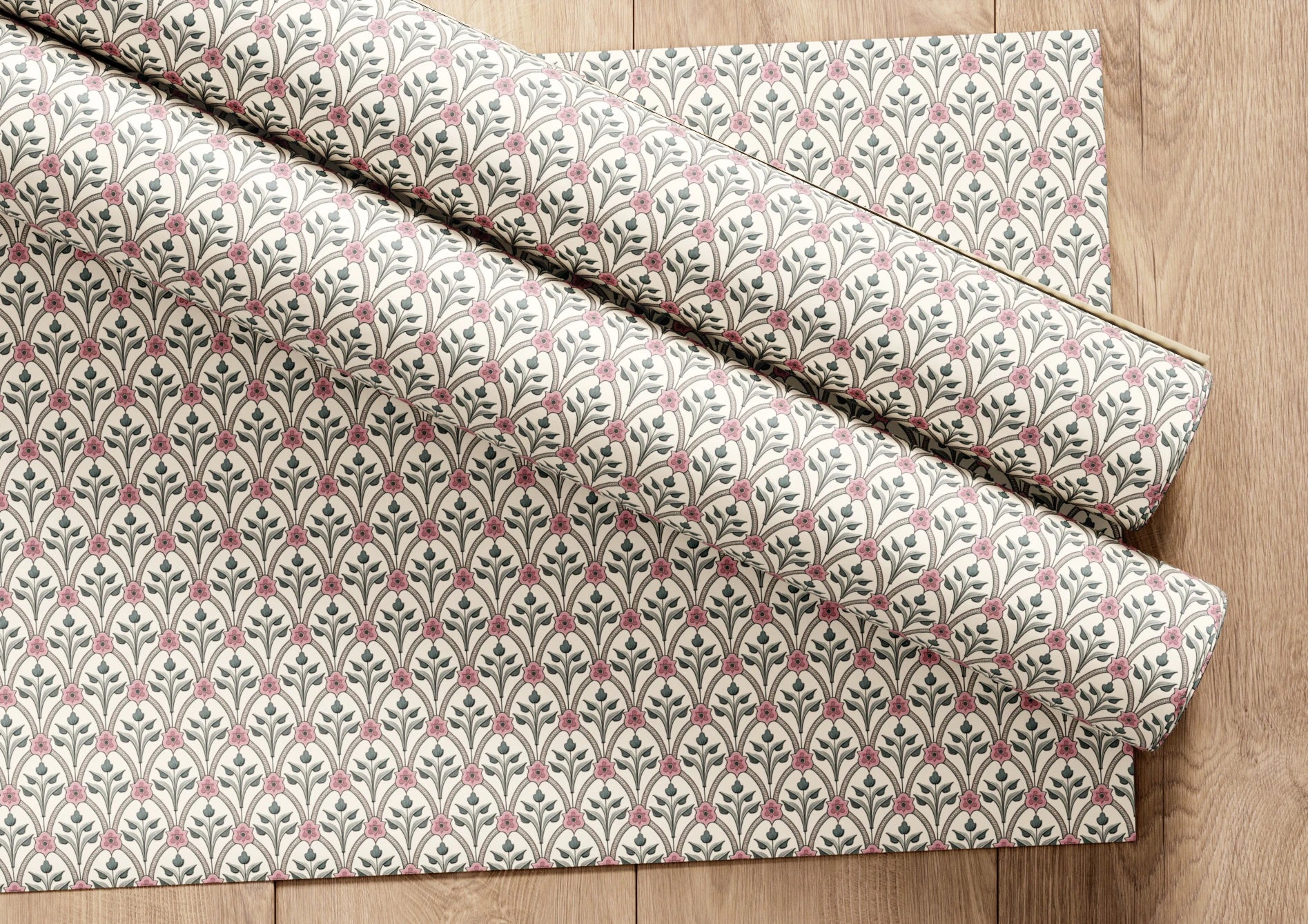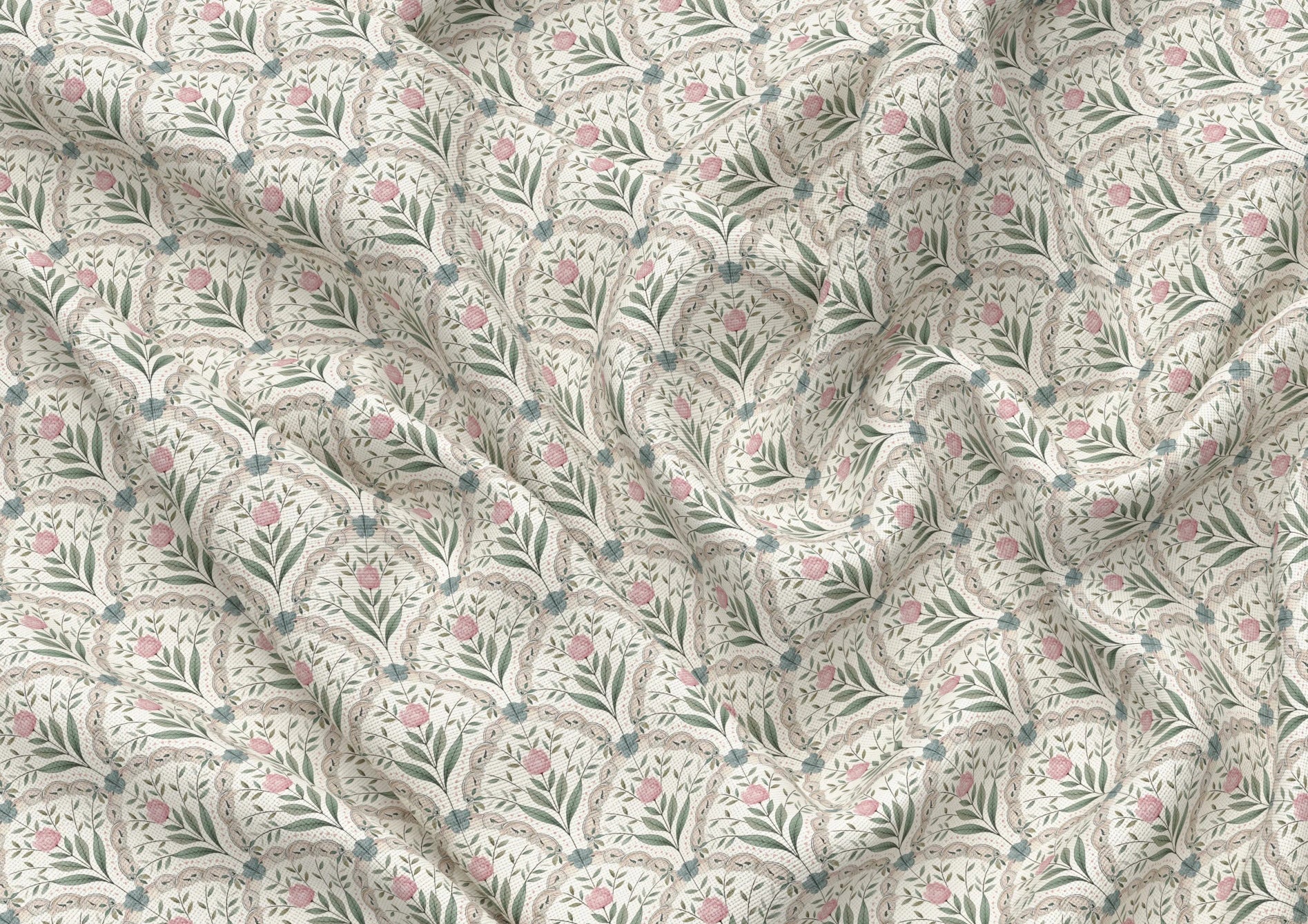 Tudors is a bold, structured motif inspired by medieval carvings, stained glass tracery, and decorative church stonework. Stylised florals rise in rhythmic, gothic arches, forming a strong vertical repeat that feels both ornamental and architectural. With a Stowe floral, set against a Romsey ground, the design balances soft botanical detail with graphic precision and historic grandeur.