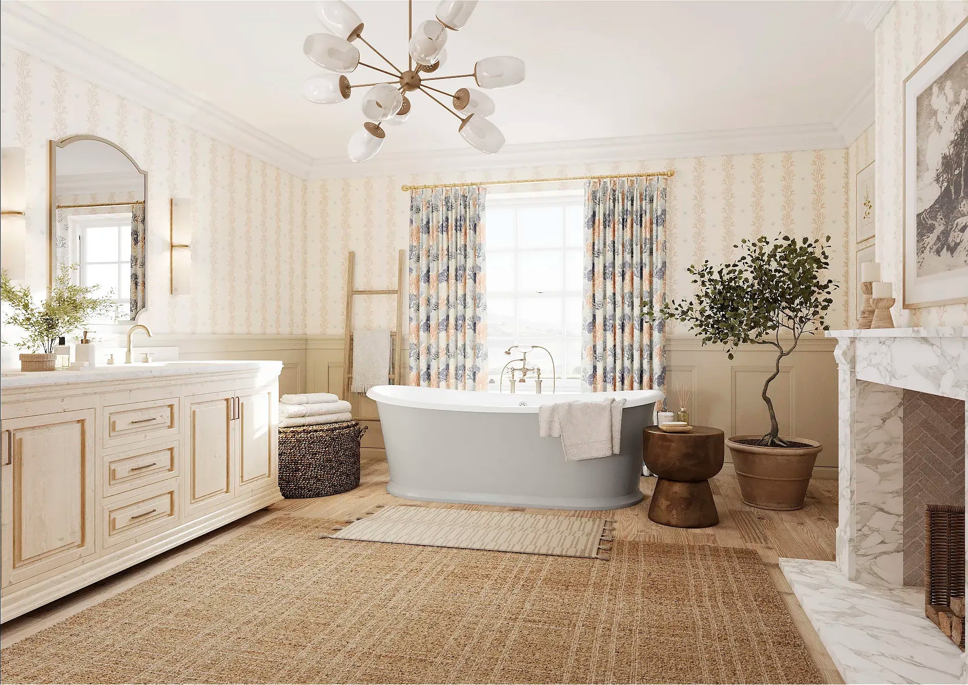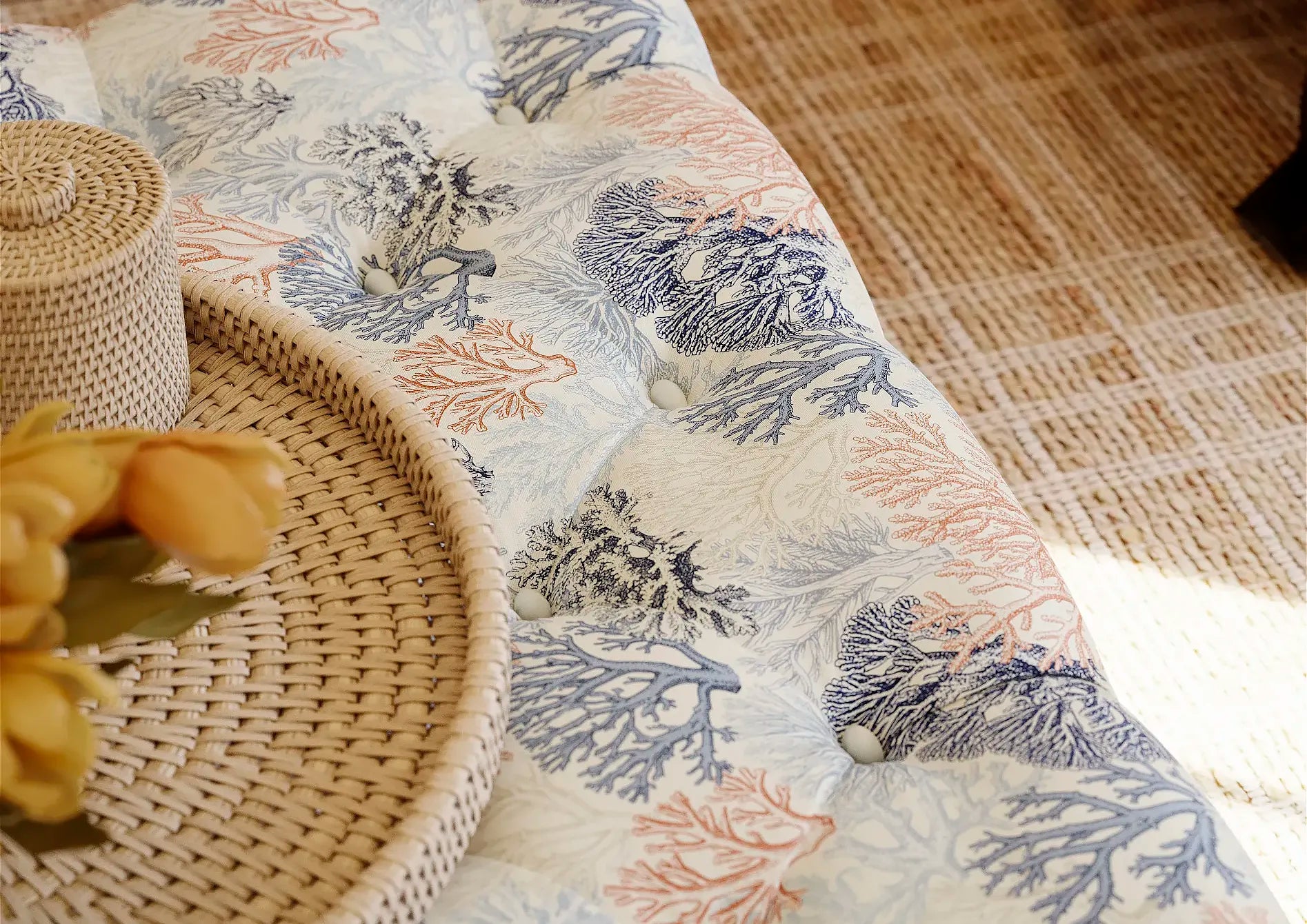 Coco in Petal brings coral and seaweed-inspired forms to life in a spirited, sun-warmed palette - with fresh petal pinks, chalky blues and soft sand tones floating over a warm ivory ground. Originally hand-drawn by Abigail and inspired by natural specimens from across the British Commonwealth, the design celebrates the delicate strength of underwater structures, reimagined for refined interiors. Part of the Bigbury Collection, Coco’s flowing repeat and quietly intricate detail make it ideal for statement curtains, soft upholstery or large-scale wallcoverings. The Petal colourway adds a joyful lift to the coastal calm of the range - perfect for spaces that blend tradition with optimism. Available in fabric and wallpaper.