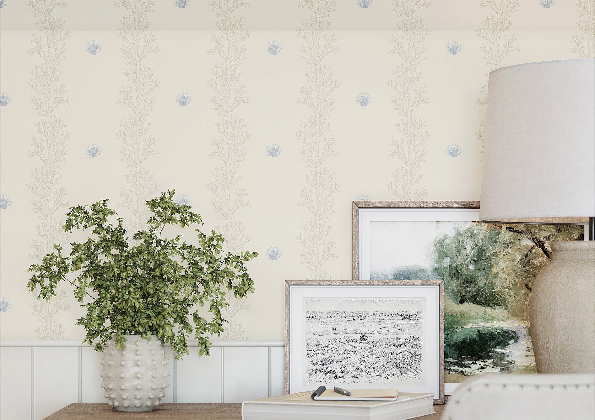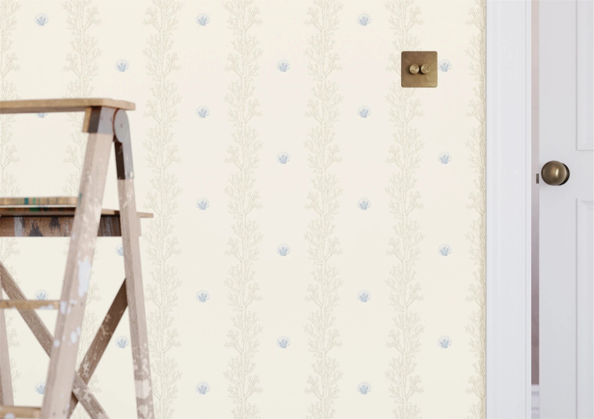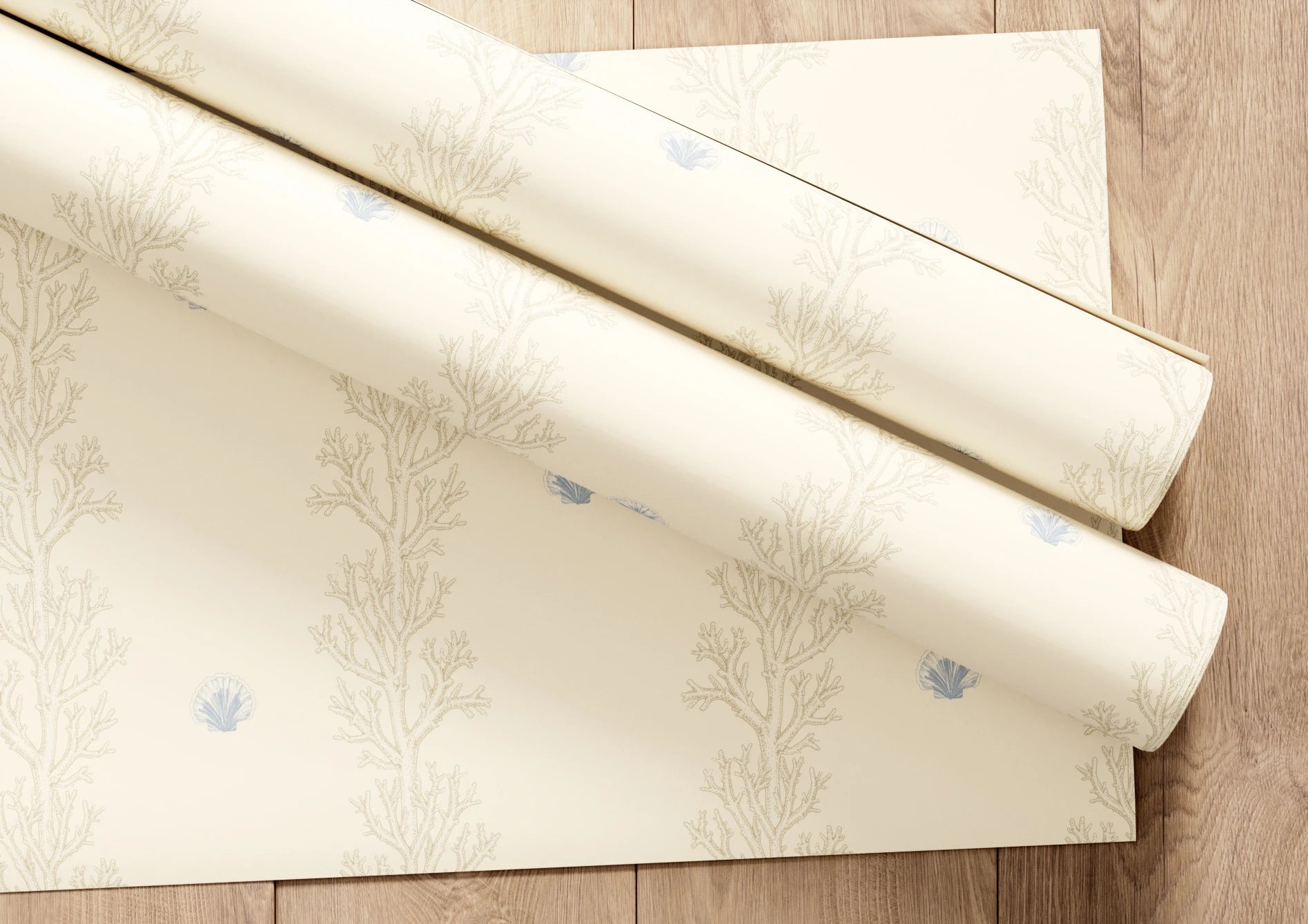 “Coral Line” captures the elegance of coastal forms with vertical coral branches and scattered shell motifs. In the Petal colourway, a soft cream ground and pale blue accents create a light, graceful palette - understated and calming. Perfect for bedrooms, nurseries, or living spaces where a sense of serenity and gentle pattern is desired.