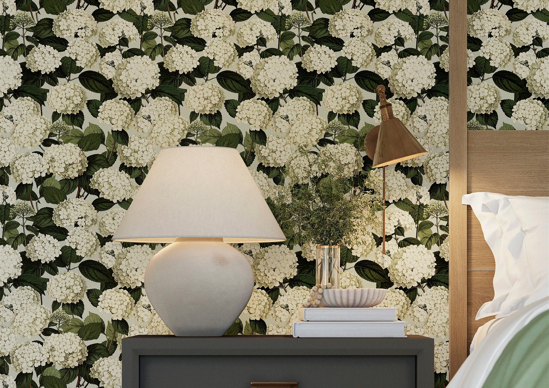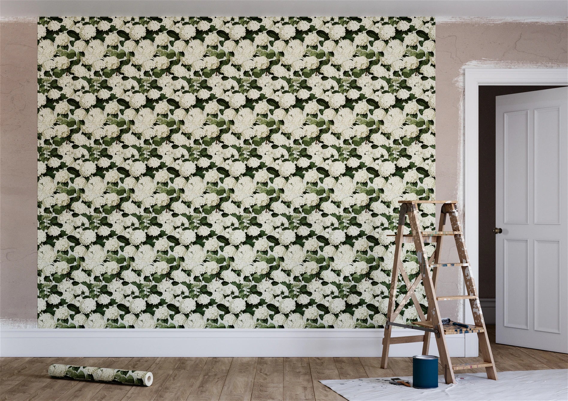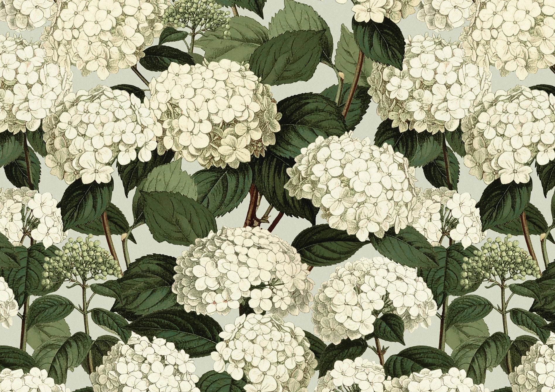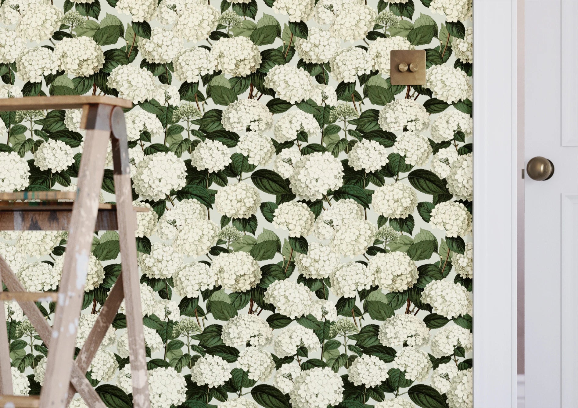 “Annabelle” is an ode to hydrangeas in full bloom - lush ivory clusters and leafy greens brought to life against a softly muted, dirty cream ground. In the Hoves colourway, the palette feels warm and understated, allowing the florals to sit with quiet confidence. A versatile choice that lends itself to heritage-inspired interiors, creating a scheme that feels both grounded and gracefully timeless.