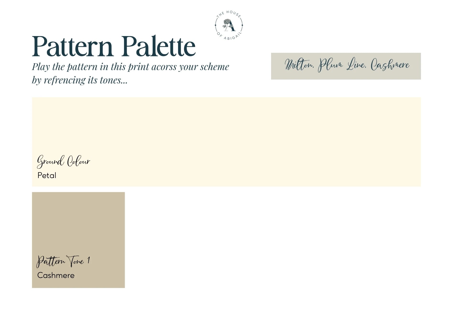 "Plum Line is part of the Milton Collection, where organic forms are simplified into elegant, graphic repeats. Inspired by fruiting branches, this design traces slender stems and clustered leaves in a flowing diagonal rhythm, creating a pattern that feels both structured and natural.