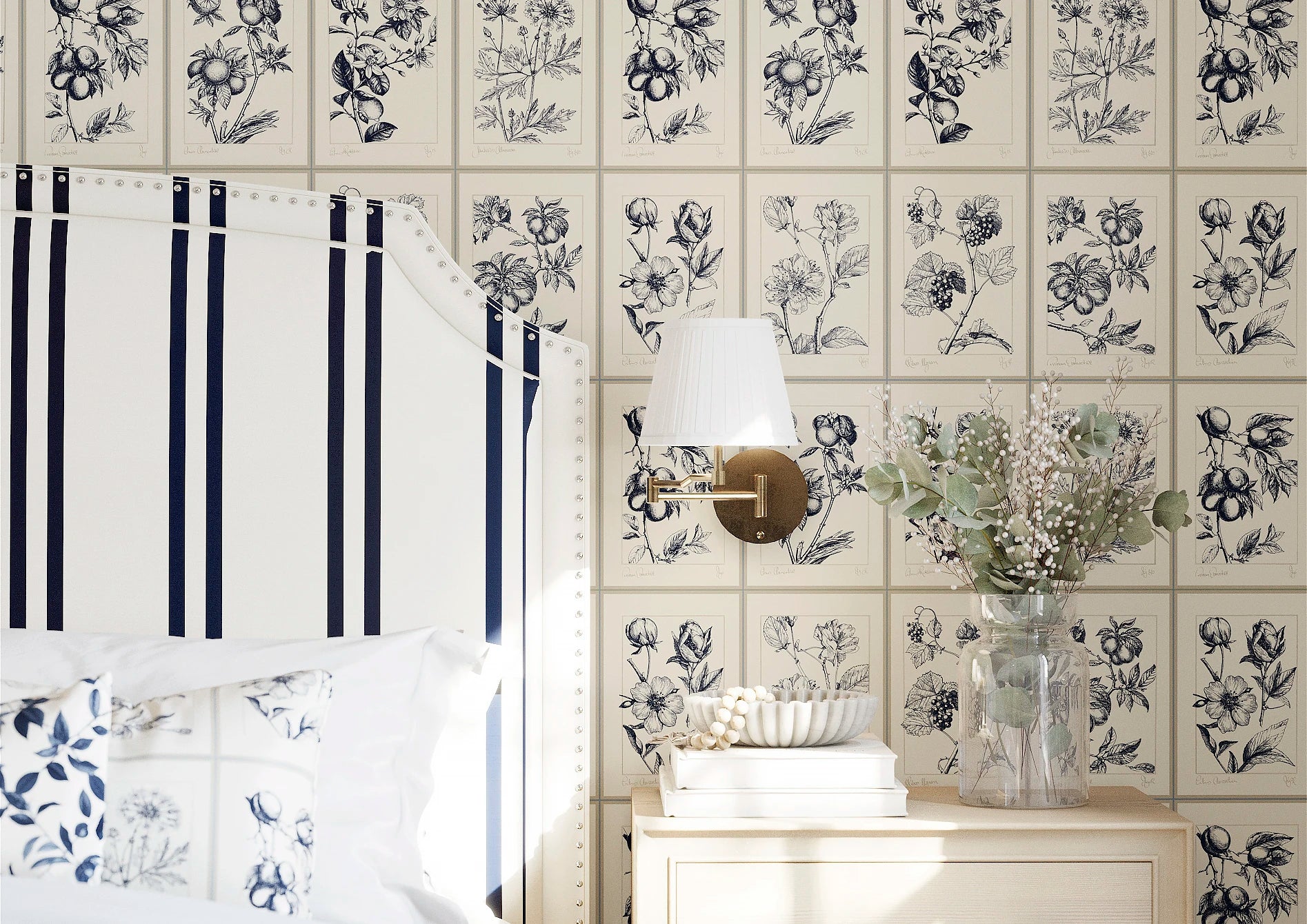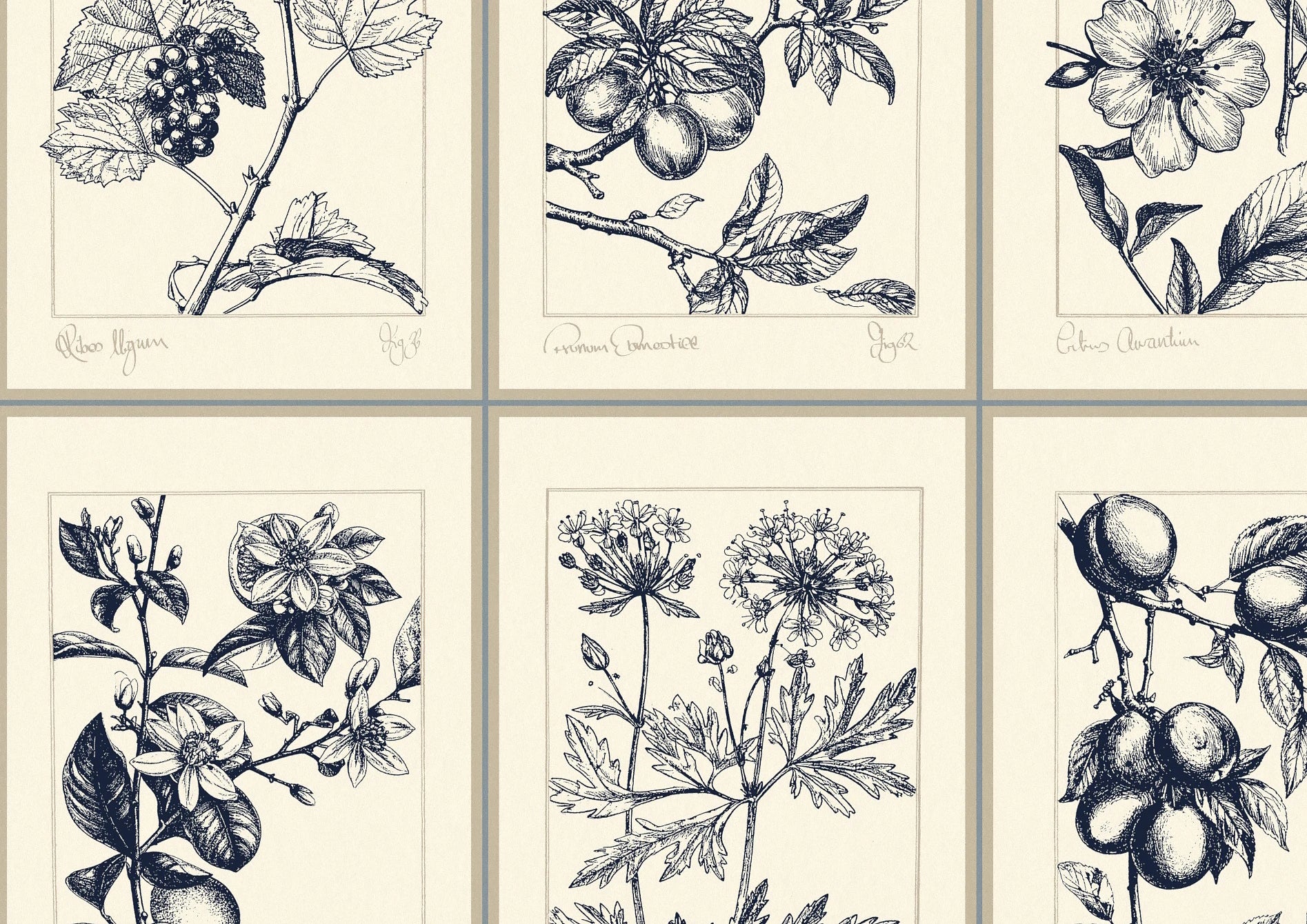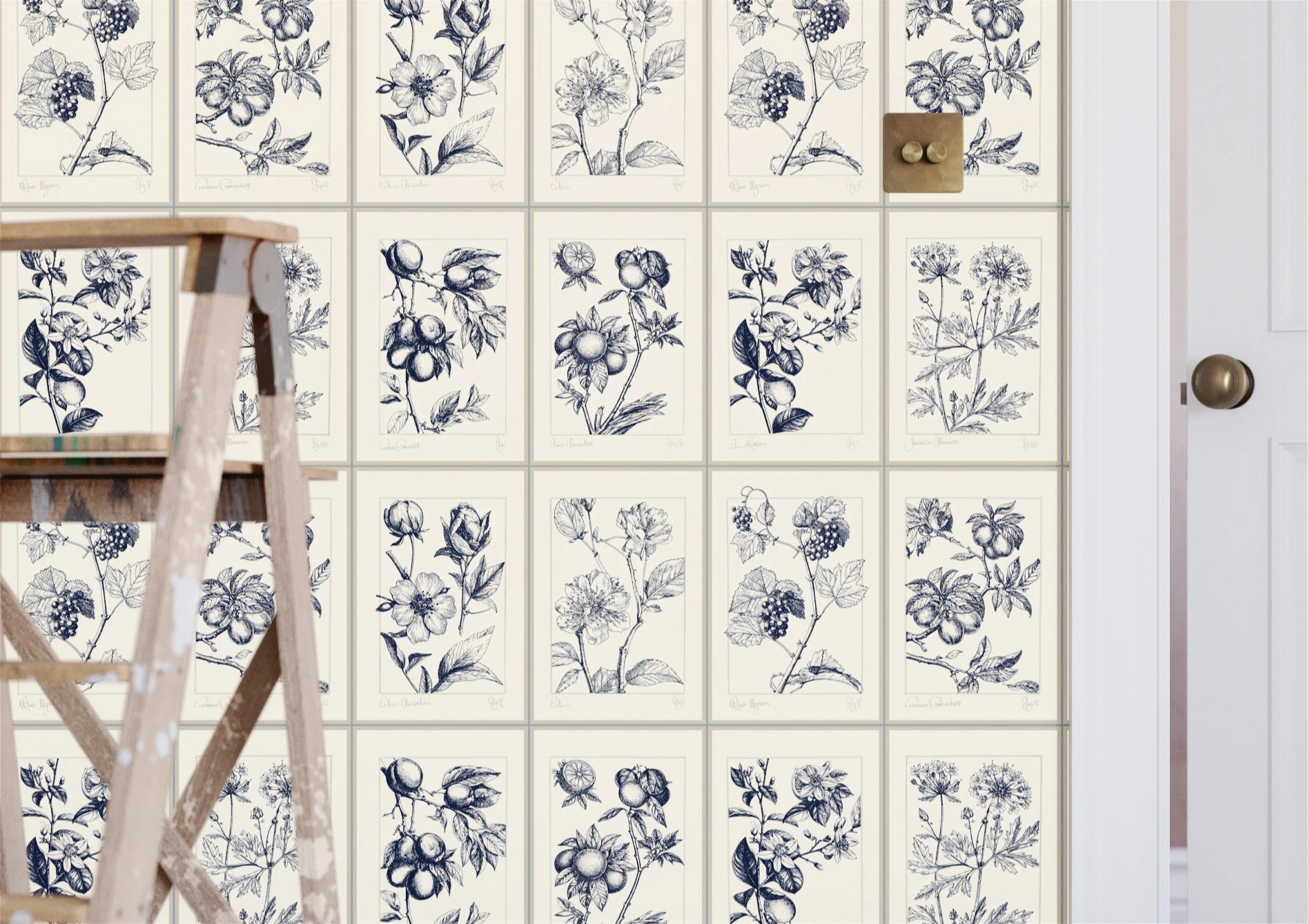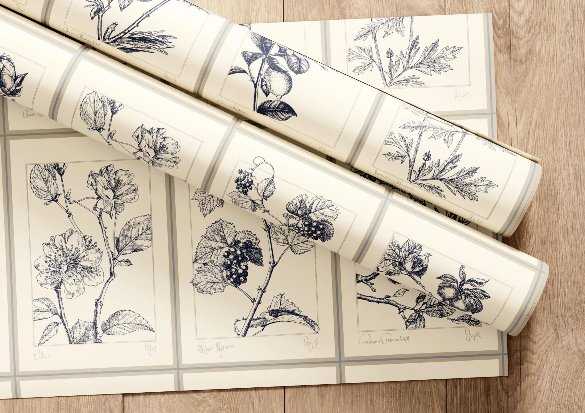"Sketchbook forms part of the Milton Collection, where botanical artistry is celebrated through finely drawn studies of fruit, foliage, and flowers. Arranged as framed vignettes, the design recalls the pages of a naturalist’s notebook, bringing detail and heritage charm to the wall.