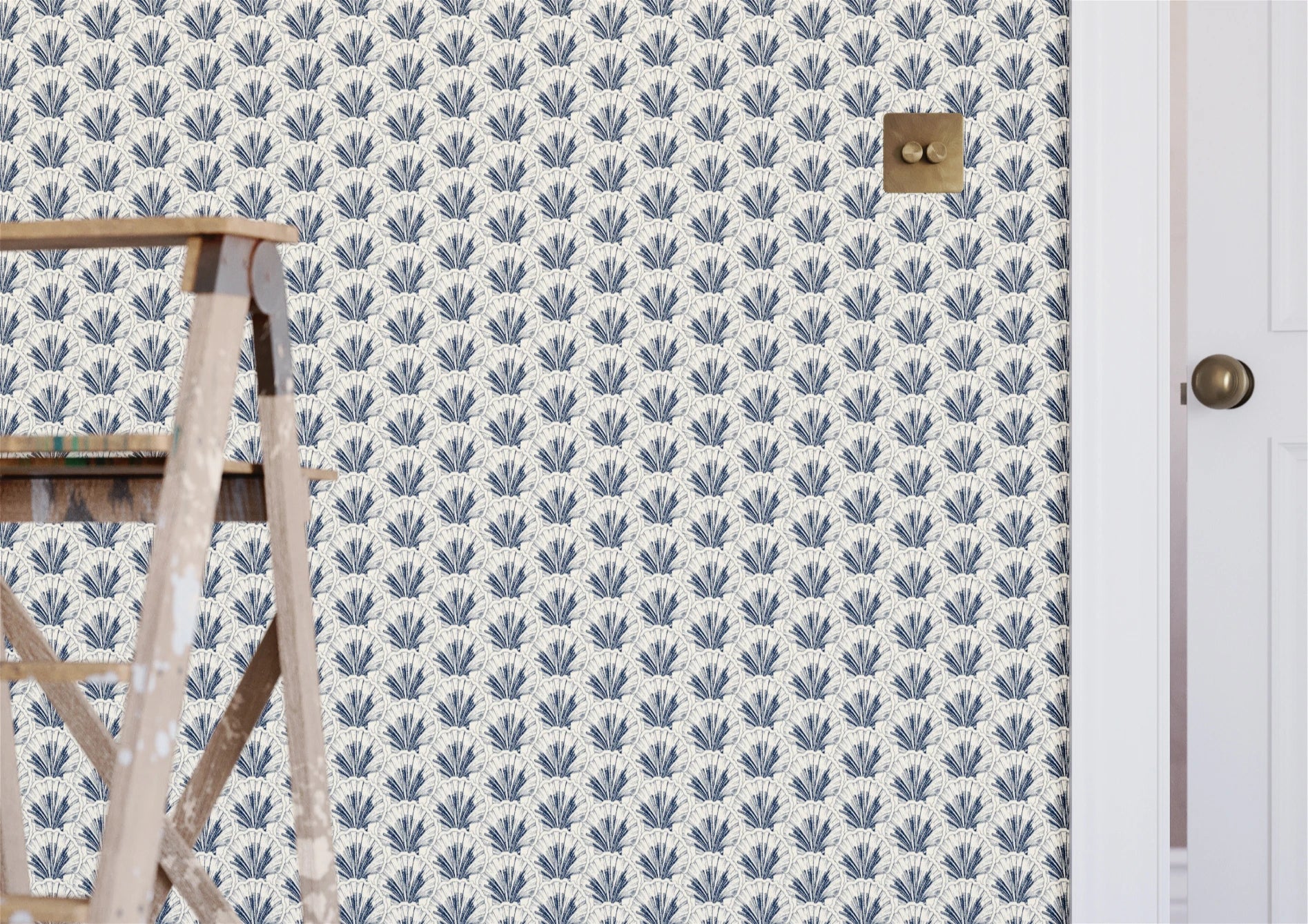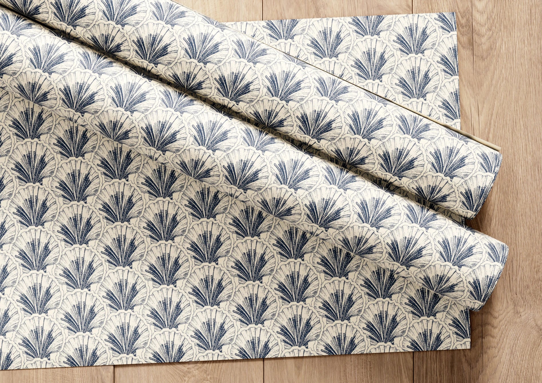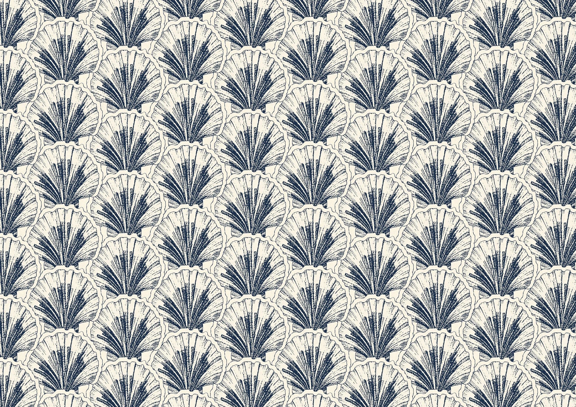 In the Hudds colourway, deep navy linework is set against a soft cream ground, giving the pattern a bold clarity while retaining elegance. The contrast highlights the intricacy of the shell form, making this palette striking yet timeless.