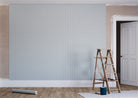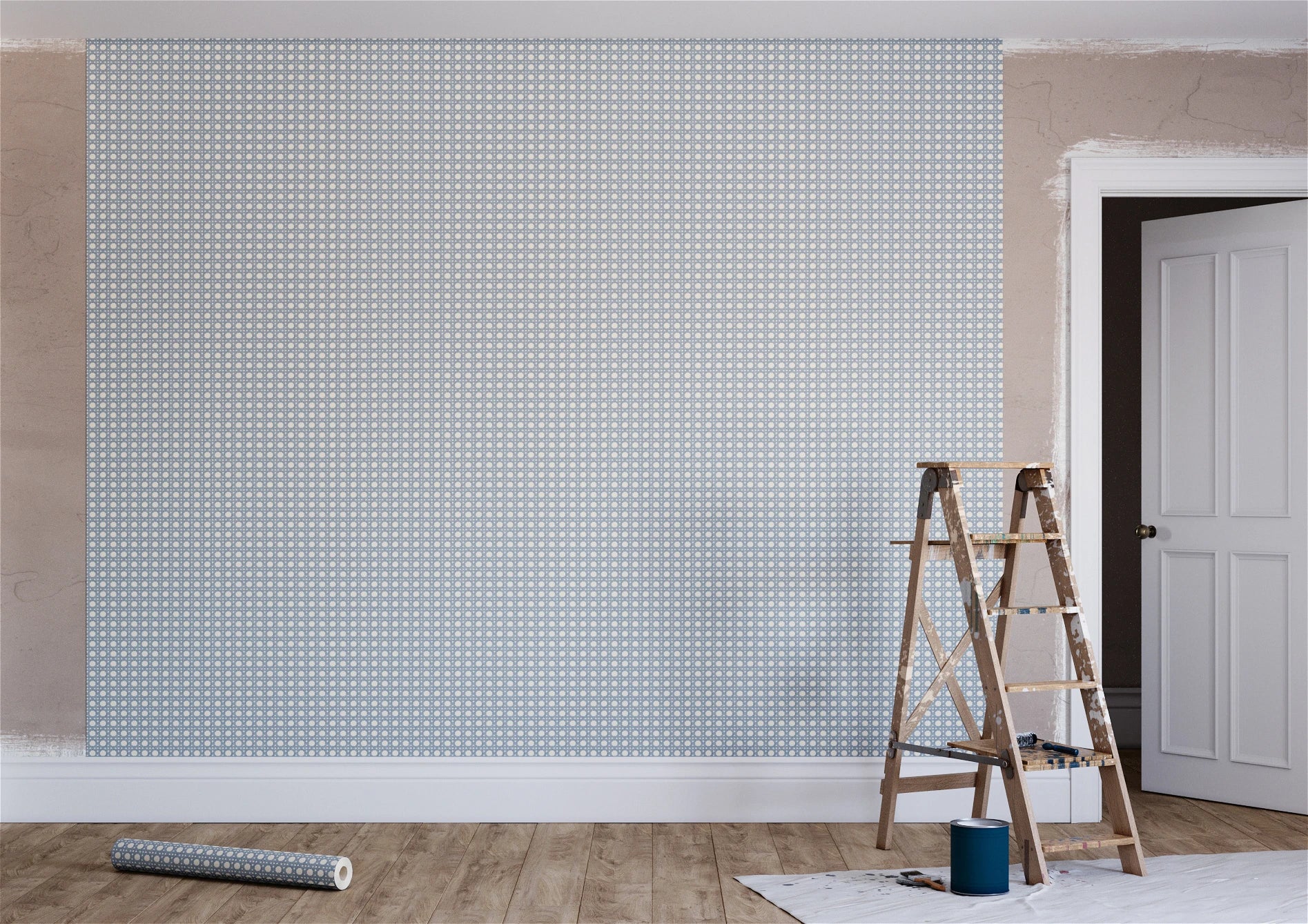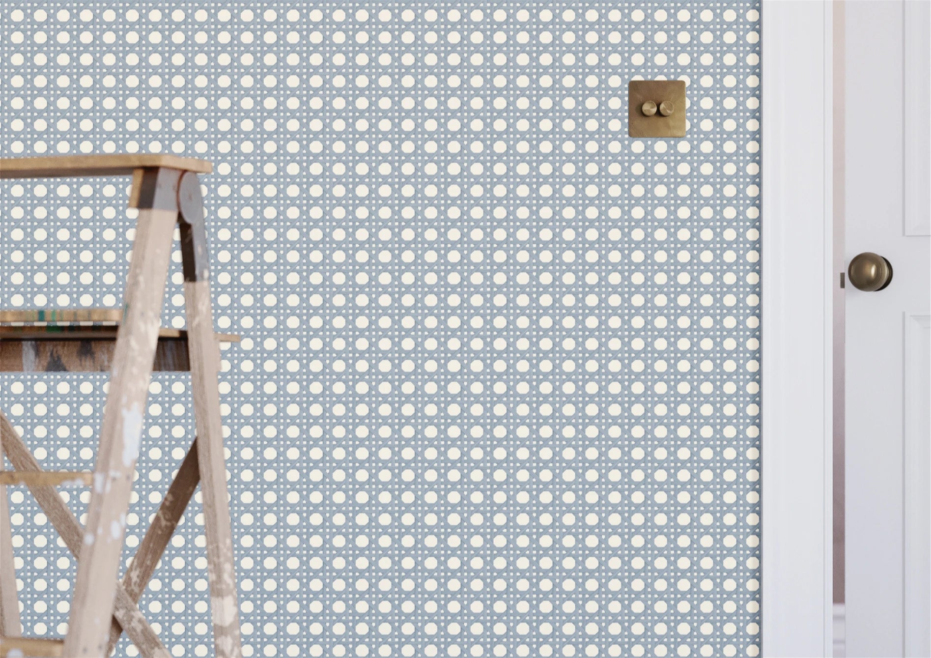In the Misted colourway, a soft blue-grey defines the interlaced trellis against a cream ground, creating a palette that is calming, refined, and quietly elegant. The gentle contrast allows the geometry to feel both architectural and airy."