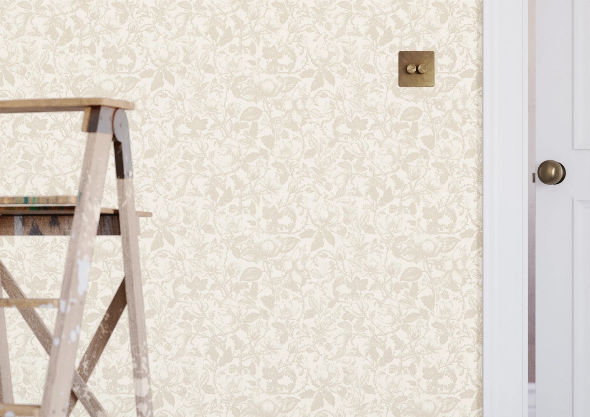 Maggies is an elegant wallpaper design featuring flowing botanical forms drawn with a soft, illustrative hand and arranged in a generous, all-over repeat. Climbing branches and open blossoms intertwine gently, creating a sense of movement without heaviness. Rendered in warm, stone-like tones against the Walls White ground, the palette feels calm, timeless, and quietly refined. Part of the Joyful Sense, Maggies brings softness, balance, and a relaxed sense of heritage to interiors that favour lightness and ease.
