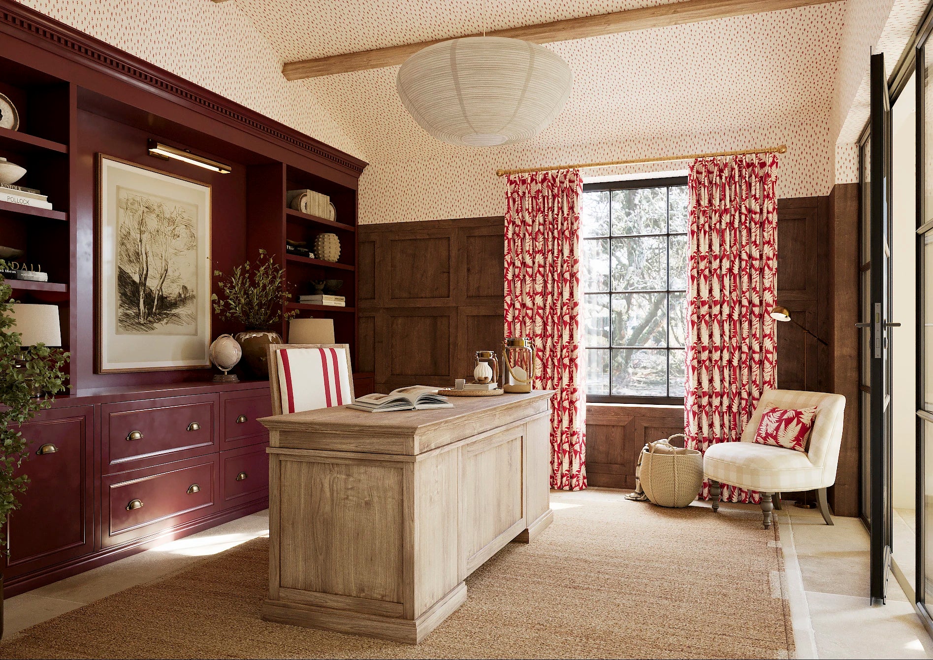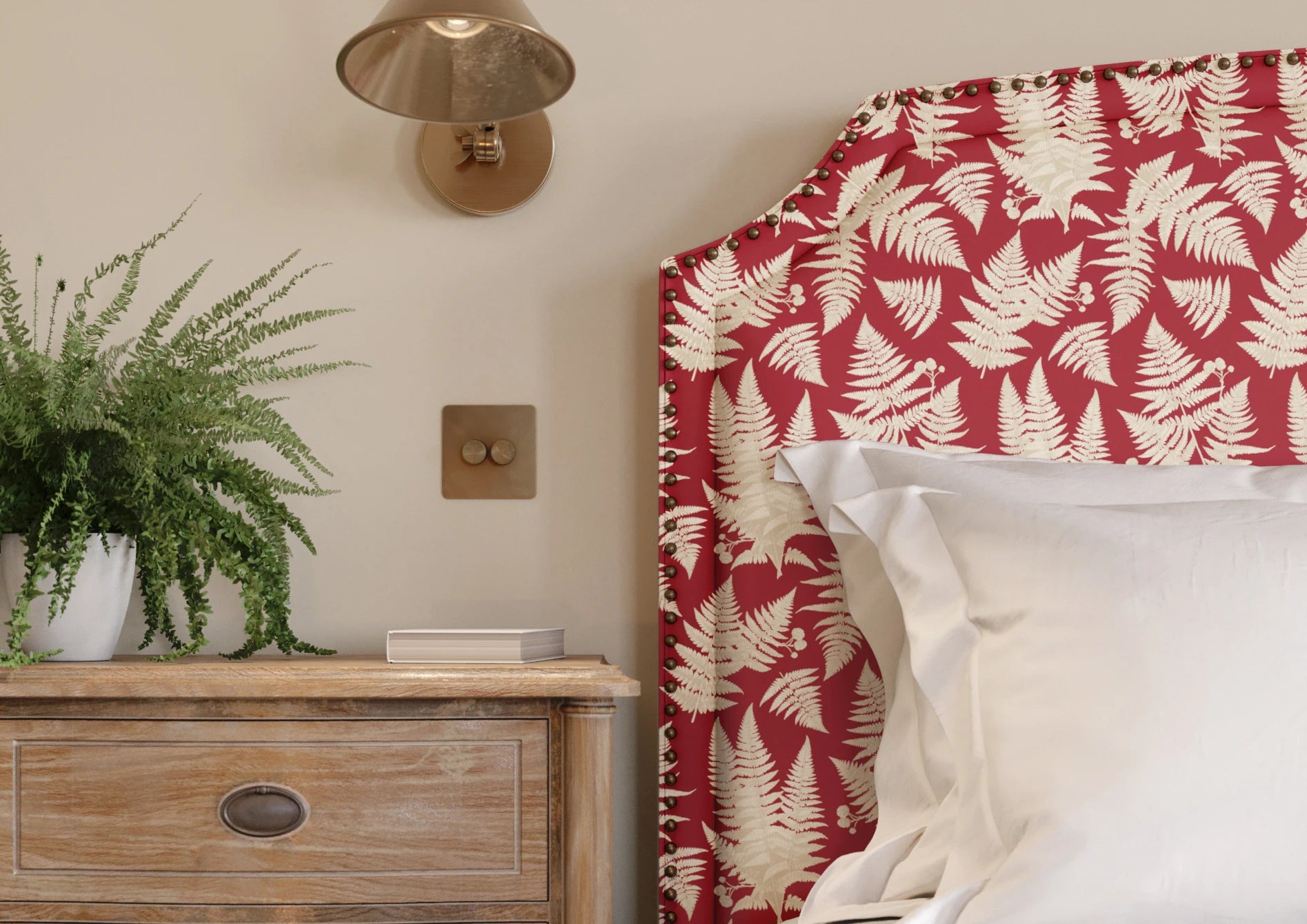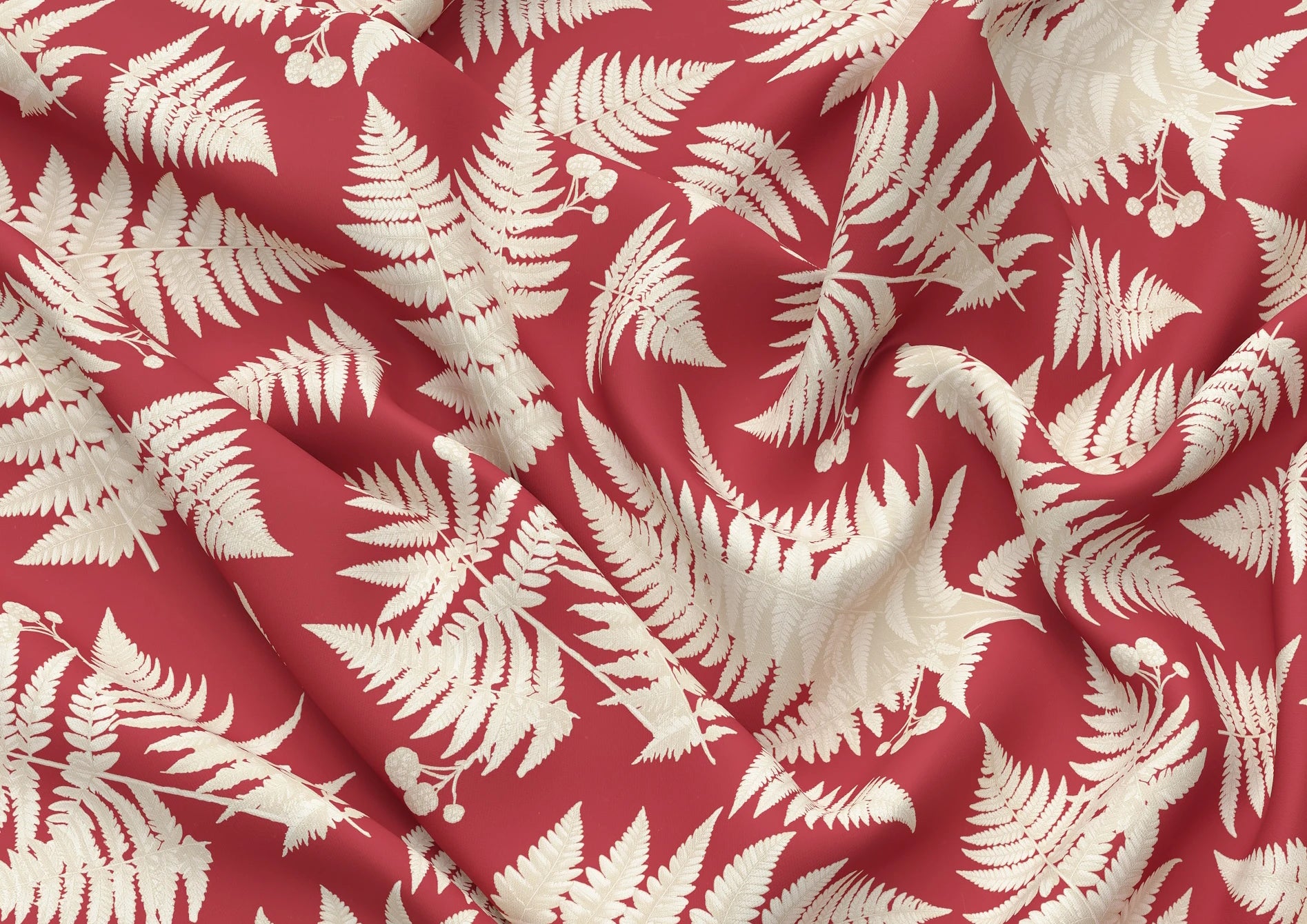 Fernwood from the Ambleside collection takes on a warmer, more expressive mood in the Pillbox colourway. The layered fern forms drift gently across the cloth, creating depth and movement while remaining calm and reassuring. Set against a soft, earthy red ground, the pale leaf tones feel lifted and comforting, bringing warmth without feeling heavy or formal. Part of the Joyful Sense, this palette offers a generous, welcoming way to introduce colour, working beautifully alongside both lighter and deeper designs across collections. A characterful choice for curtains, upholstery, or spaces that benefit from warmth, softness, and a sense of quiet confidence.