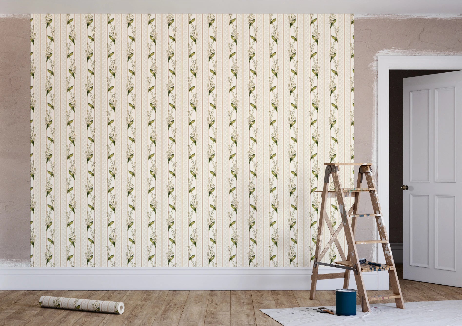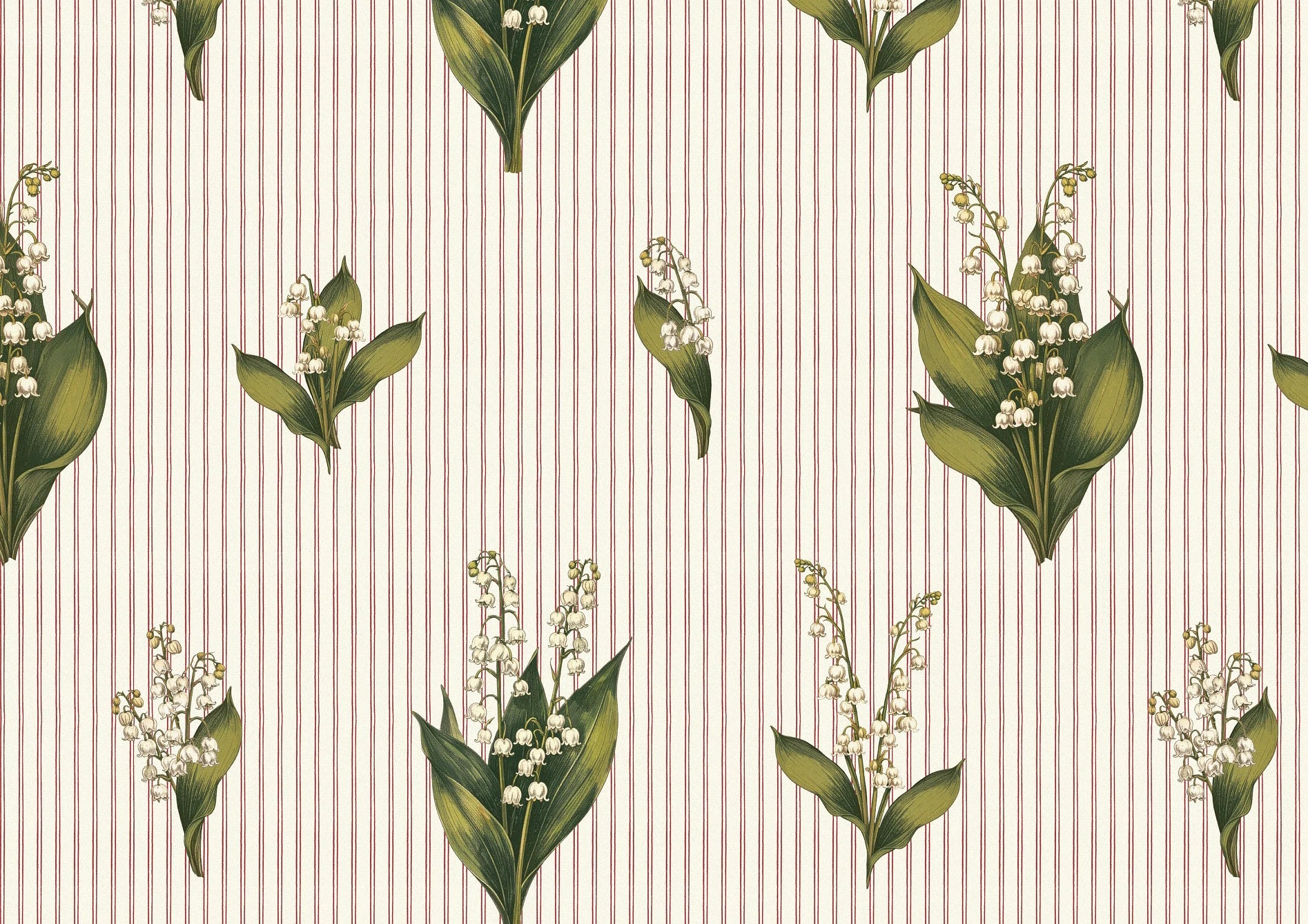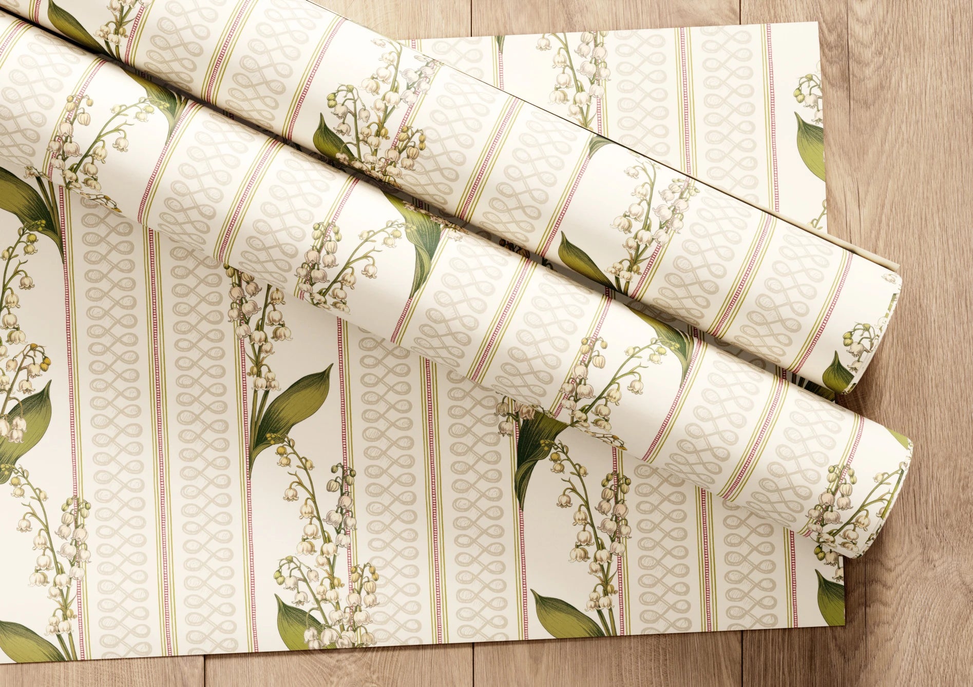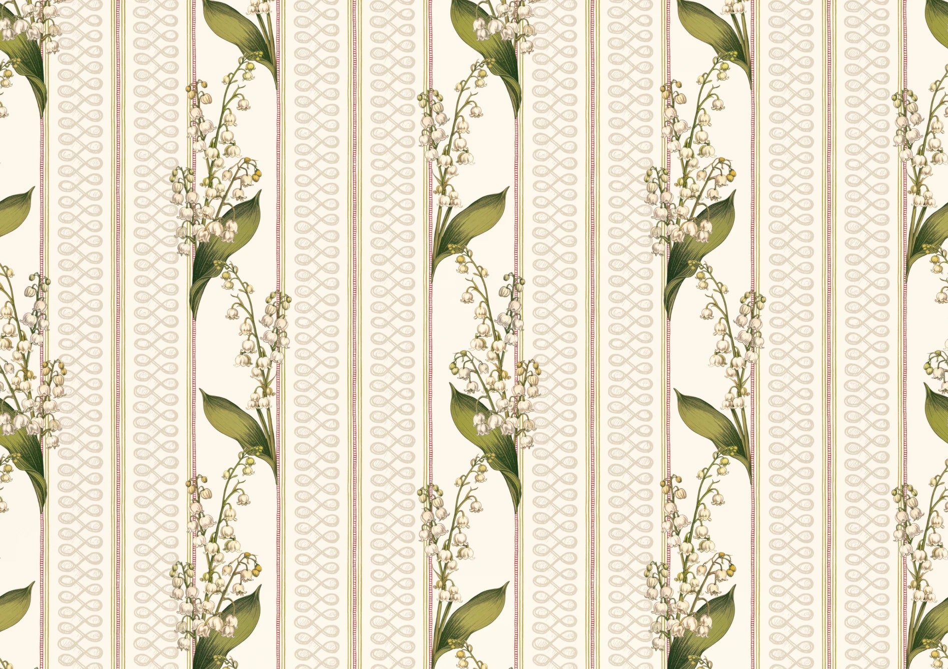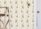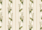 Janes is a graceful wallpaper design defined by vertical rhythm and delicate botanical detail. Flowing stems of bell-shaped flowers rise softly through the pattern, framed by fine decorative stripes in a muted Pillbox red that bring structure and gentle contrast. Fresh Chartreuse green foliage adds lift and clarity, set against the soft Walls White ground. Part of the Joyful Sense, Janes brings elegance, balance, and a calm, quietly decorative presence to interiors that favour softness and timeless charm.