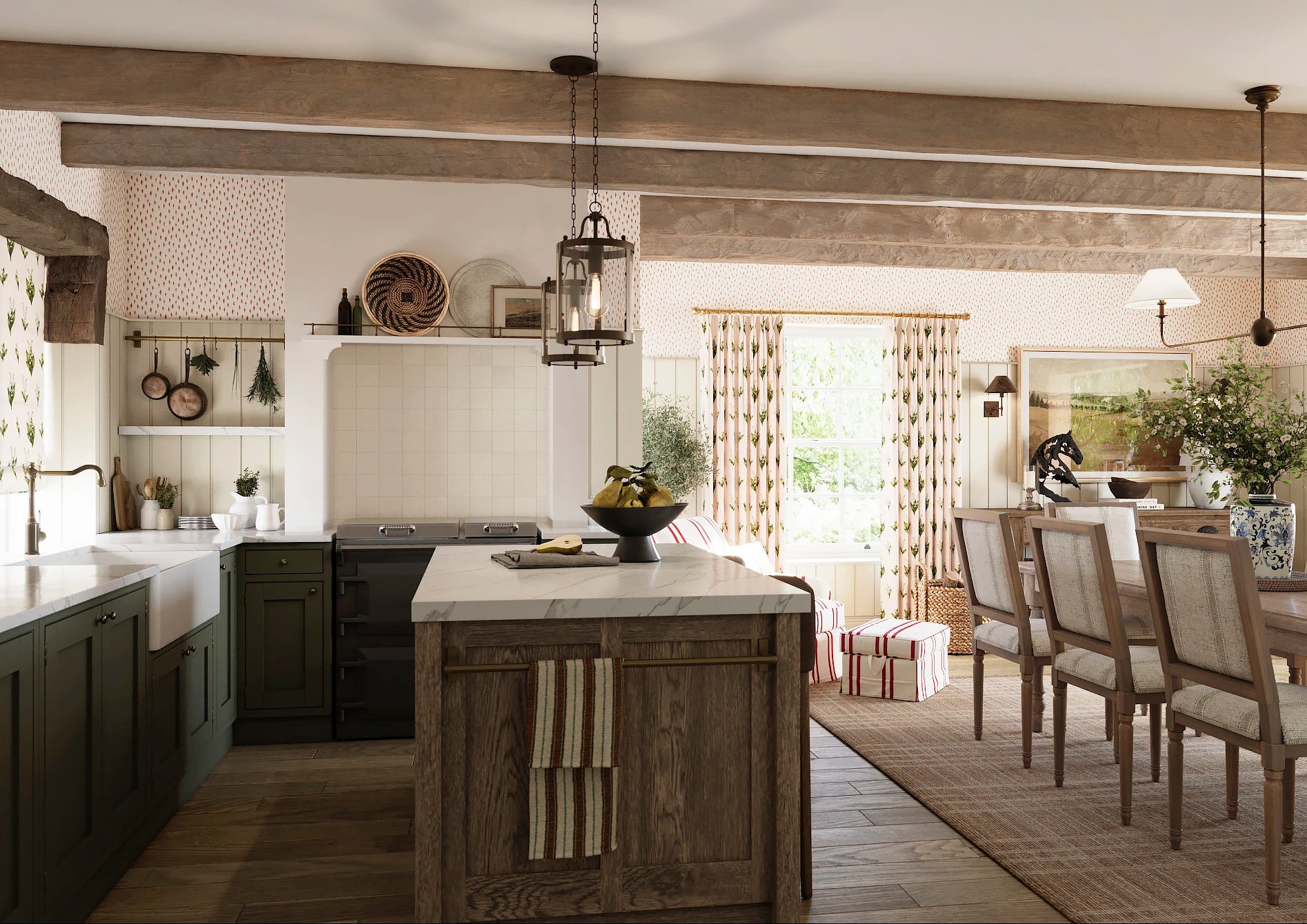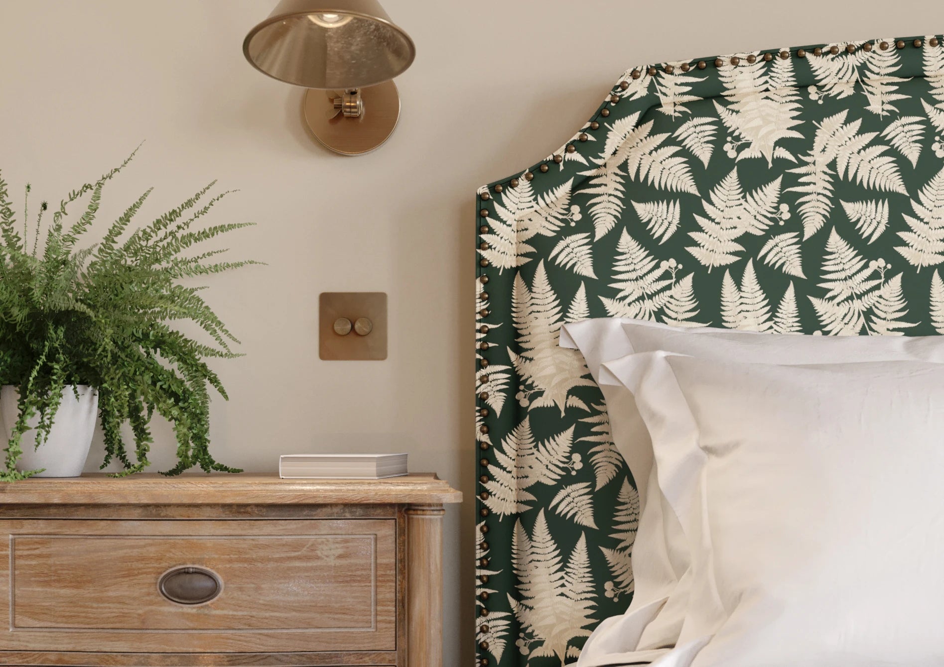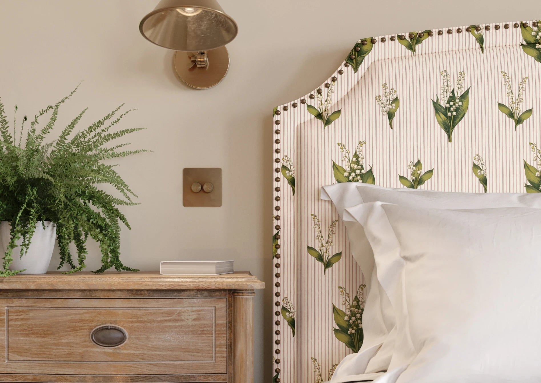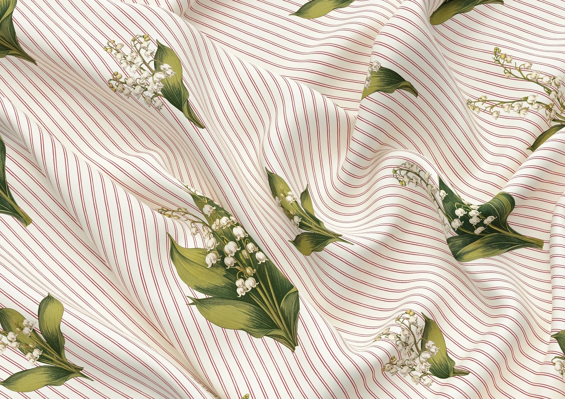 Janes is a graceful wallpaper design defined by vertical rhythm and delicate botanical detail. Flowing stems of bell-shaped flowers rise softly through the pattern, framed by fine decorative stripes in a muted Pillbox red that bring structure and gentle contrast. Fresh Chartreuse green foliage adds lift and clarity, set against the soft Walls White ground. Part of the Joyful Sense, Janes brings elegance, balance, and a calm, quietly decorative presence to interiors that favour softness and timeless charm.