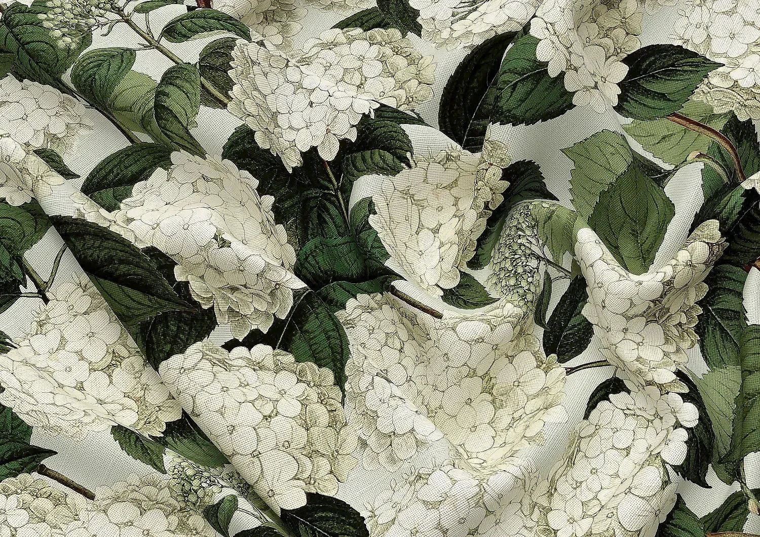 Annabelle in Hoves presents Abigail’s signature hydrangea design in its most serene, garden-inspired setting. Originating as a hand-drawing rooted in family memories, this print captures the lush fullness of Annabelle hydrangeas - a flower long associated with quiet abundance and cultivated charm. The Hoves colourway features creamy-white blooms and deep green foliage set against a soft sage-grey ground, creating a harmonious, gently nostalgic palette. It’s a timeless combination that suits both classic and contemporary interiors - ideal for curtains, loose covers or wall treatments where a sense of grace and light is called for. Part of the Calledon Collection, Annabelle in Hoves brings botanical beauty and personal story into refined British homes.