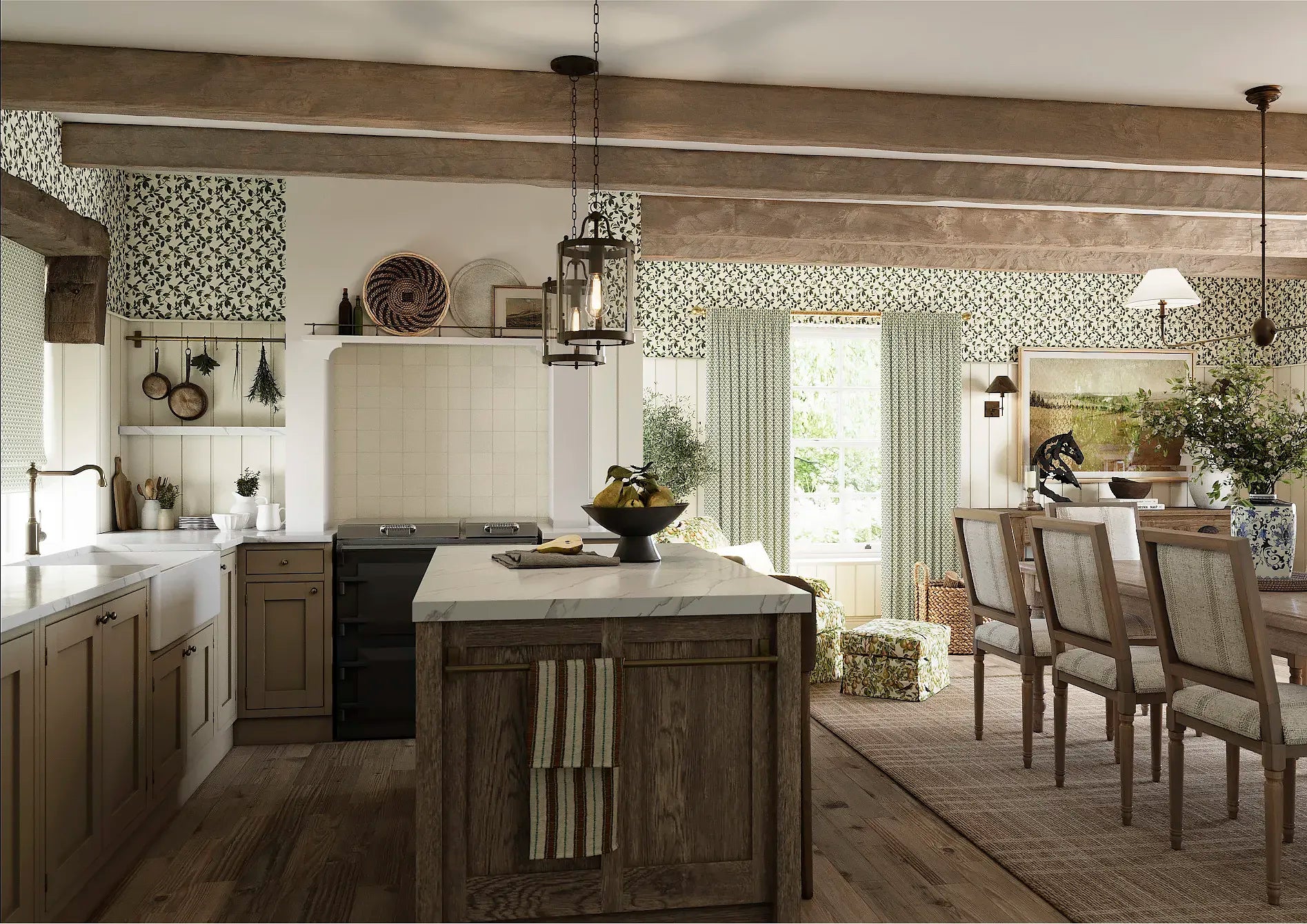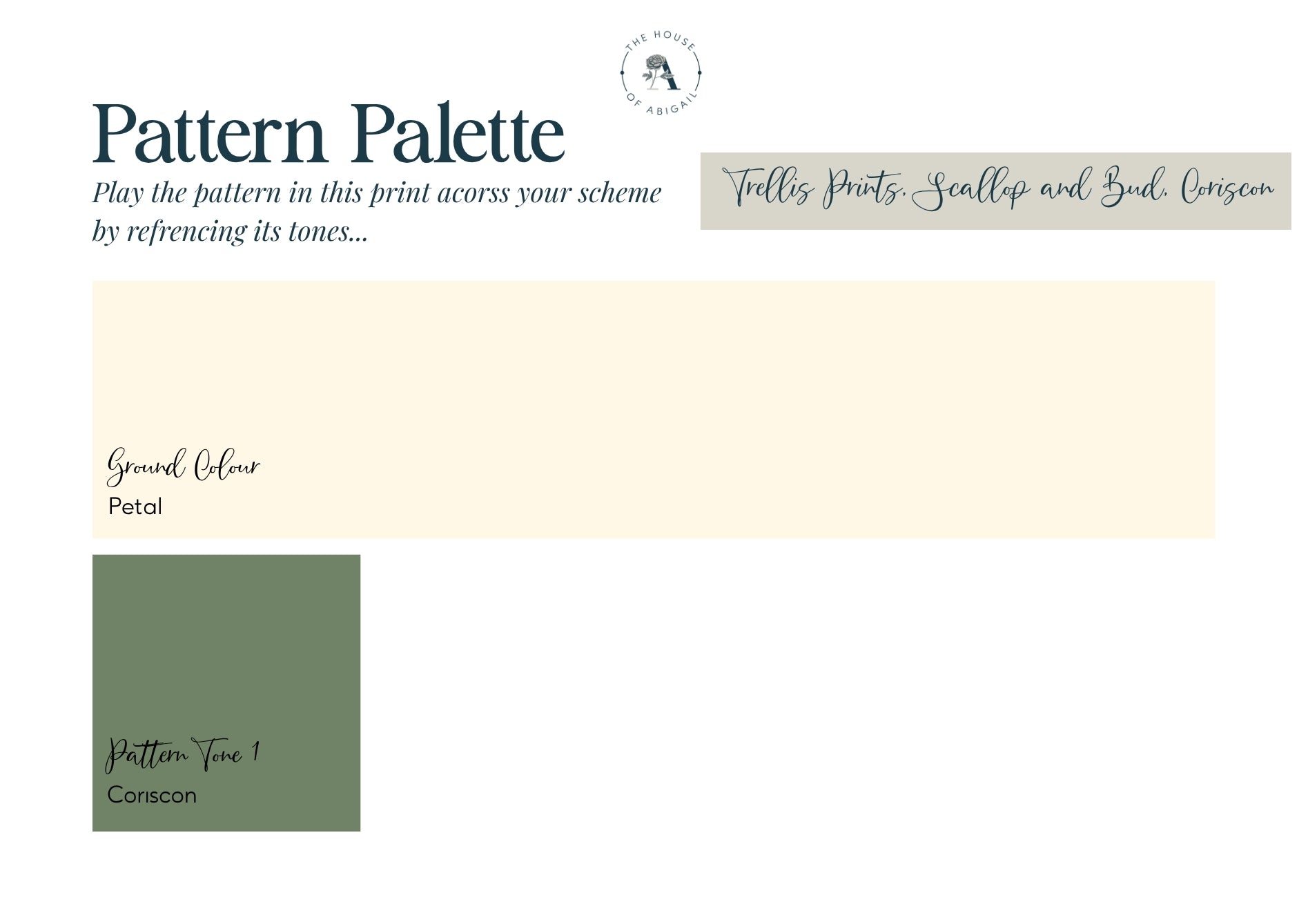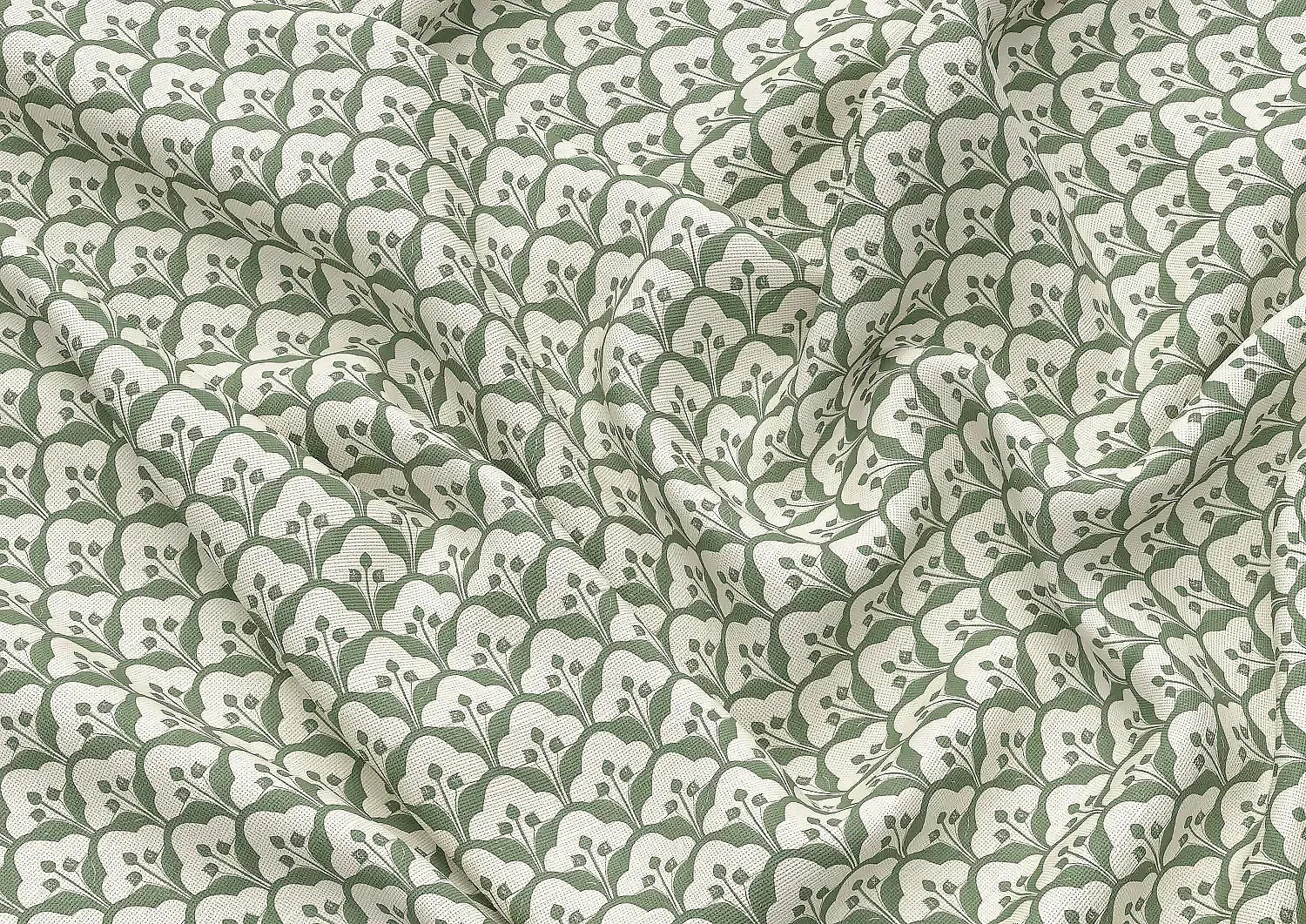 "Scallop and Bud, part of the Trellis Prints Collection, reimagines natural form through a repeating motif of stylised scalloped leaves with fine bud details. The effect is structured yet soft, bringing balance to interiors.