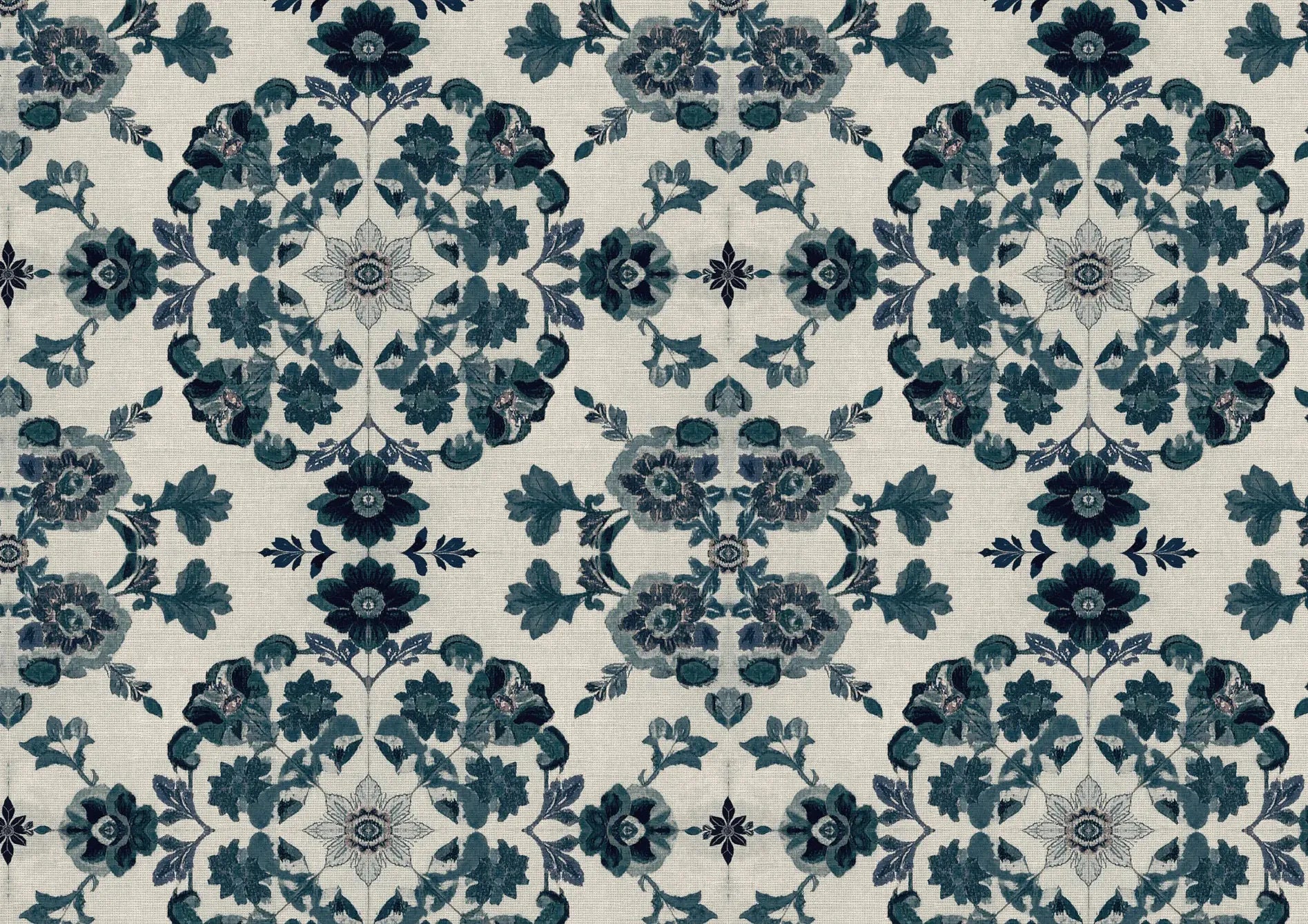 Nave is a devotional floral repeat drawn from the symmetry and symbolism of ecclesiastical embroidery. Its mirrored, medallion-style layout is inspired by altar cloths and chancel screens - detailed yet balanced, ornamental yet reverent. In the Hudds Blue colourway, the design is rendered in layered shades of inky navy, denim, and steel - giving the print a cool, tonal depth that feels architectural and moody. The effect is textural and immersive, echoing the richness of velvet altar hangings or stained-glass shadows cast on stone. As part of the Trinity Collection, Nave is designed to bring a sense of ceremony and refinement to interiors. Ideal for upholstery, wallpaper, and dramatic drapery, it bridges the historical and the contemporary - expressive but composed.