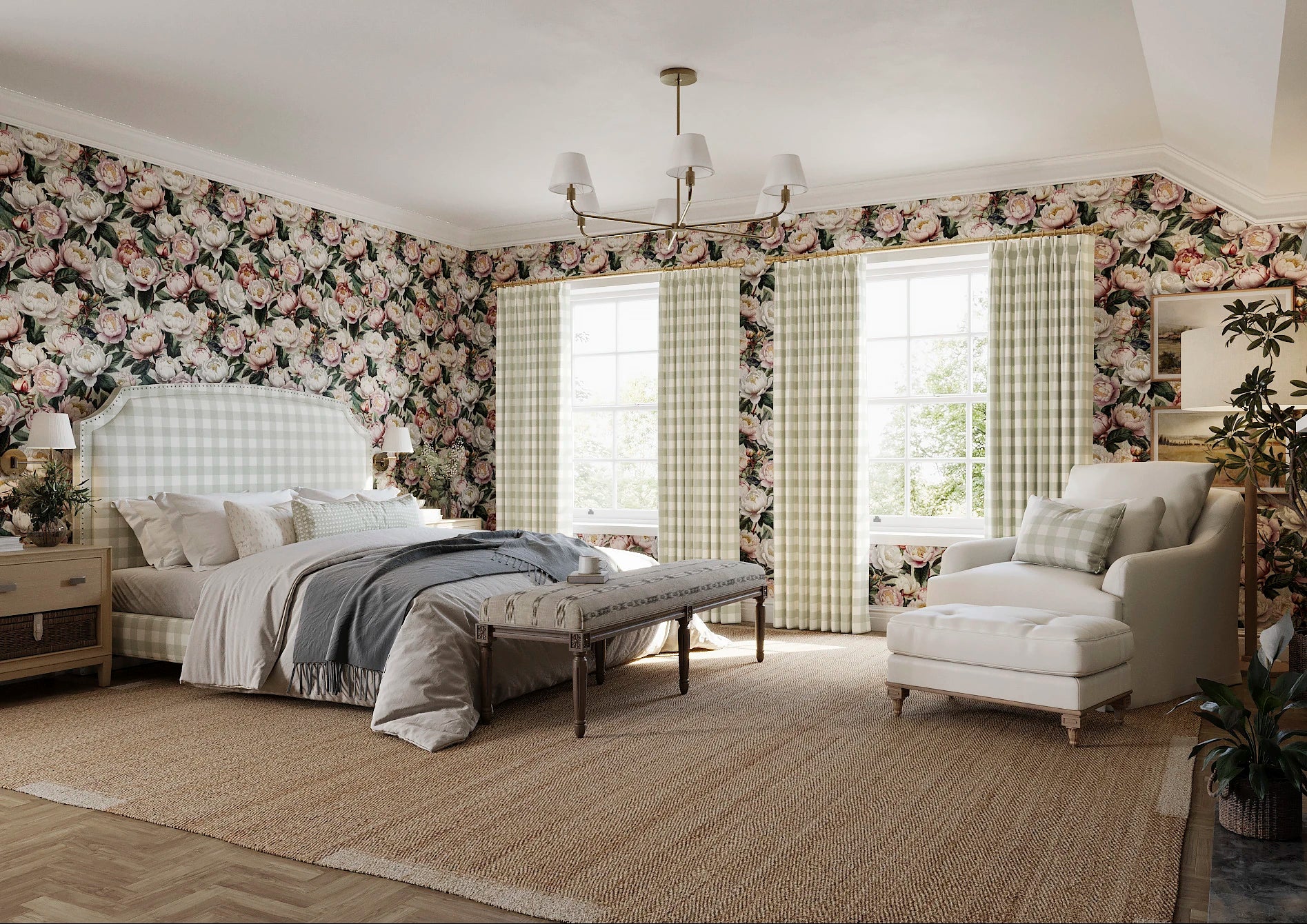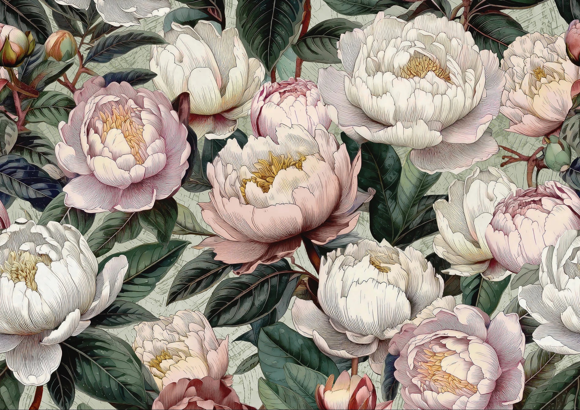 Peony Bloom is a bold, romantic wallpaper design celebrating botanical artistry. Luxuriously detailed, etched-style peonies in full bloom and bud evoke the beauty of classical florals with a rich, expressive twist. Set against a subtle Bud Green ground, layers of blush, ivory, and plum create a palette that feels dramatic yet harmonious.