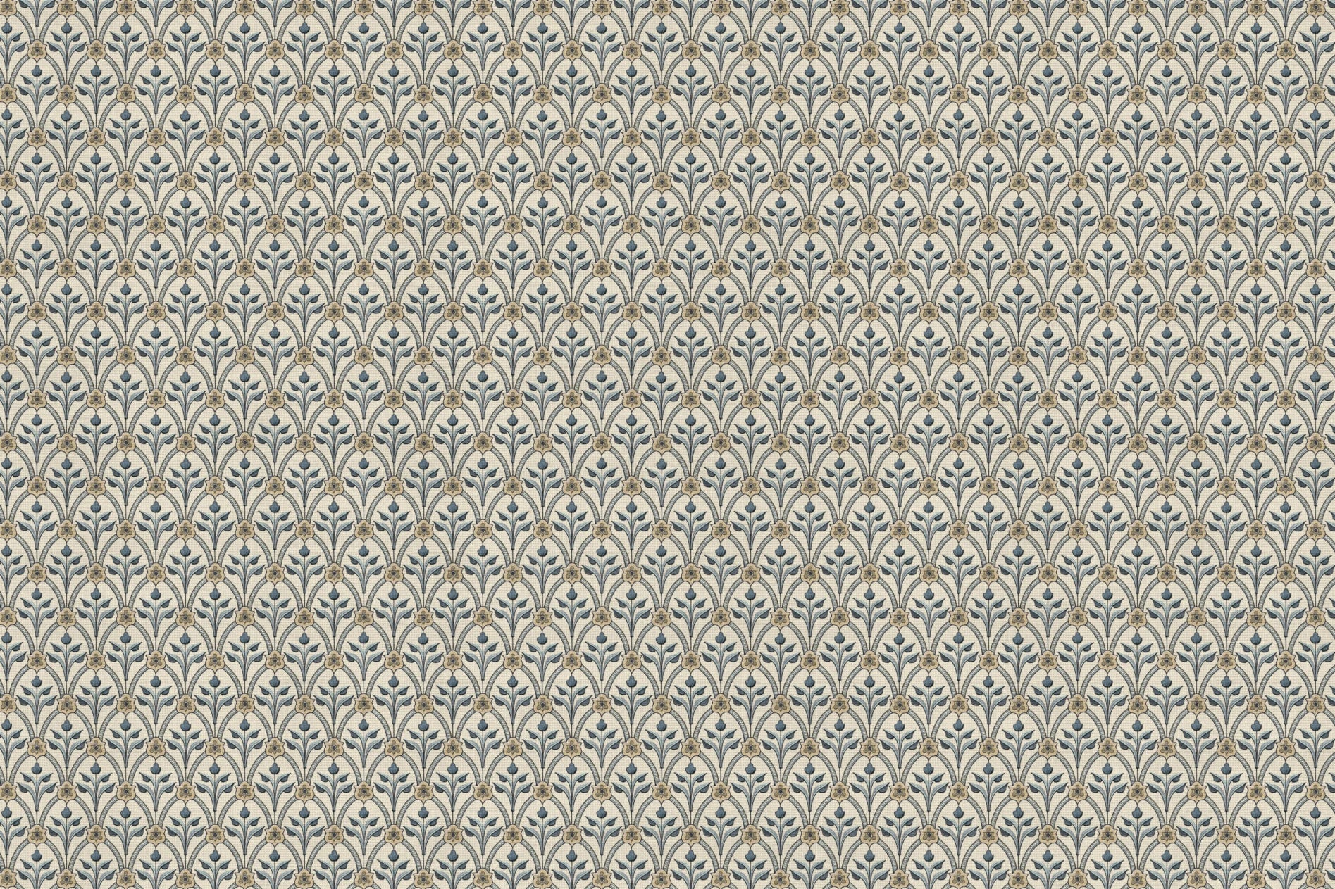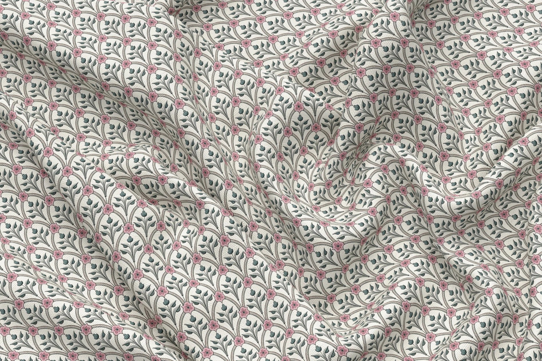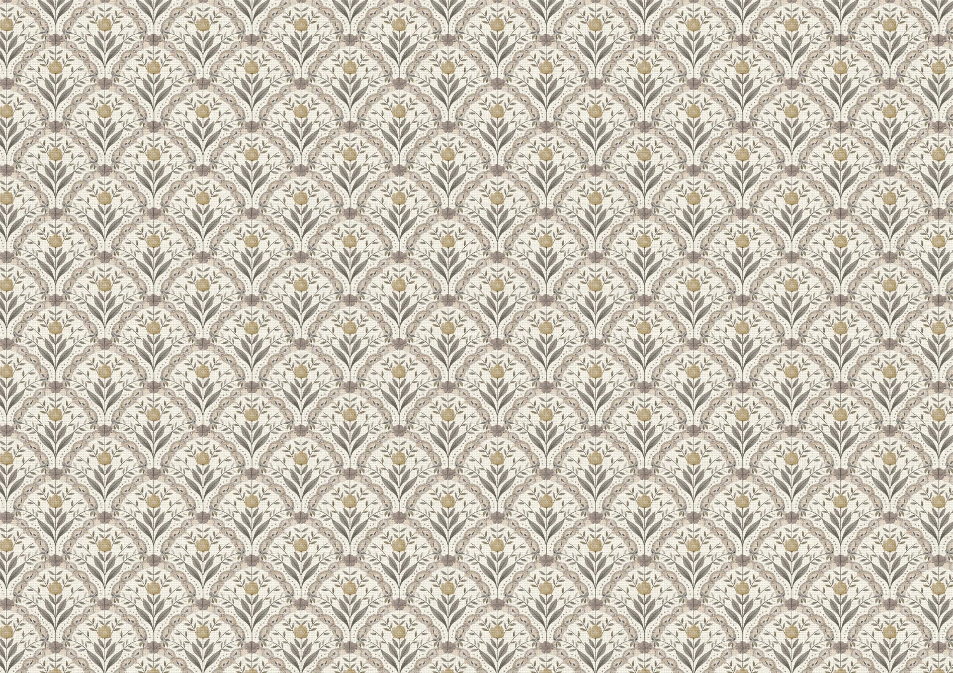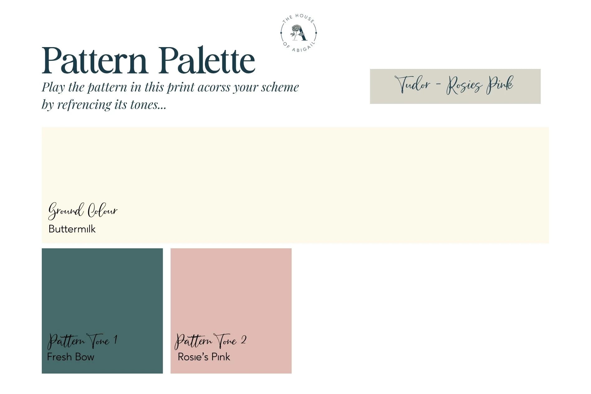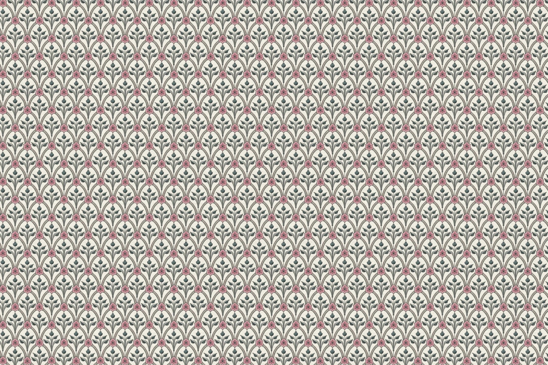 Bloom Spray offers a lighter, more ornamental take on traditional Arts & Crafts florals. Featuring stylised tulips in gentle Rosies Pink and accents of Barbing Green botanical sprays framed within arched motifs, this design brings together symmetry and softness with fine detail and decorative rhythm. The repeat is rich yet refined - ideal for adding a quieter touch of pattern to bold interior schemes.