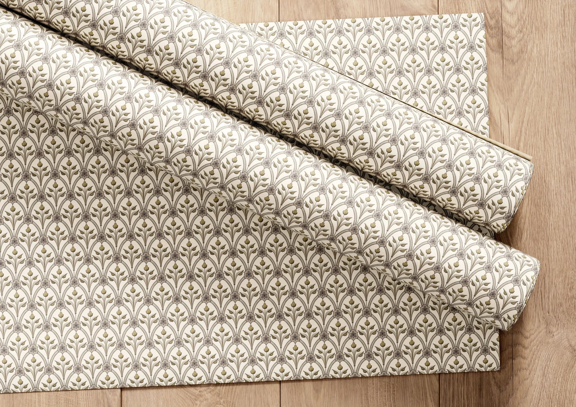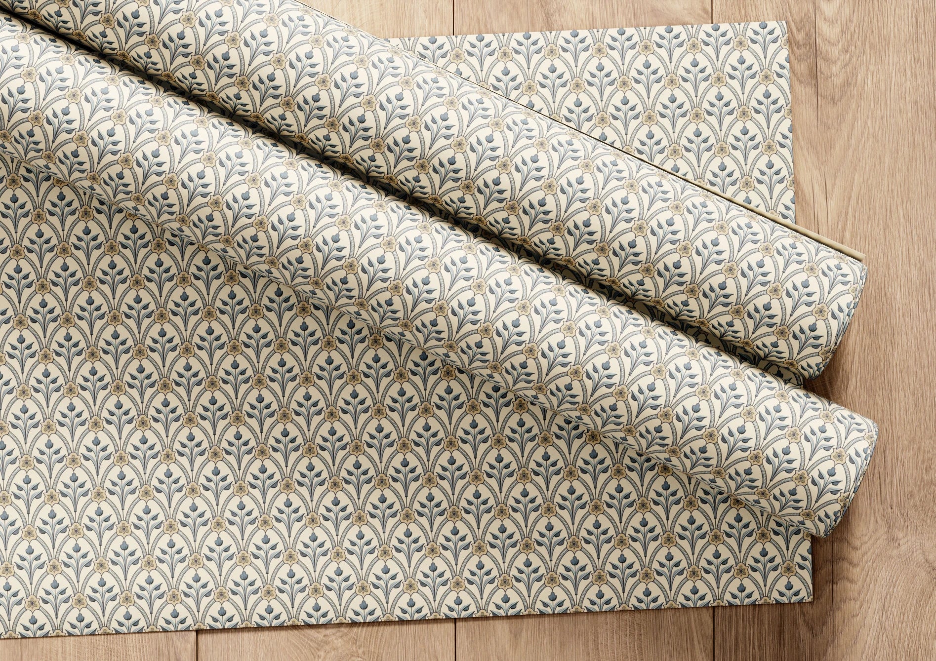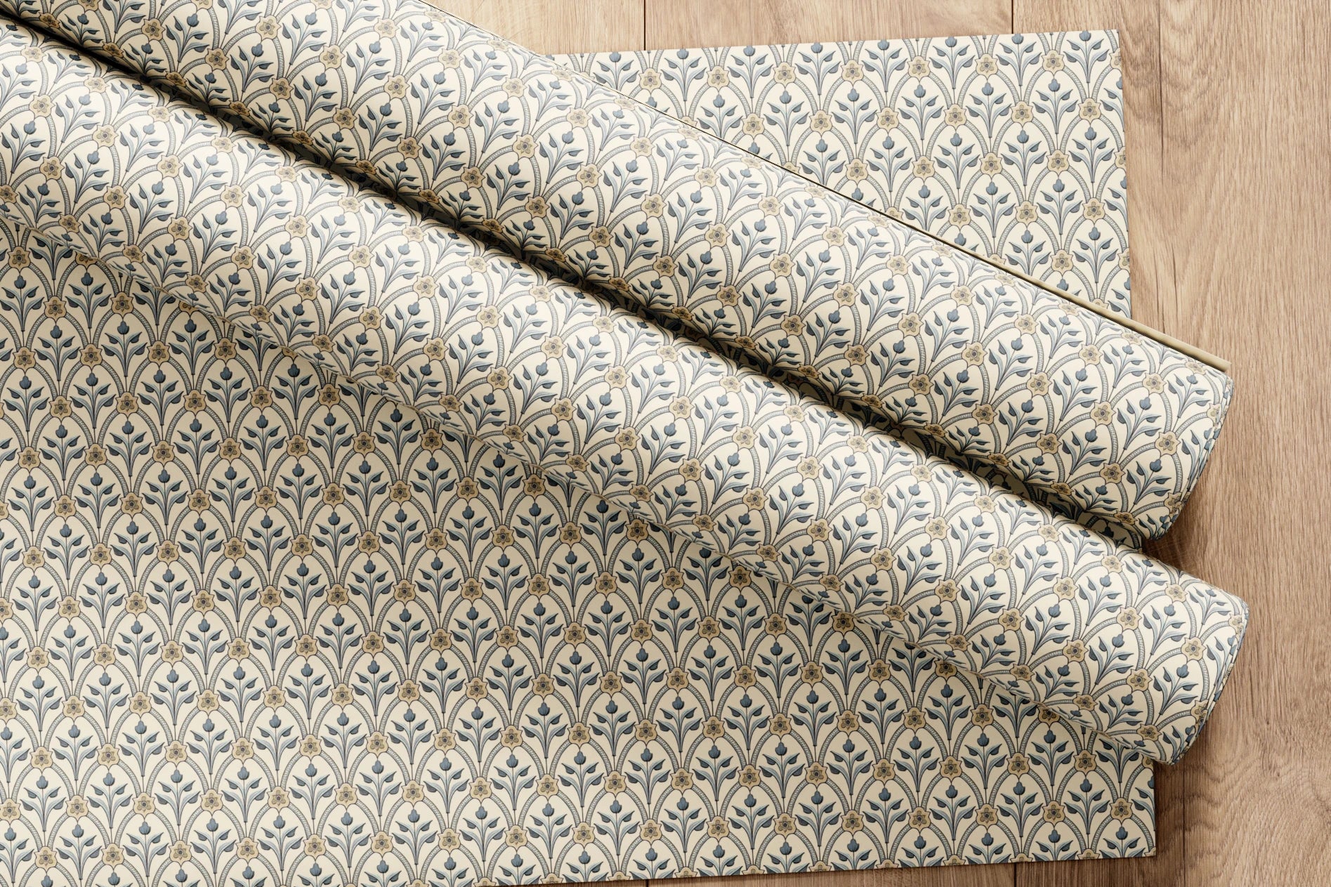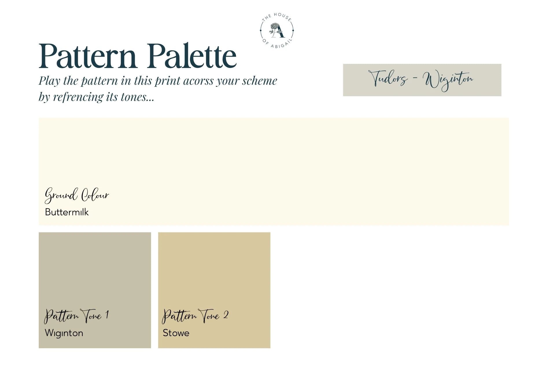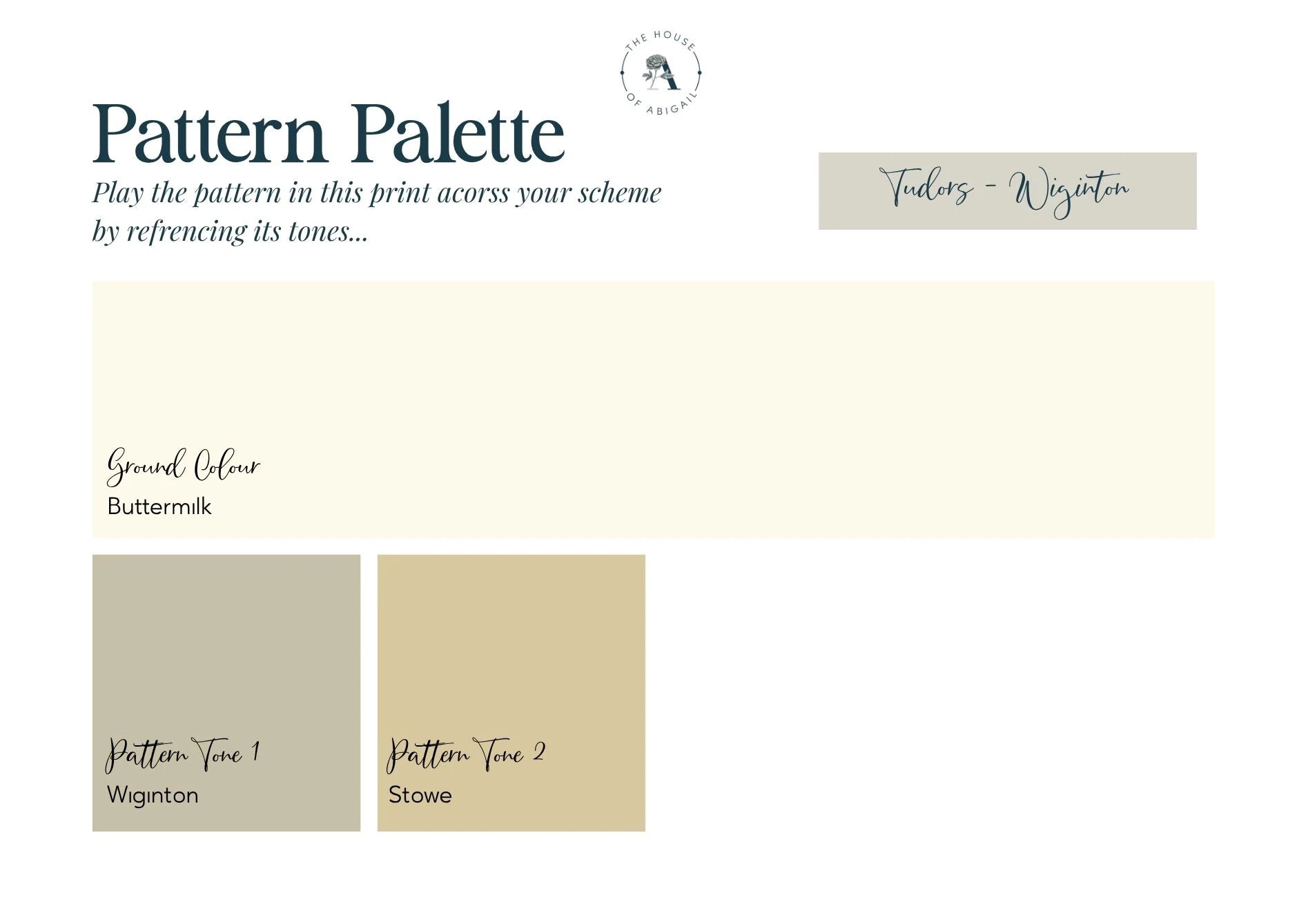 Tudors is a bold, structured motif inspired by medieval carvings, stained glass tracery, and decorative church stonework. Stylised florals rise in rhythmic, gothic arches, forming a strong vertical repeat that feels both ornamental and architectural. With a Rosies Pink floral, set against a Buttermilk ground, the design balances soft botanical detail with graphic precision and historic grandeur.