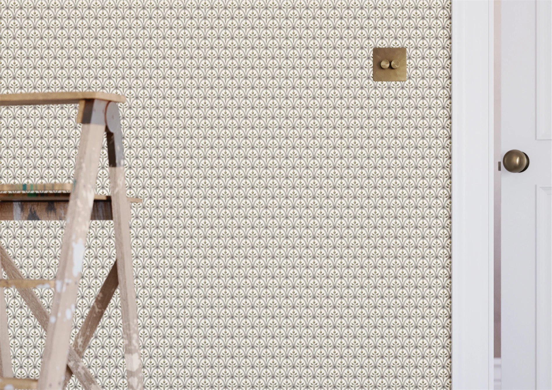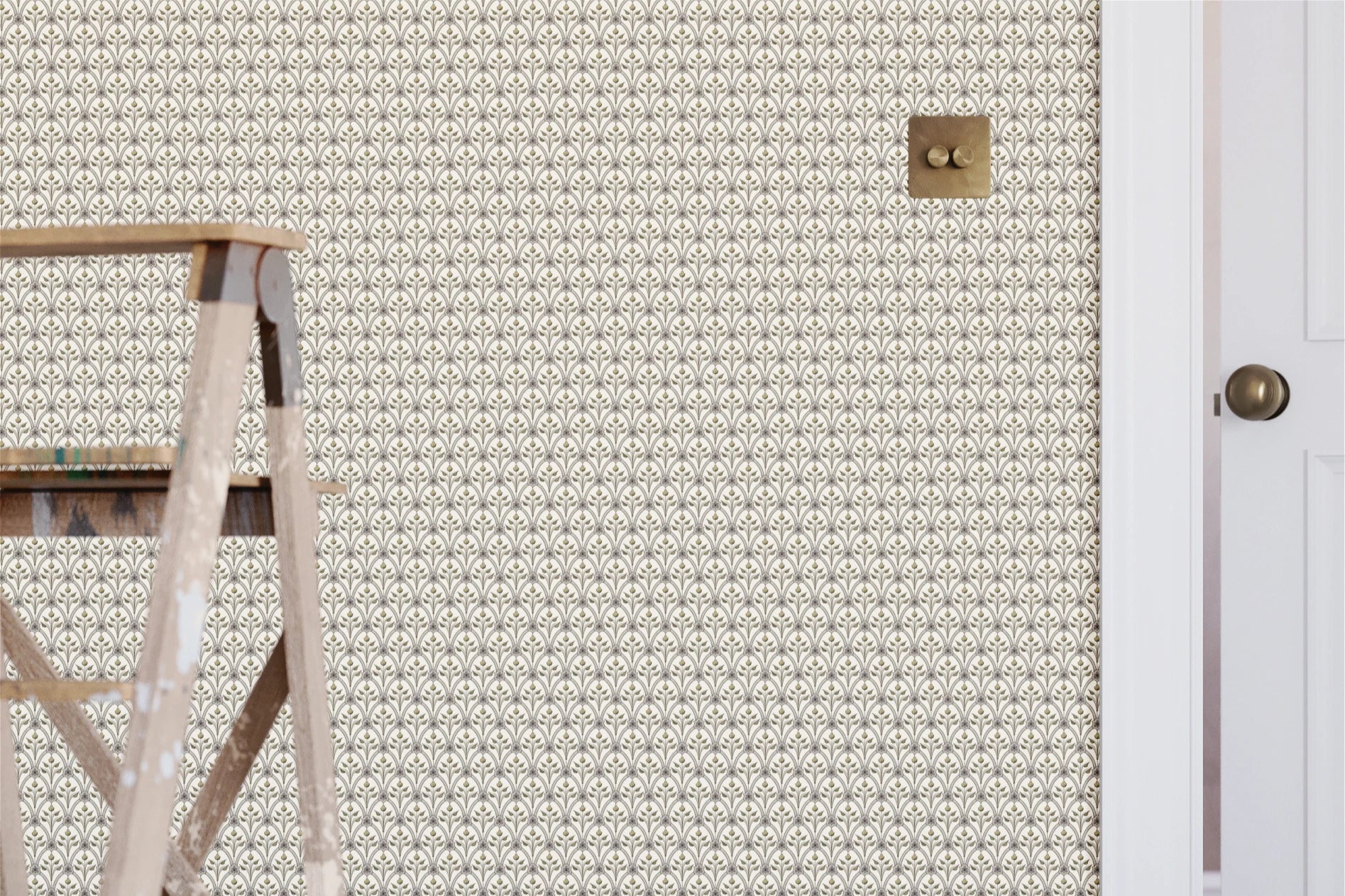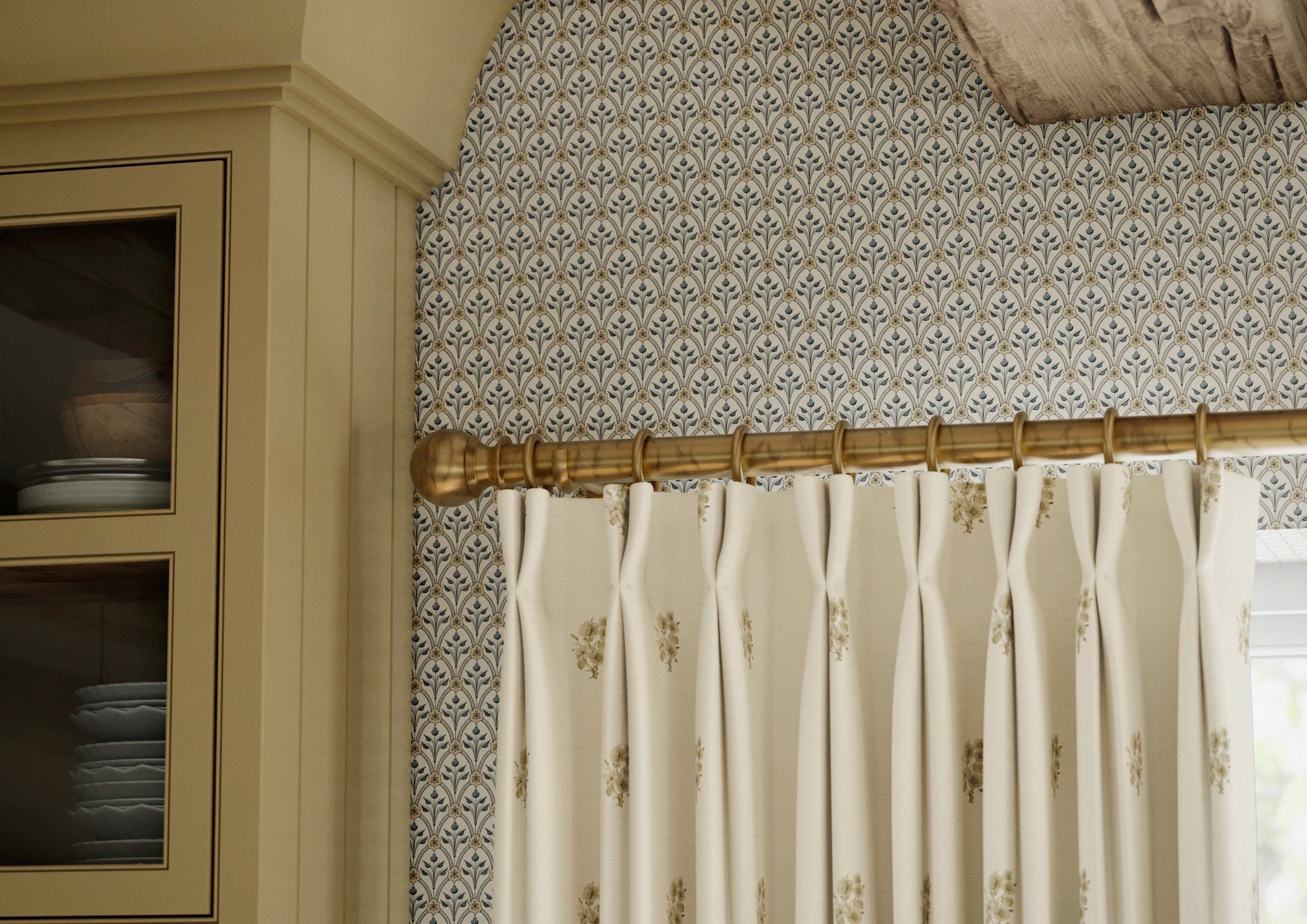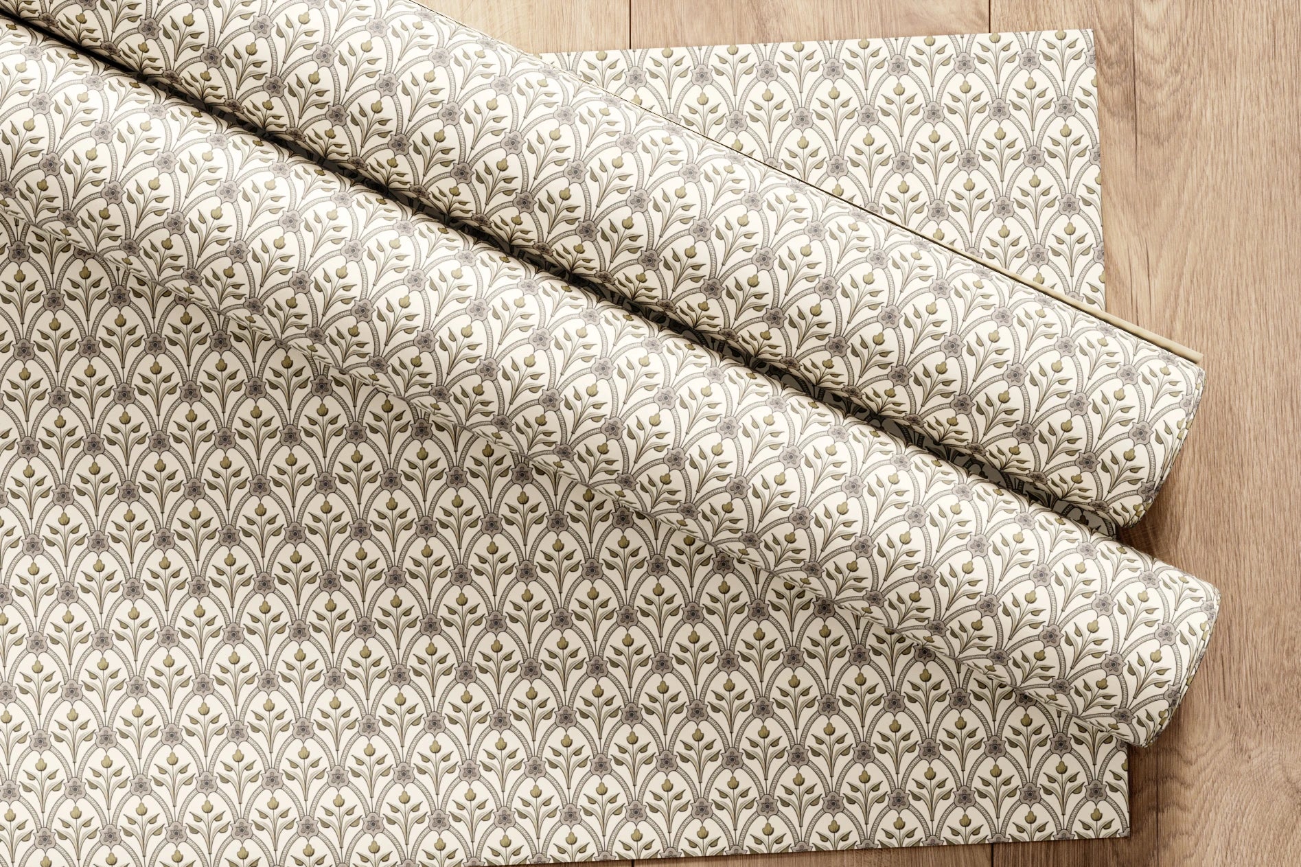 Tudors is a bold, structured motif inspired by medieval carvings, stained glass tracery, and decorative church stonework. Stylised florals rise in rhythmic, gothic arches, forming a strong vertical repeat that feels both ornamental and architectural. With a Rosies Pink floral, set against a Buttermilk ground, the design balances soft botanical detail with graphic precision and historic grandeur.
