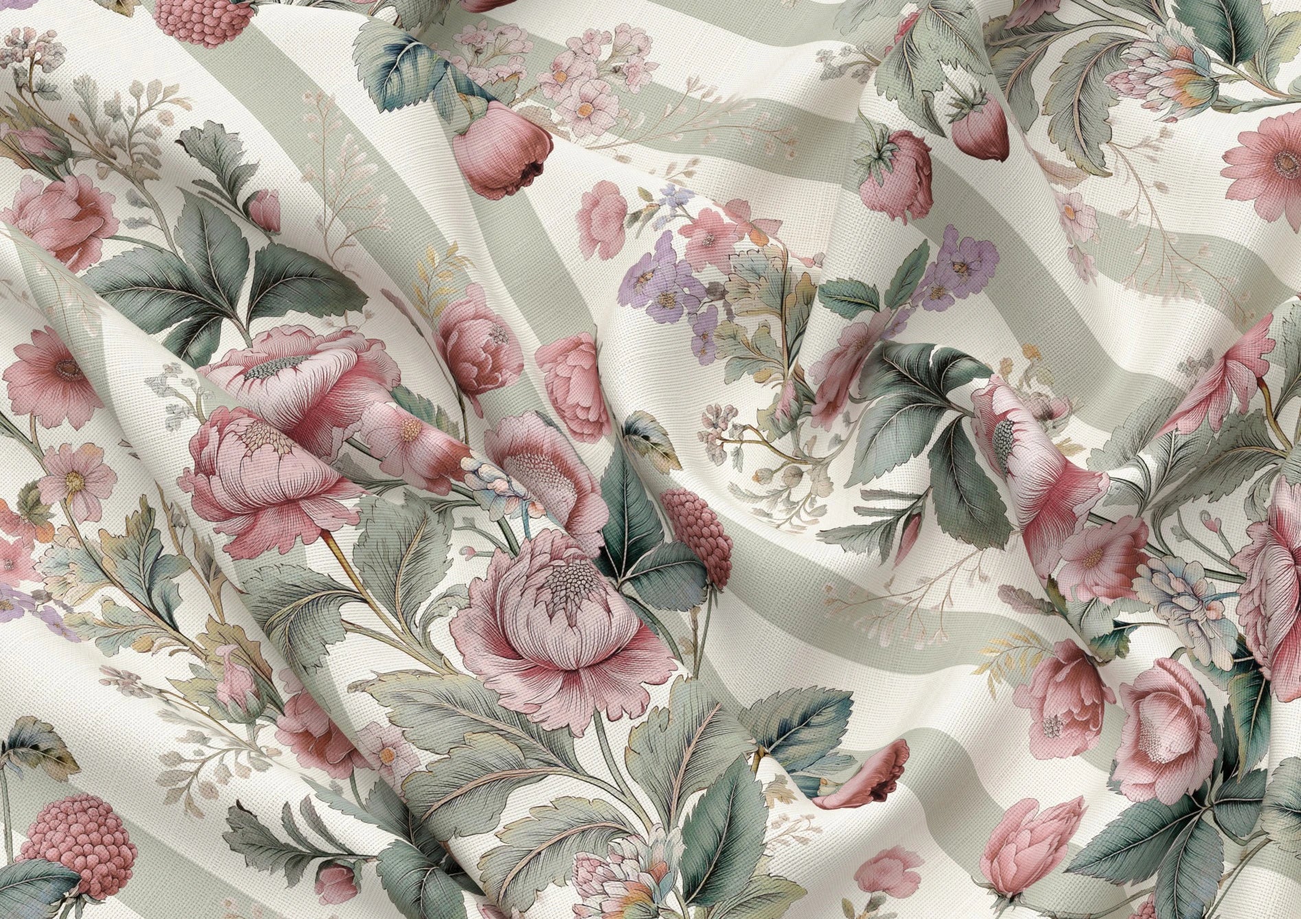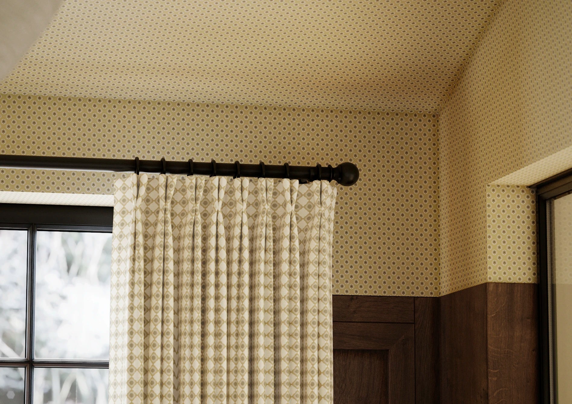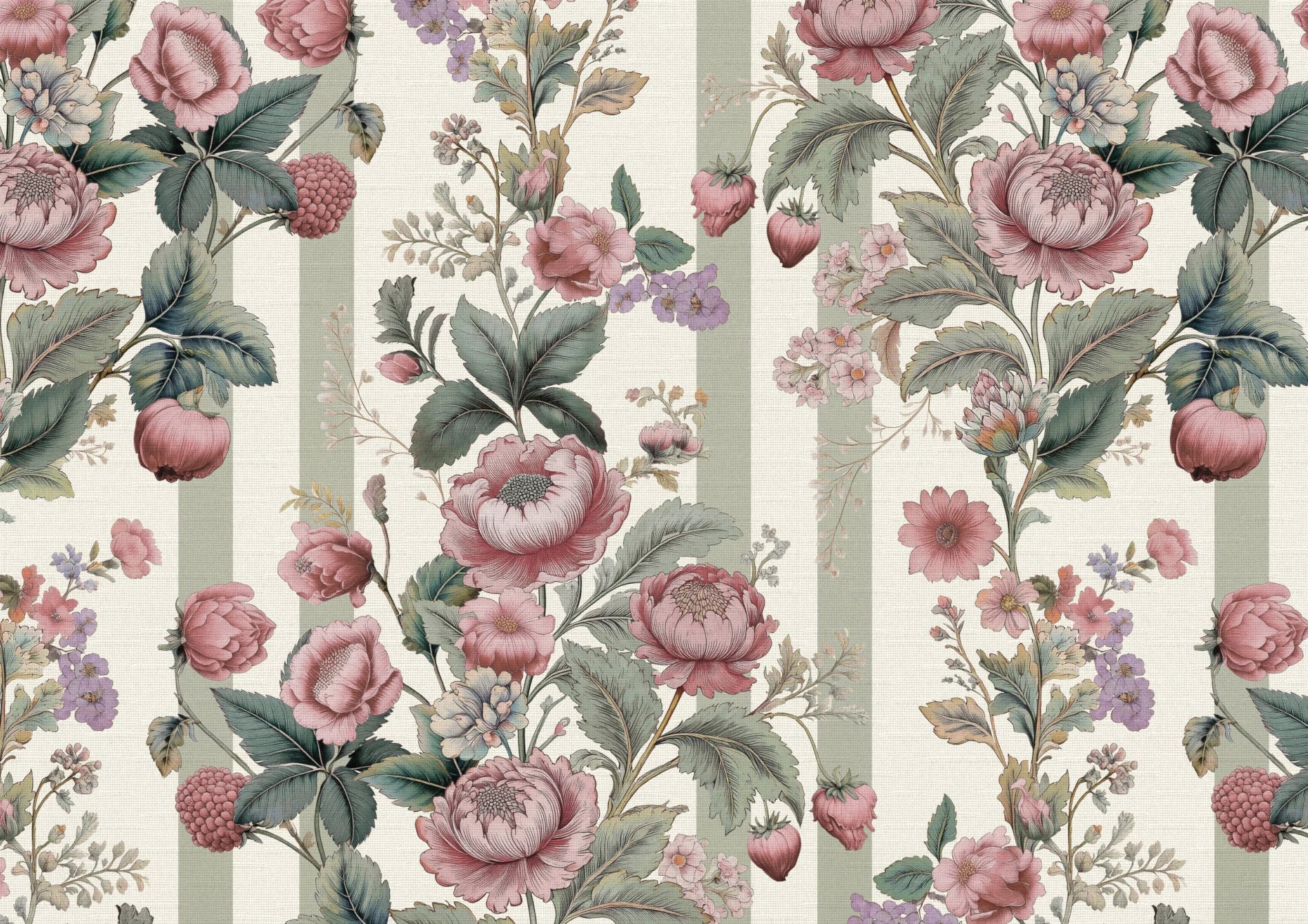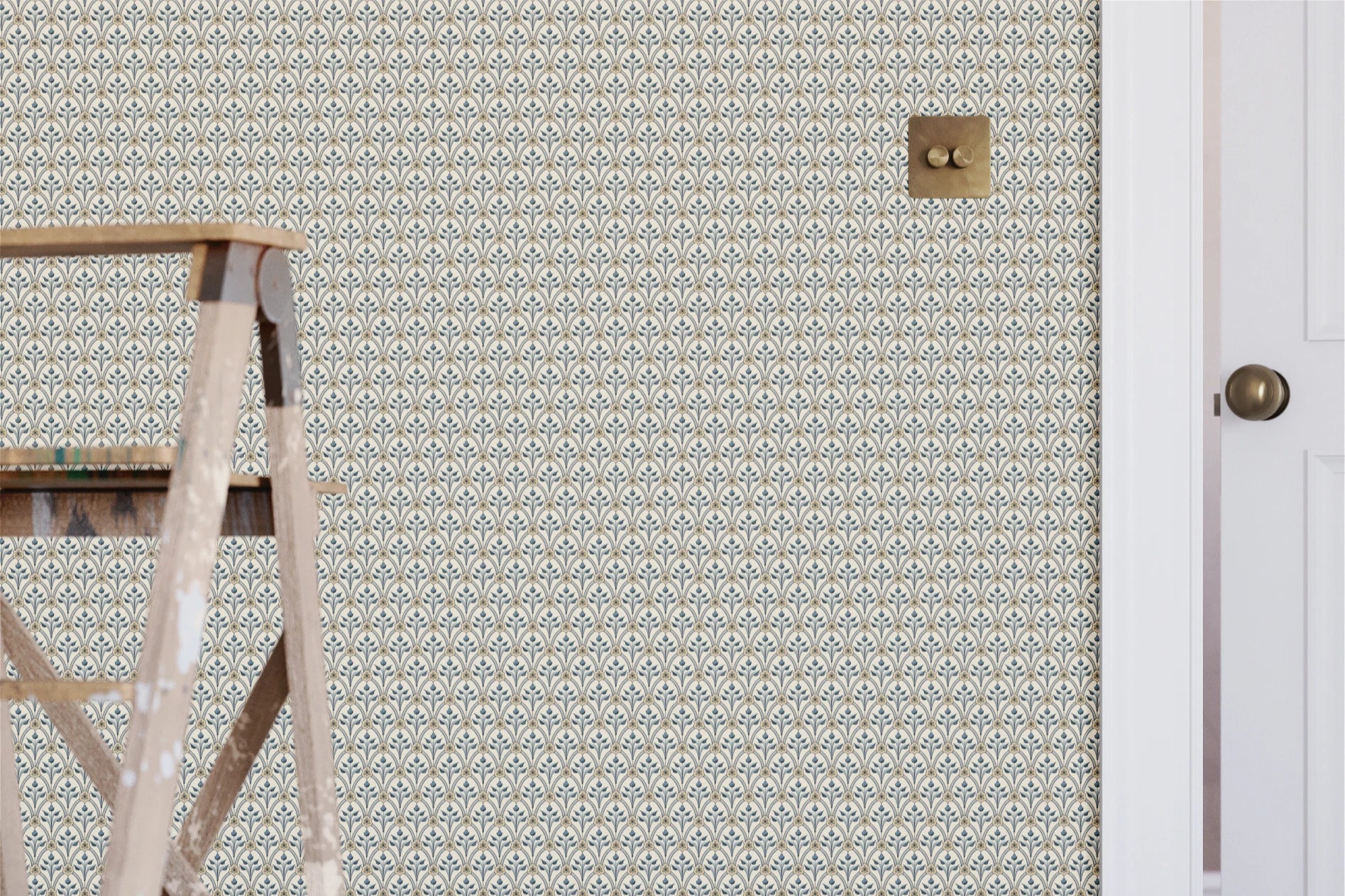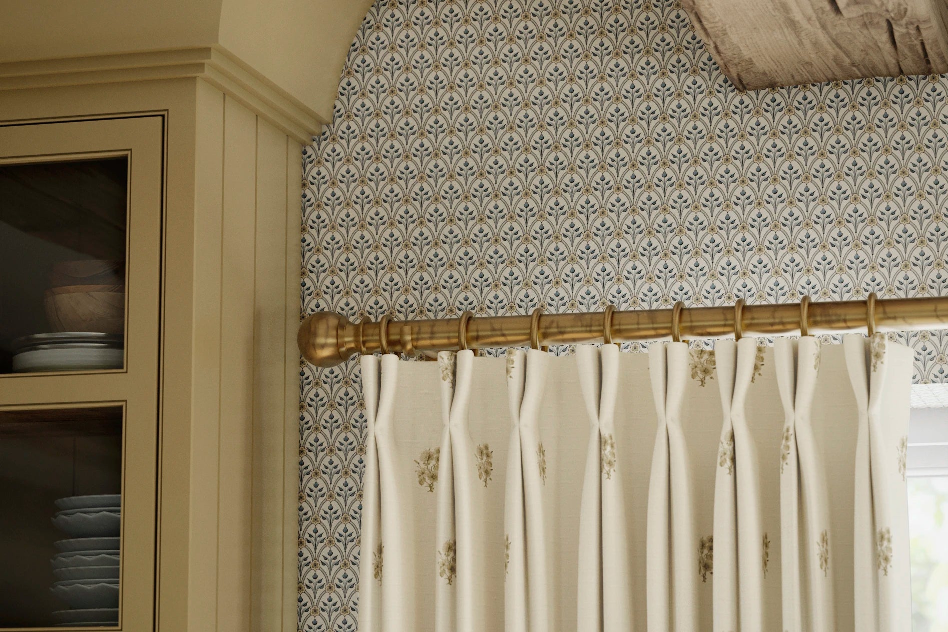 Tudors is a bold, structured motif inspired by medieval carvings, stained glass tracery, and decorative church stonework. Stylised florals rise in rhythmic, gothic arches, forming a strong vertical repeat that feels both ornamental and architectural. With a Rosies Pink floral, set against a Buttermilk ground, the design balances soft botanical detail with graphic precision and historic grandeur.