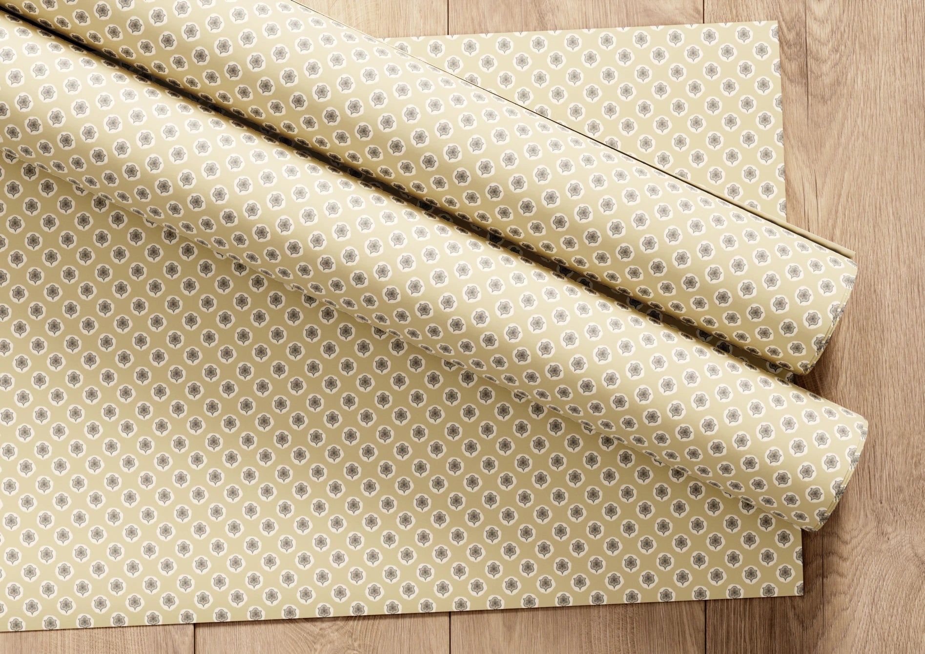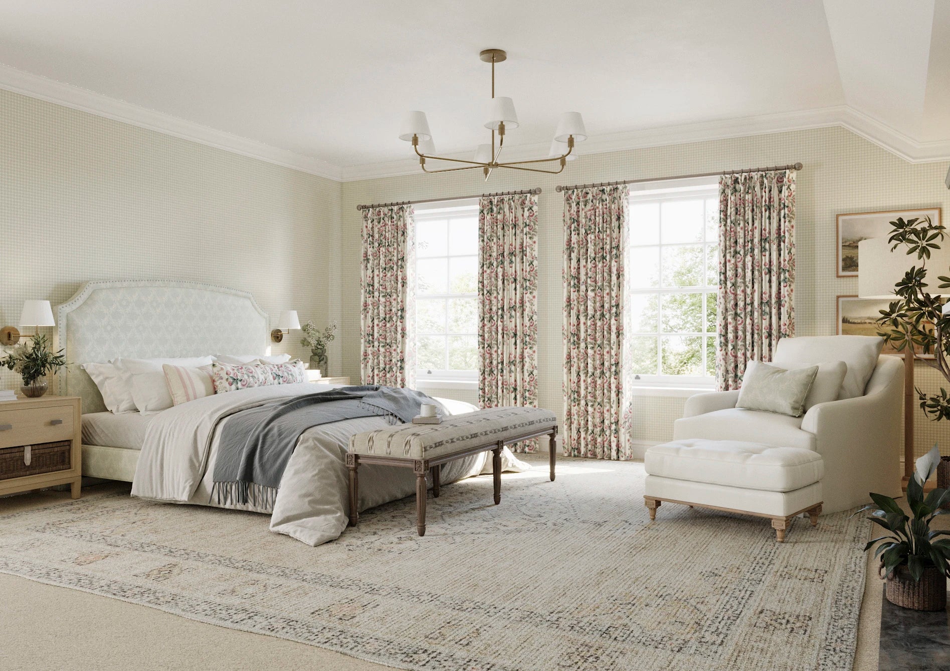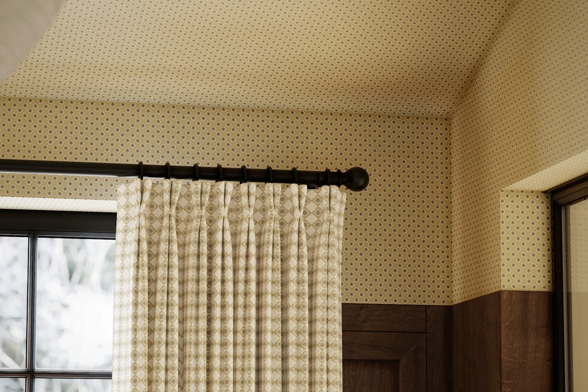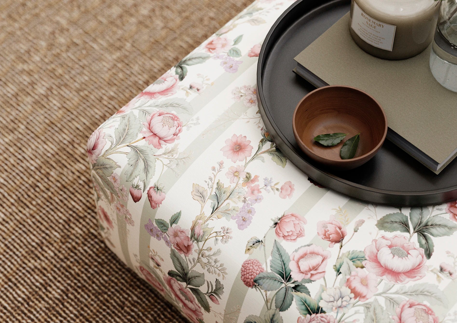Tudors is a bold, structured motif inspired by medieval carvings, stained glass tracery, and decorative church stonework. Stylised florals rise in rhythmic, gothic arches, forming a strong vertical repeat that feels both ornamental and architectural. With a Rosies Pink floral, set against a Buttermilk ground, the design balances soft botanical detail with graphic precision and historic grandeur.