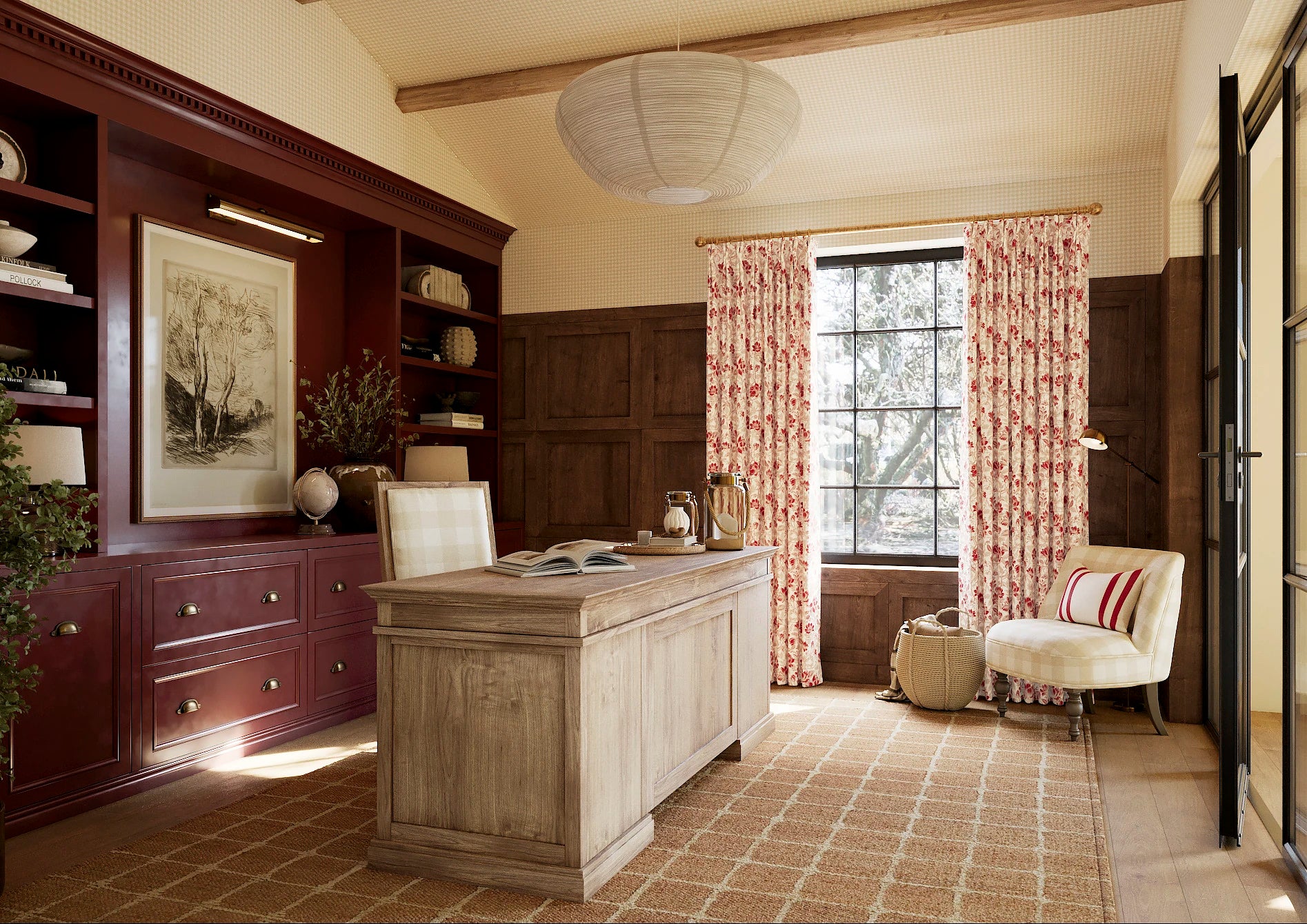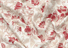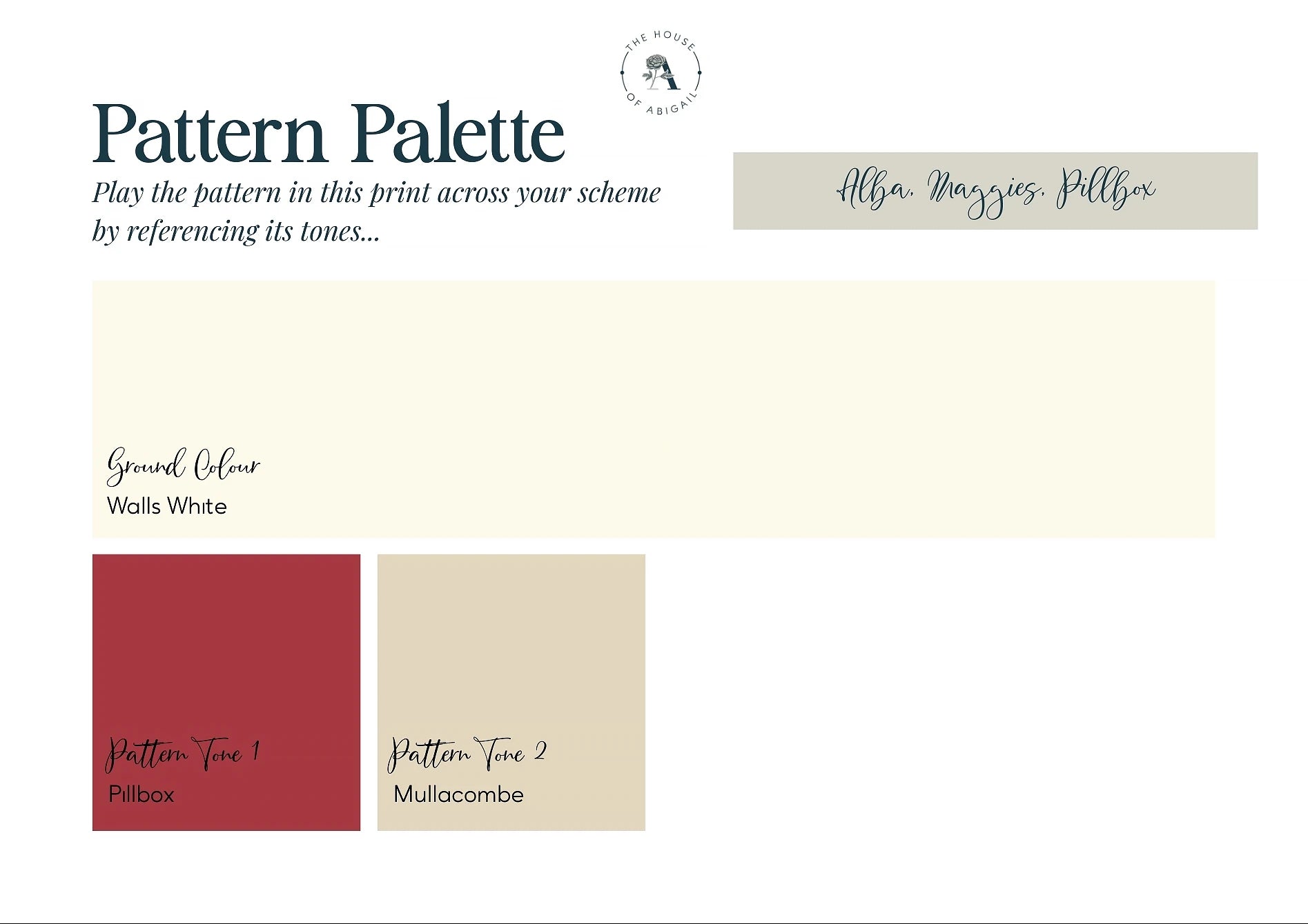 Maggie’s from the Alba collection is a flowing floral inspired by the generous, open forms of magnolia in bloom. Layered petals and branching stems move gracefully across the cloth, creating a design that feels expressive yet settled. In the Pillbox colourway, warm rosy reds are balanced with soft parchment and pale chalky details, giving the design a sense of depth and warmth without feeling heavy. Part of the Joyful Sense, this palette brings confidence and colour to a space while remaining timeless and easy to live with. A beautiful choice for curtains, upholstery, or interiors that favour character, warmth, and gentle movement.