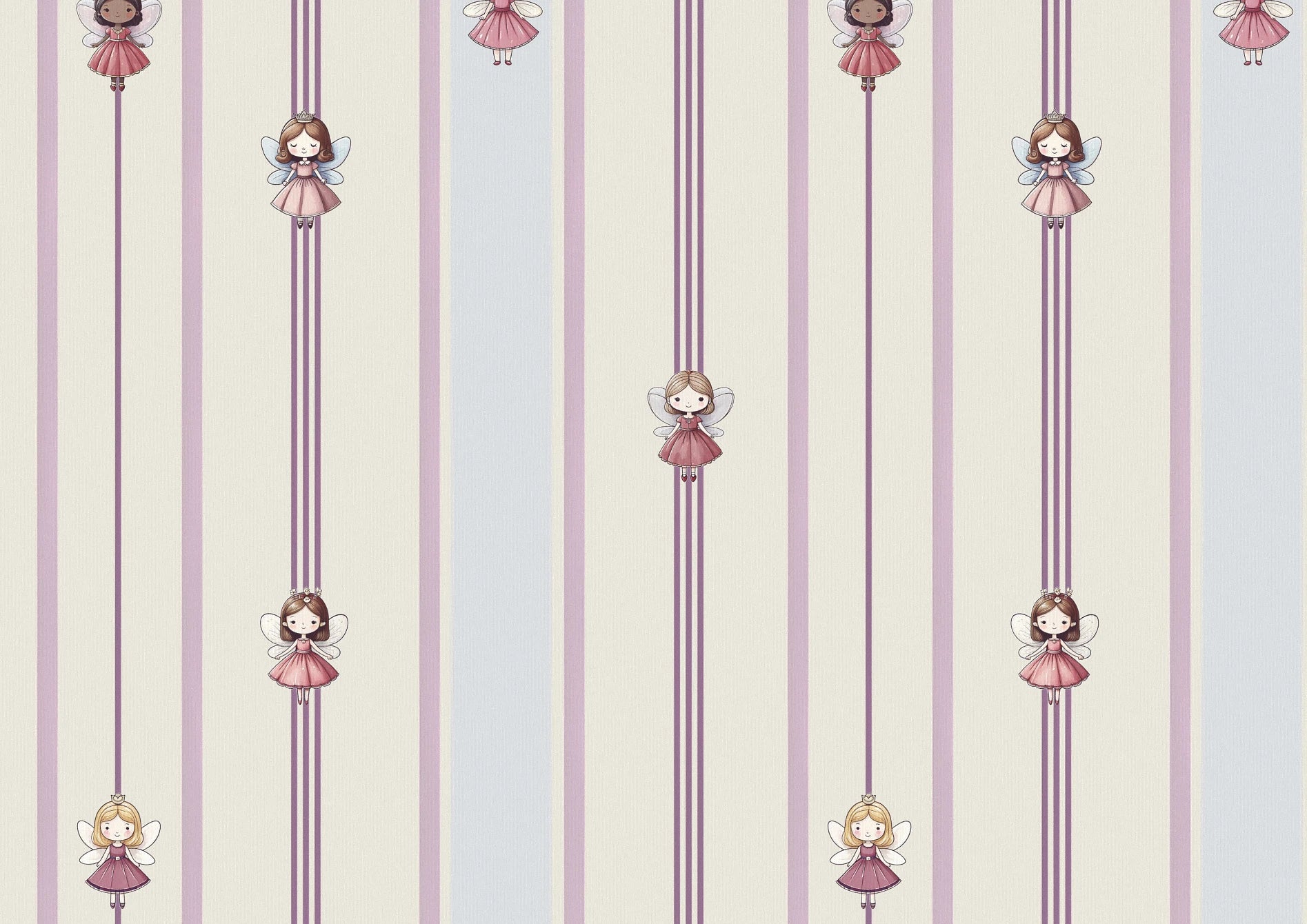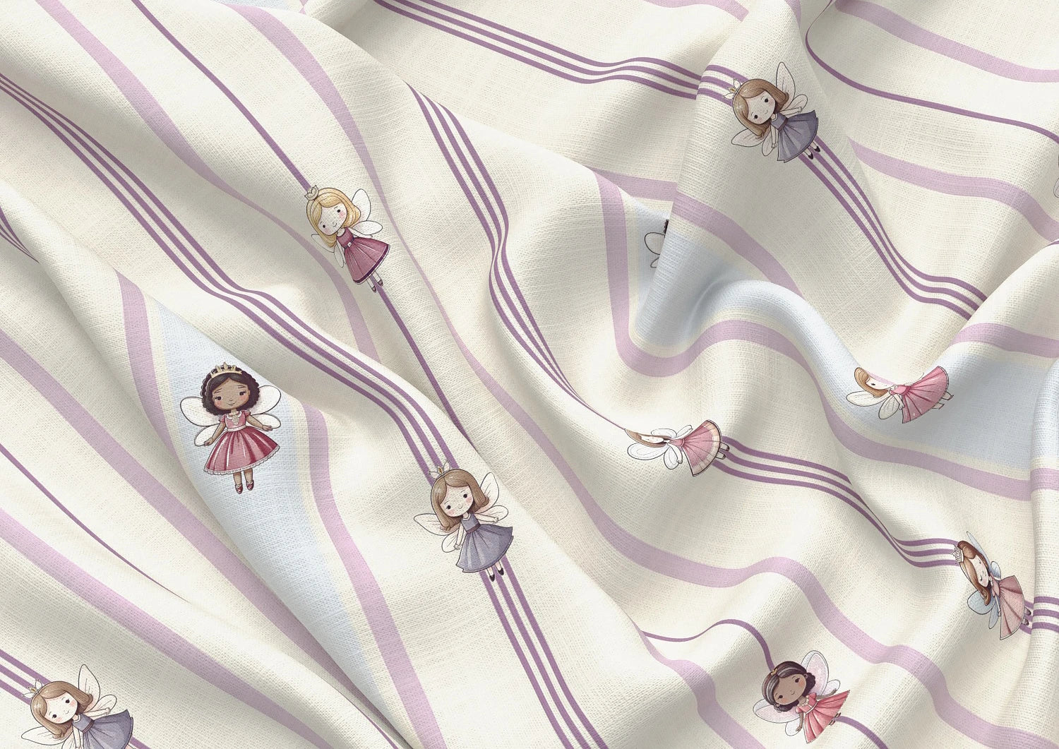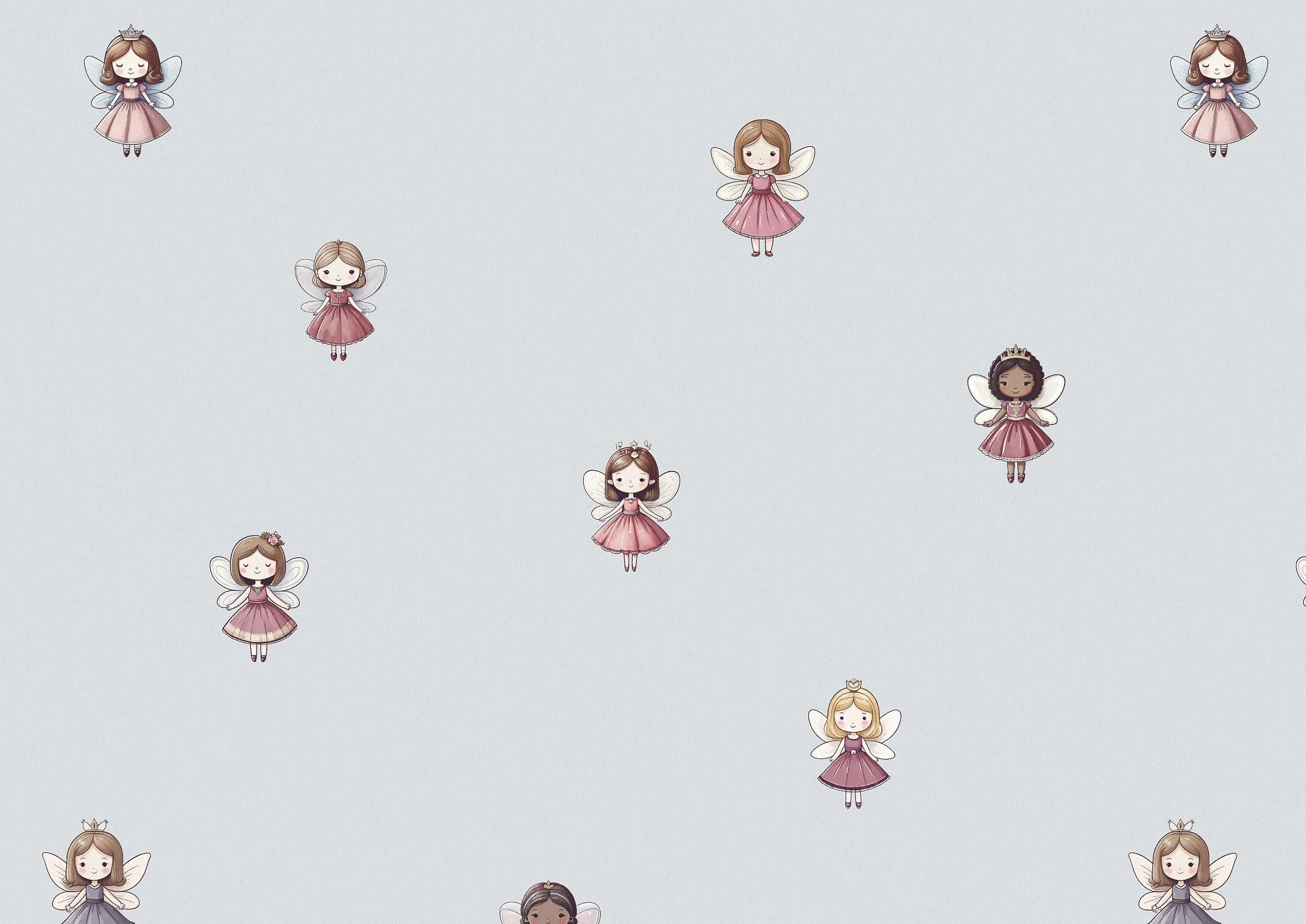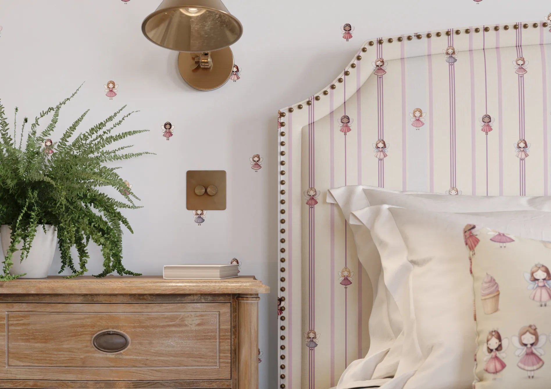 This all-over ditsy print offers a subtle and magical touch to any space. Its small scale will both balance a smaller blind and create a sophisticated look as a full set of curtains. The Wing colourway offers you an alternative to just pink for a more feminine room—the powdery off-blue feels fresh, while the warmth of the fairies' dresses offers deeper tones to anchor your little baker's scheme. Join your new friends and fly away to a dreamland full of magic sprinkles and cake!