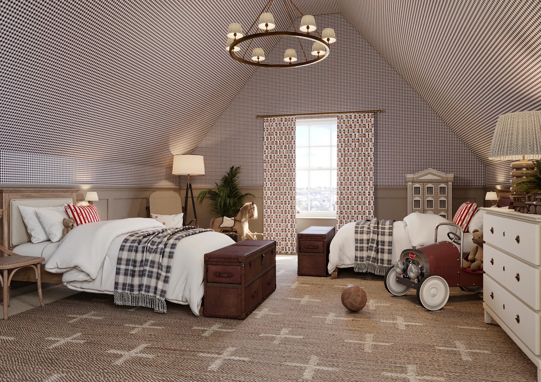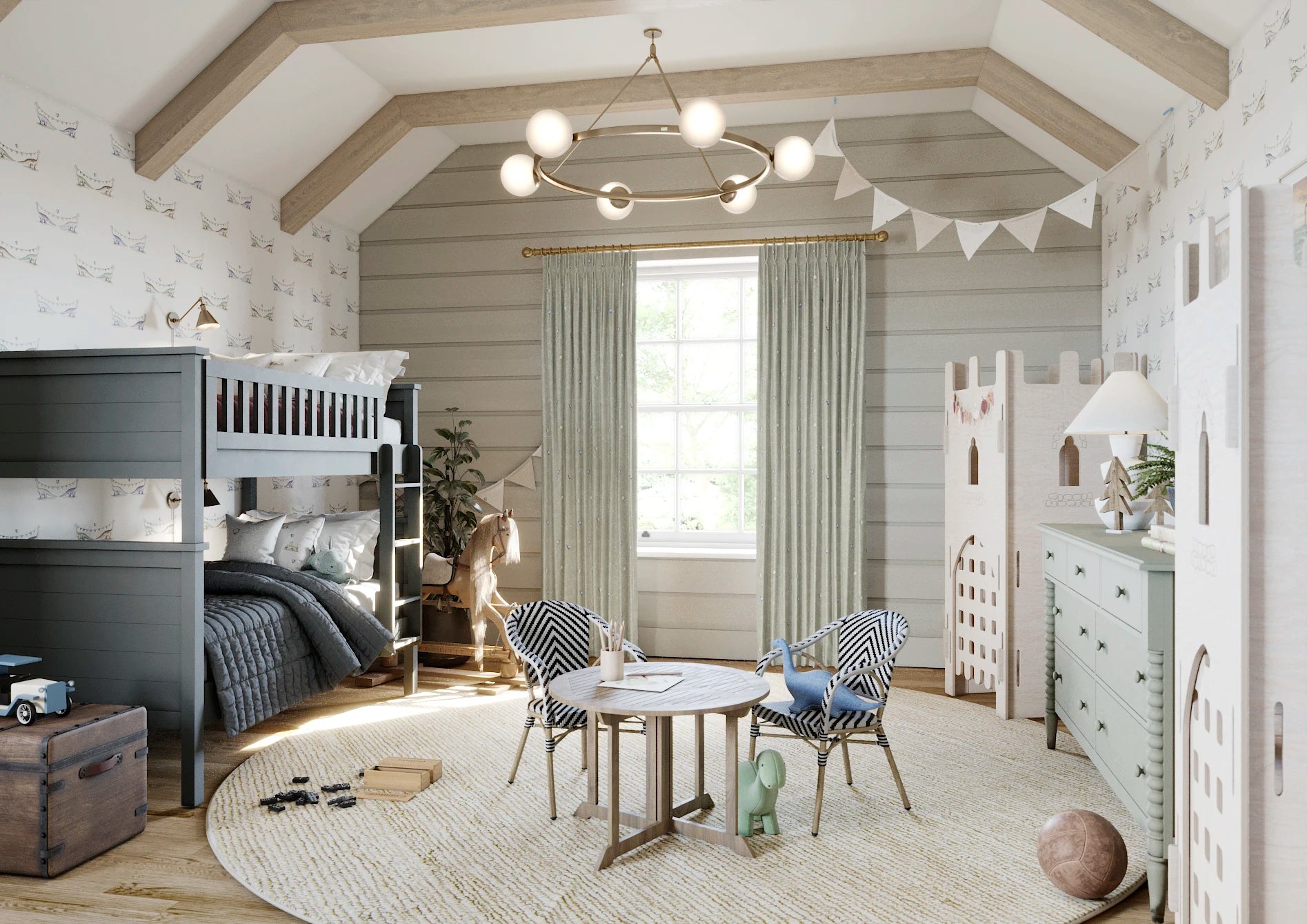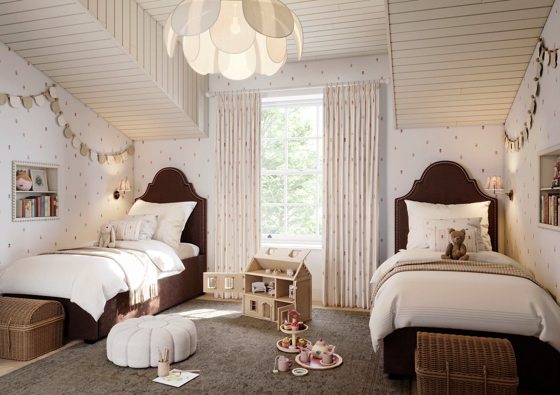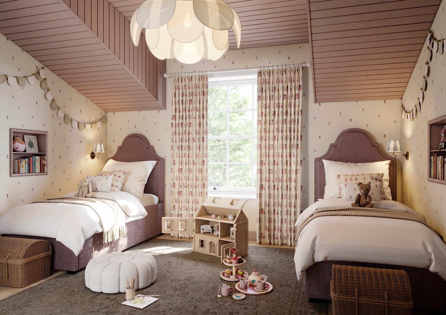 This all-over ditsy print offers a subtle and magical touch to any space. Its small scale will both balance a smaller blind and create a sophisticated look as a full set of curtains. The Wing colourway offers you an alternative to just pink for a more feminine room—the powdery off-blue feels fresh, while the warmth of the fairies' dresses offers deeper tones to anchor your little baker's scheme. Join your new friends and fly away to a dreamland full of magic sprinkles and cake!