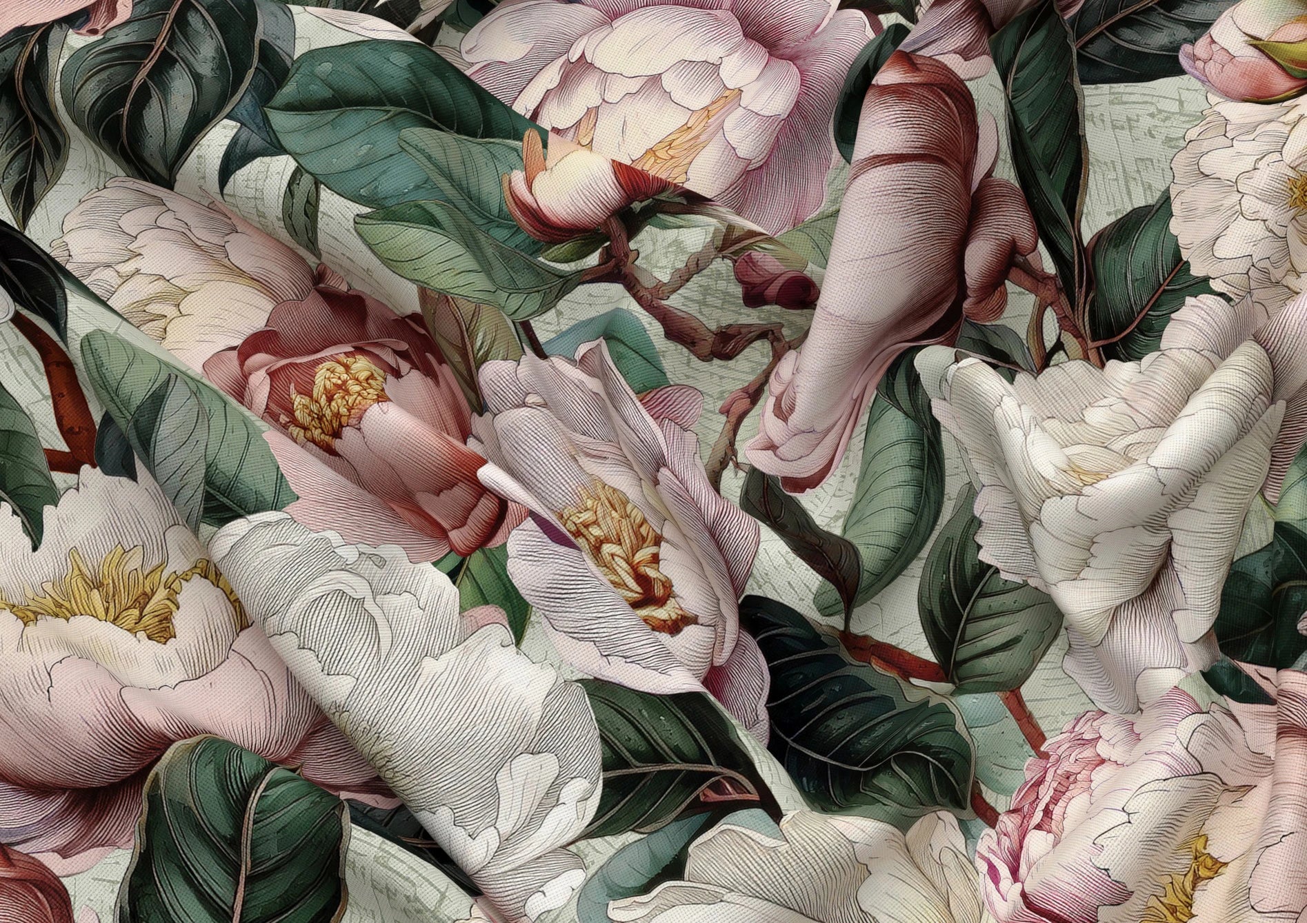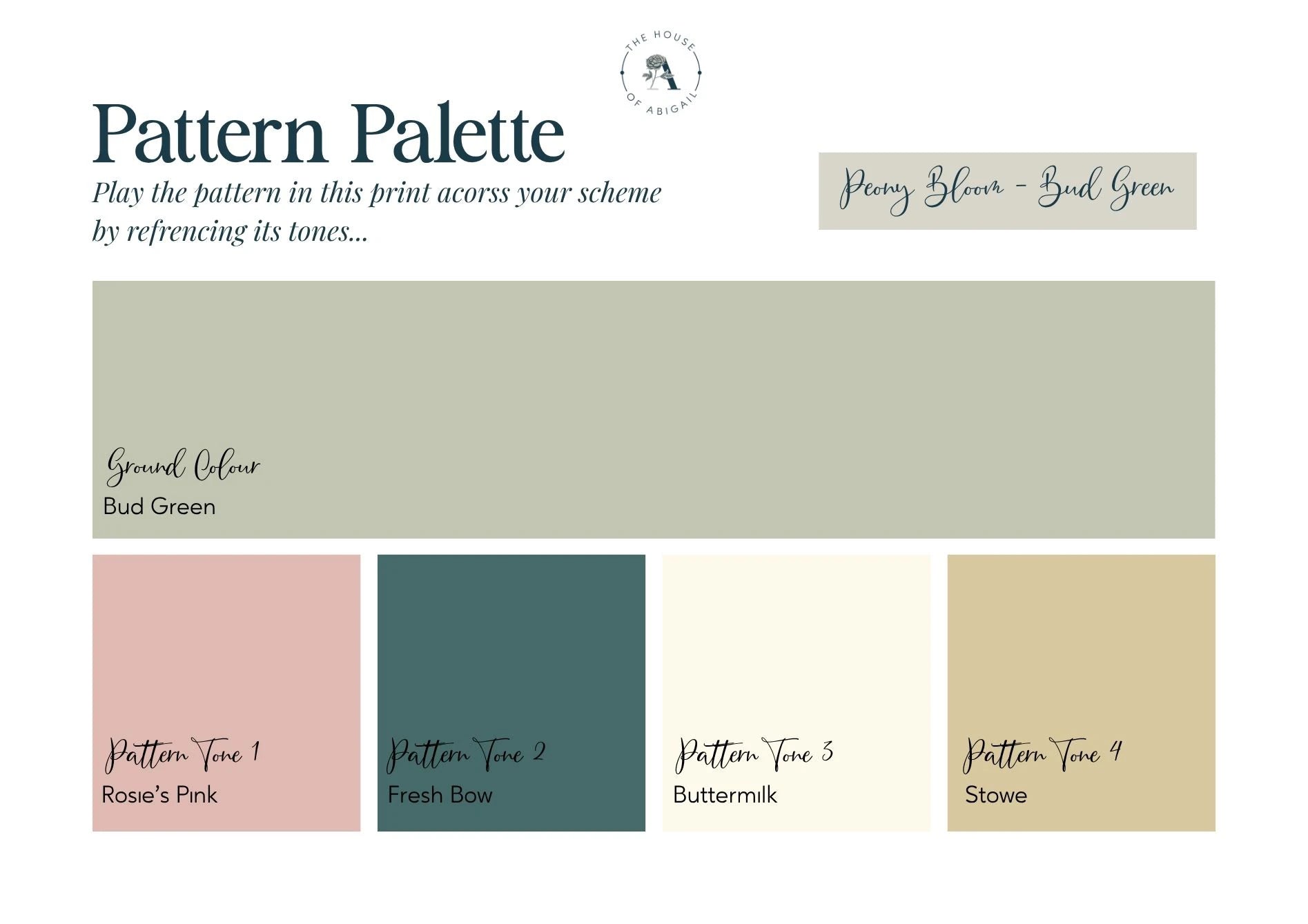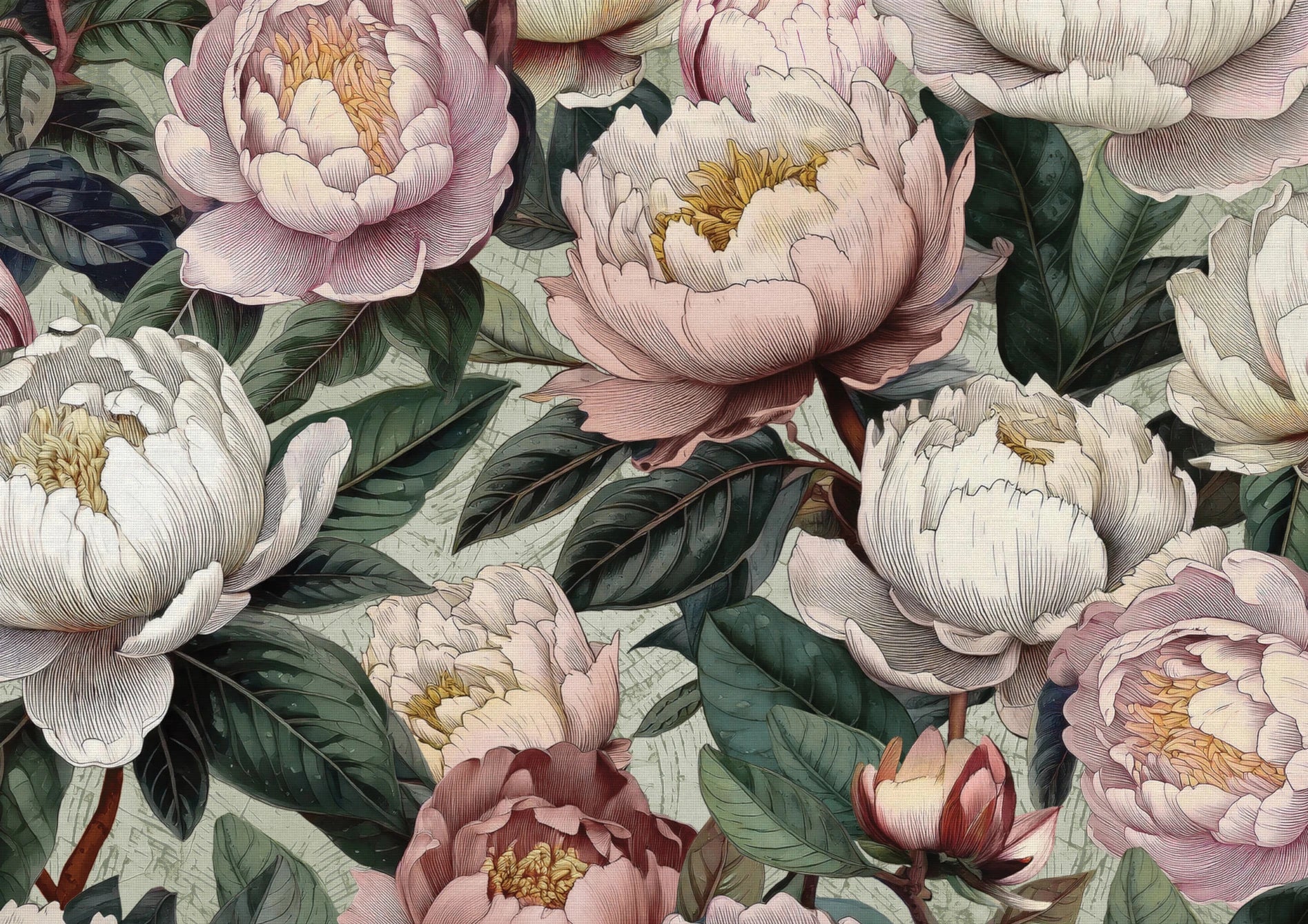 Peony Bloom is a bold, romantic celebration of botanical artistry. Featuring luxuriously detailed, etched-style peonies in full bloom and bud, this design evokes the beauty of classical florals with a rich, expressive twist. Set against a subtle Bud Green backdrop, the lush foliage and soft tones of blush, ivory, and plum bring a dramatic yet harmonious feel to the pattern. Every petal and leaf is drawn with precision and character, reflecting the heritage of hand-drafted botanical studies.