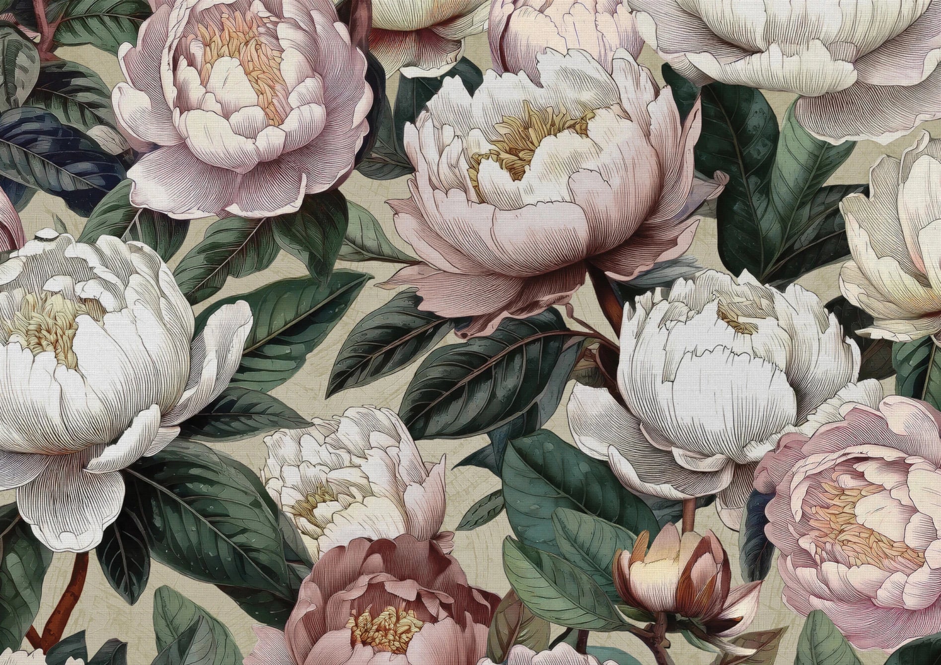 Peony Bloom is a bold, romantic celebration of botanical artistry. Featuring luxuriously detailed, etched-style peonies in full bloom and bud, this design evokes the beauty of classical florals with a rich, expressive twist. Set against a subtle Wiginton backdrop, the lush foliage and soft tones of blush, ivory, and plum bring a dramatic yet harmonious feel to the pattern. Every petal and leaf is drawn with precision and character, reflecting the heritage of hand-drafted botanical studies.