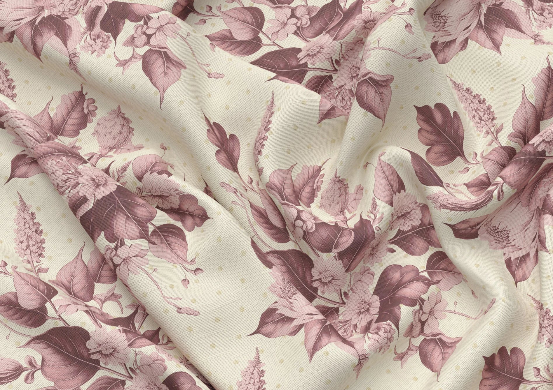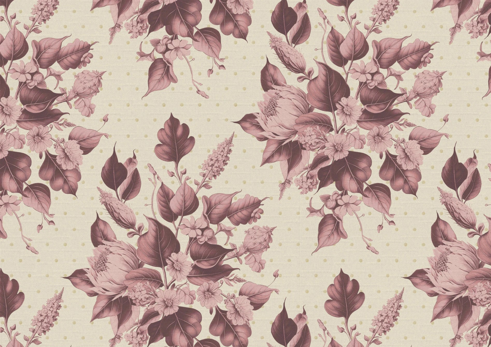 Penn Bouquet is a richly layered floral composition, hand-drawn with botanical precision and composed in a symmetrical repeat. A tangle of gathered blooms, seed pods, and curling leaves in hues of Rosies Pink, unfurls across a warm cream ground, accented with a subtle dotted backdrop that adds depth without distraction. The warm, sepia-toned palette evokes a sense of vintage elegance, bringing presence and delicacy to the design.