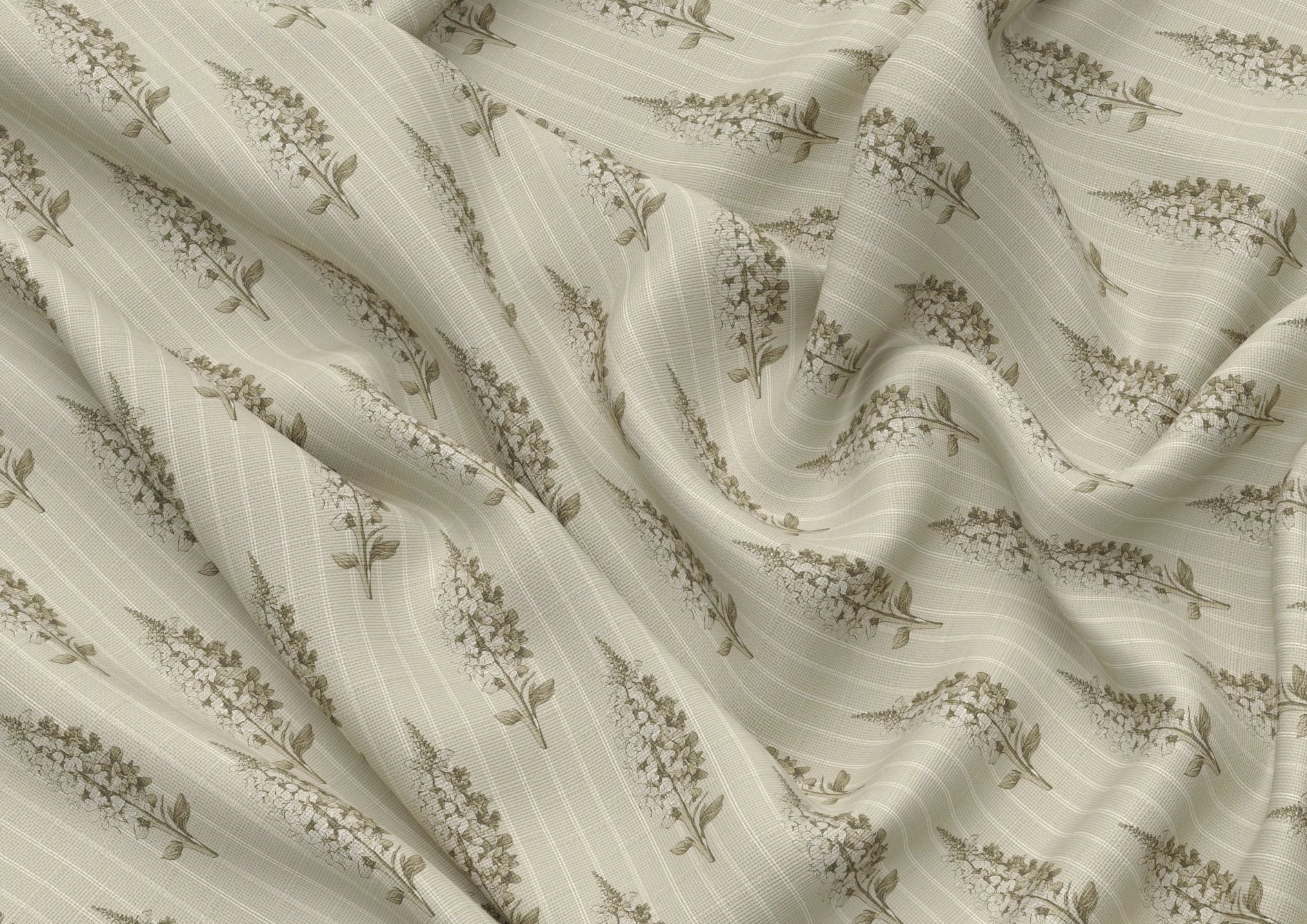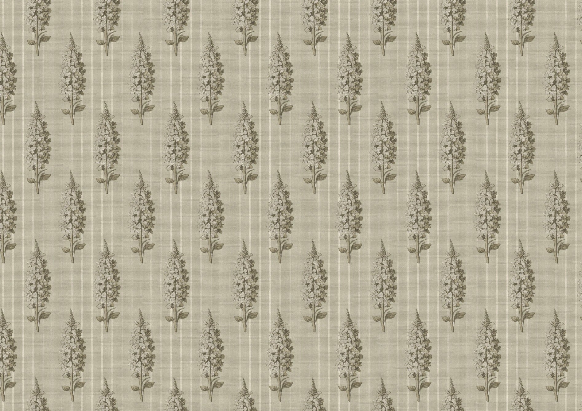 Penn Spear is a bold yet graceful floral stripe, inspired by the formal language of historic garden borders and botanical engravings. Each vertical column features a carefully hand-drawn spear-like bloom, detailed in warm sepia tones and framed by softly undulating pinstripes. Set against the soft, Wiginton ground, the pattern strikes a balance between strength and delicacy - structured, yet organic.