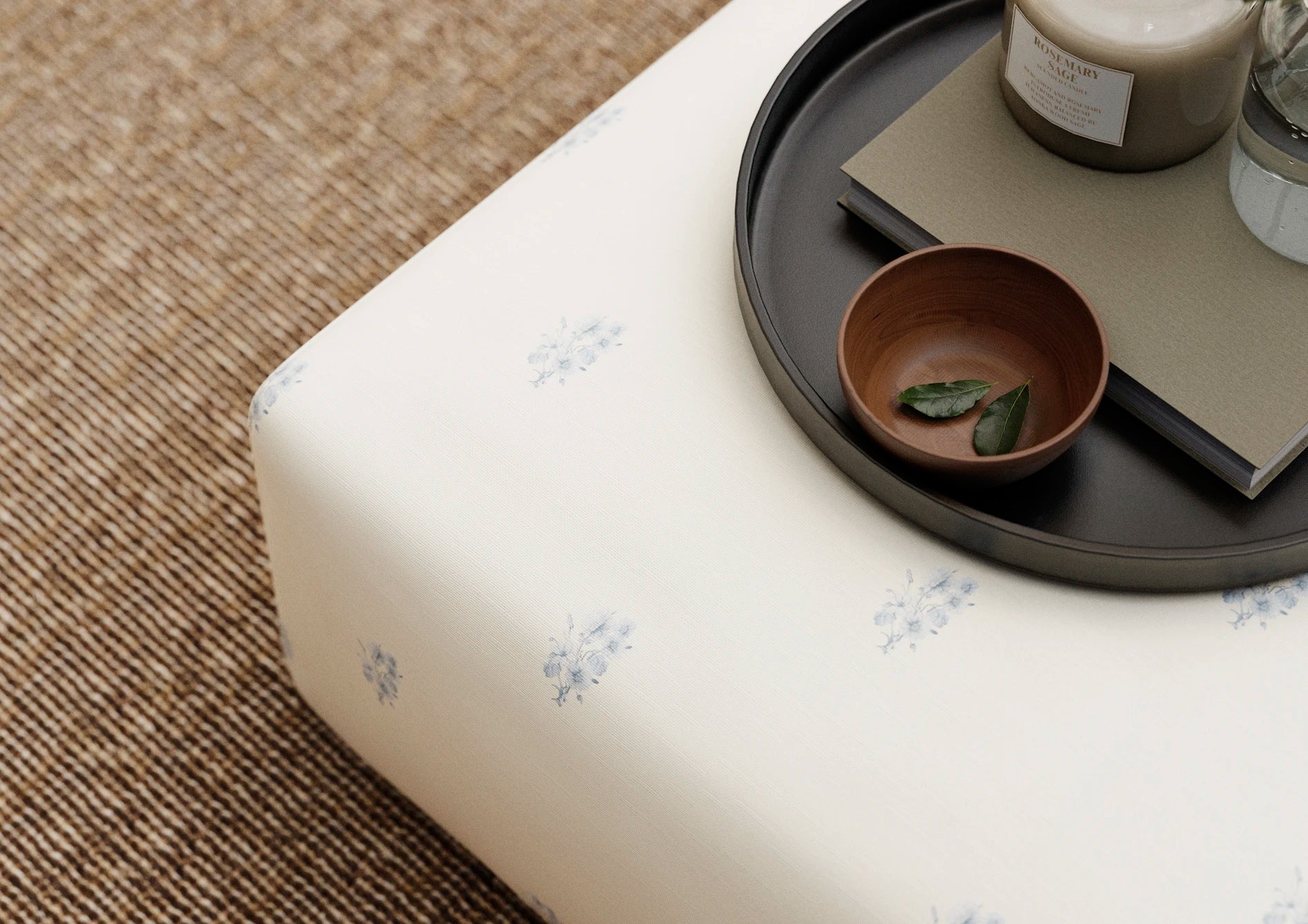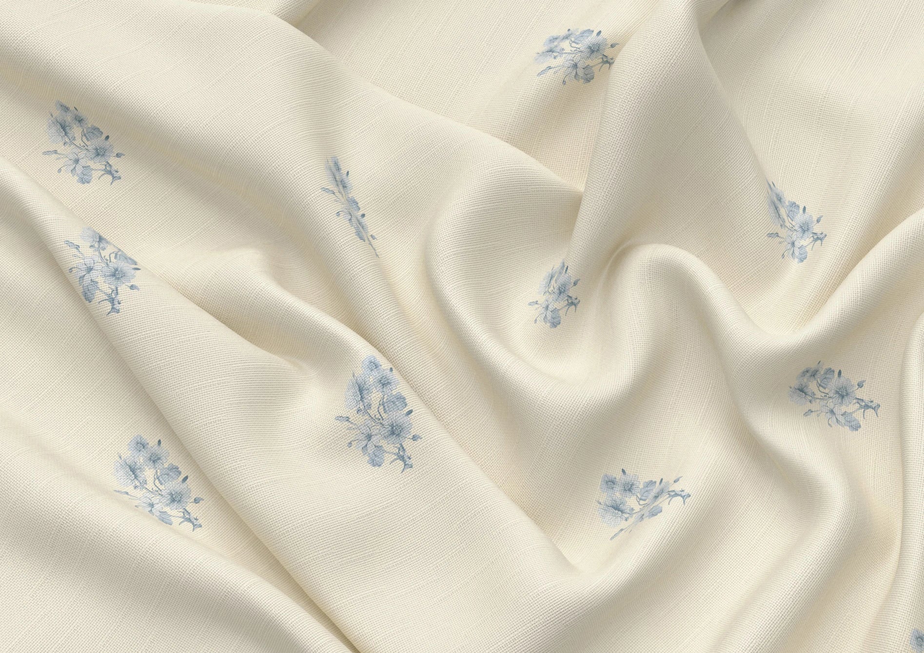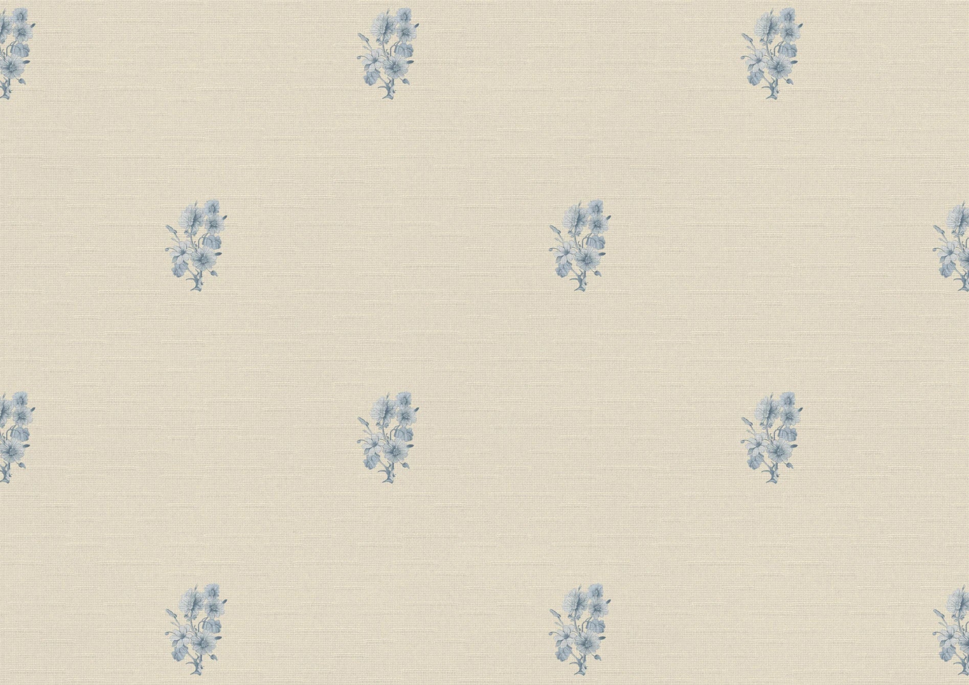 Posey is a finely detailed sprig motif, hand-drawn with a gentle, illustrative touch and arranged in a soft, widely spaced repeat. Featuring lightly etched botanical elements in subtle blue Peters tones, each posey floats against a warm cream ground, creating a feeling of openness, calm, and effortless charm.