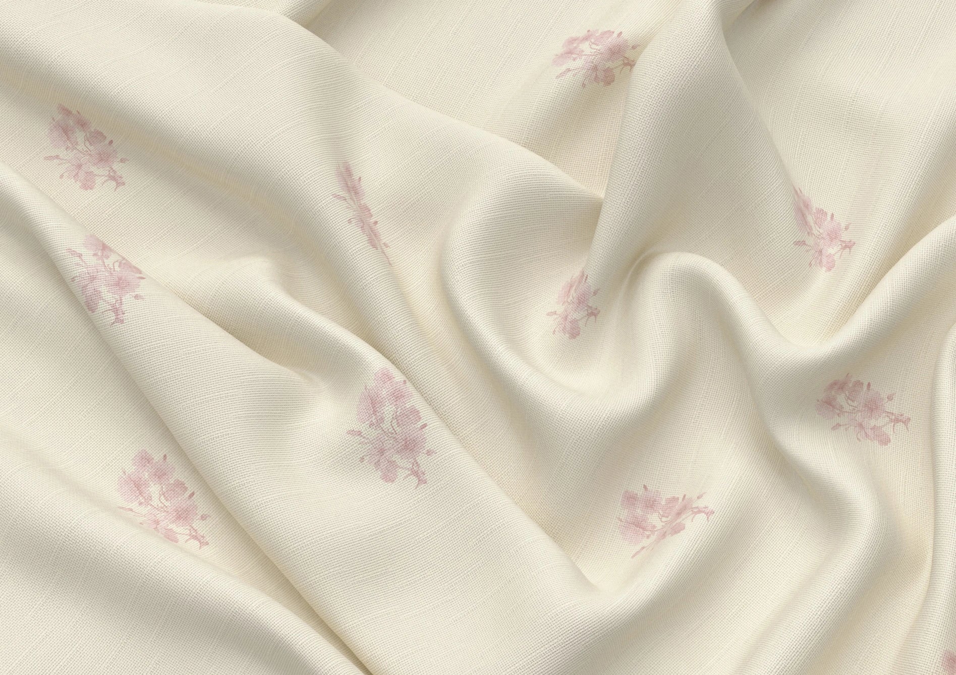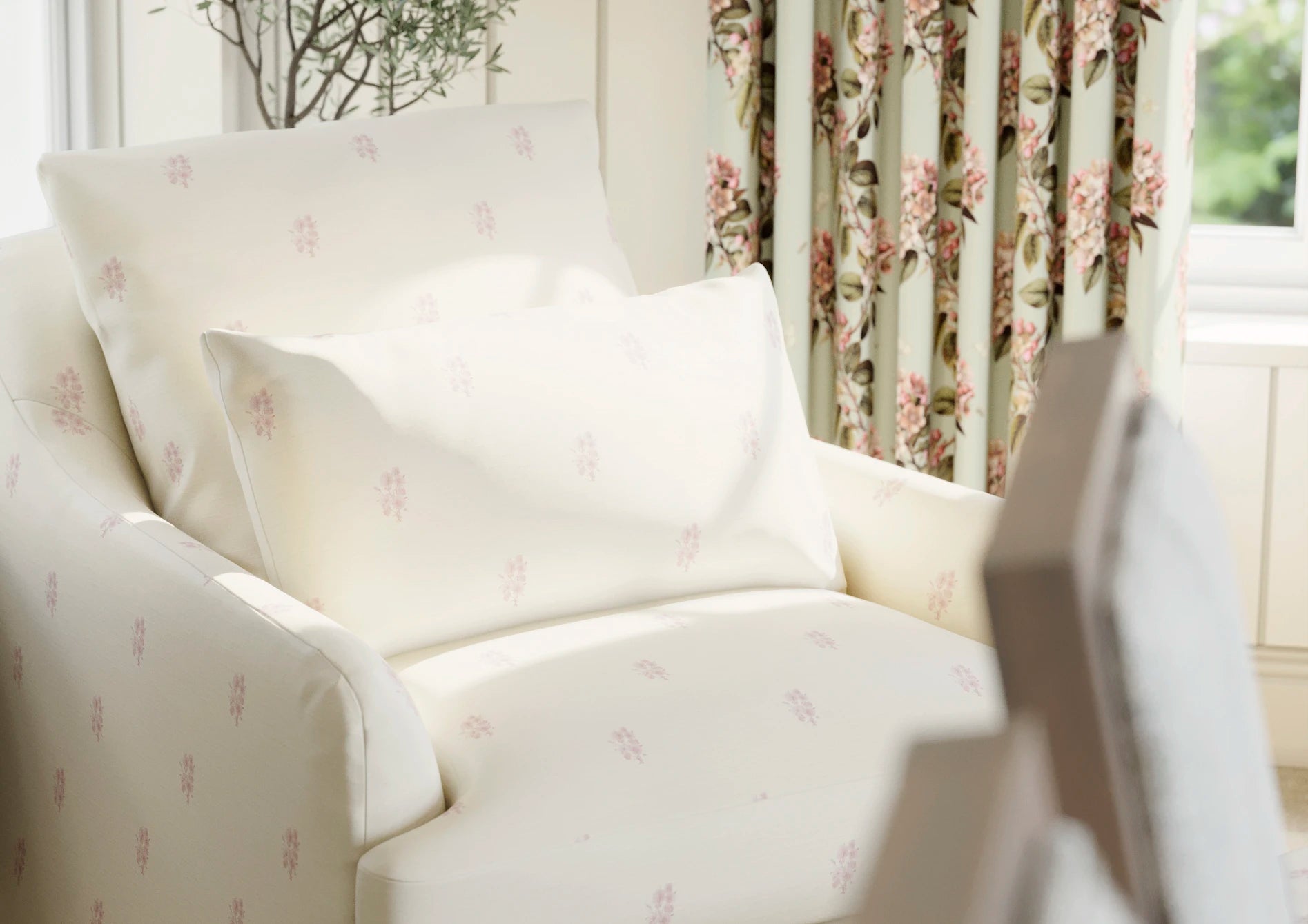 Posey is a finely detailed sprig motif, hand-drawn with a gentle, illustrative touch and arranged in a soft, widely spaced repeat. Featuring lightly etched botanical elements in subtle Rosies Pinks tones, each posey floats against a warm cream ground, creating a feeling of openness, calm, and effortless charm.