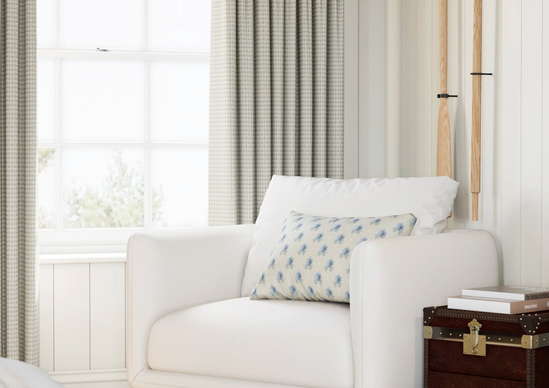 Sebby is a decorative floral motif, hand-drawn with graceful symmetry and a quiet nod to antique crests and ornamental botanical forms. Each bloom is rendered in a soft Raffs Blue, framed by flowing Bud Green leaves and gently accented with dotted details, all arranged on a neutral Wiginton background. The design’s gentle repeat and light palette bring a sense of balance, calm, and timeless charm to interior spaces.