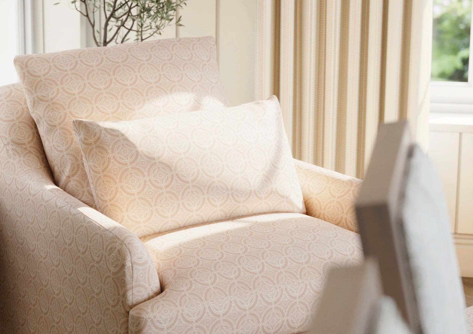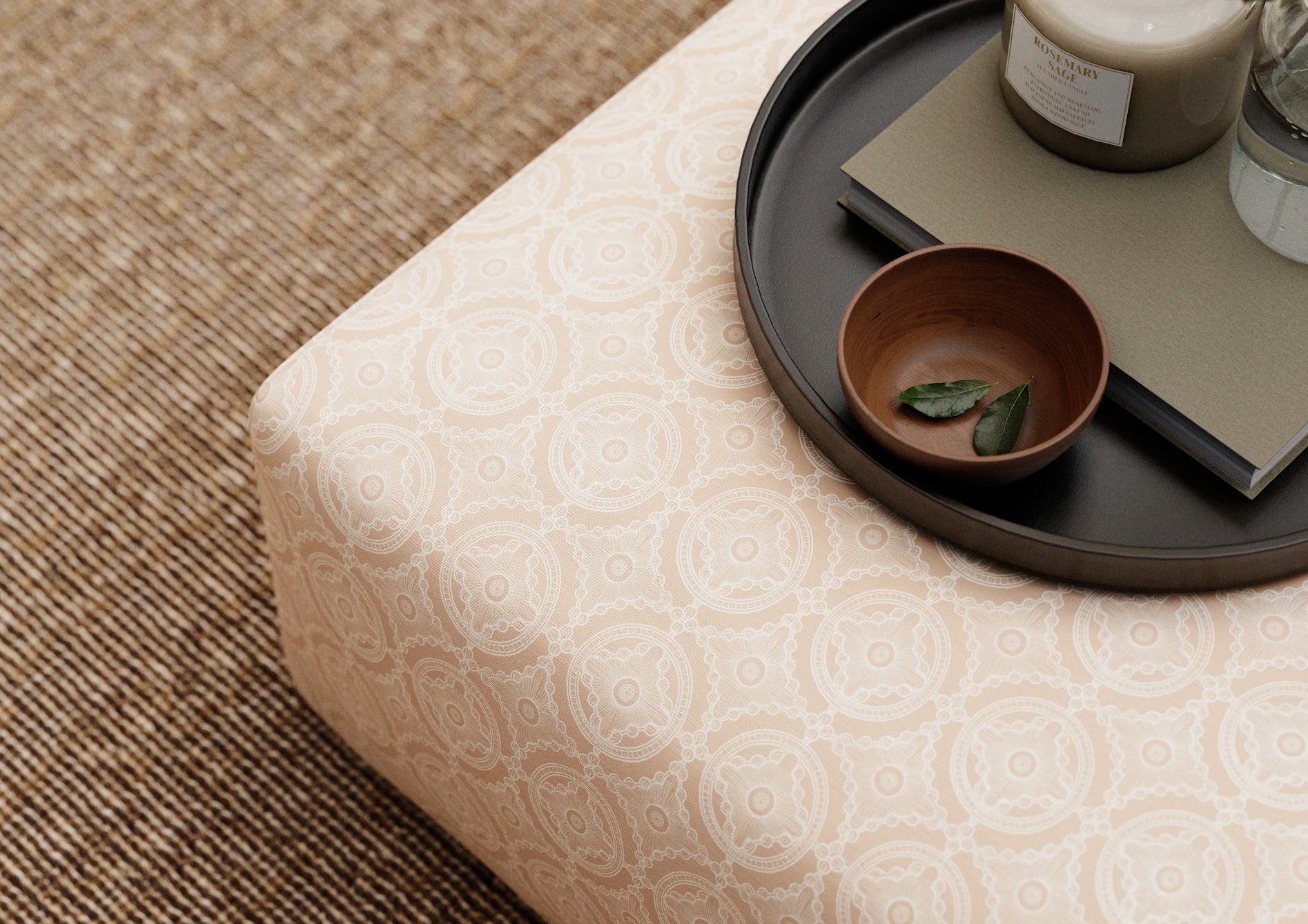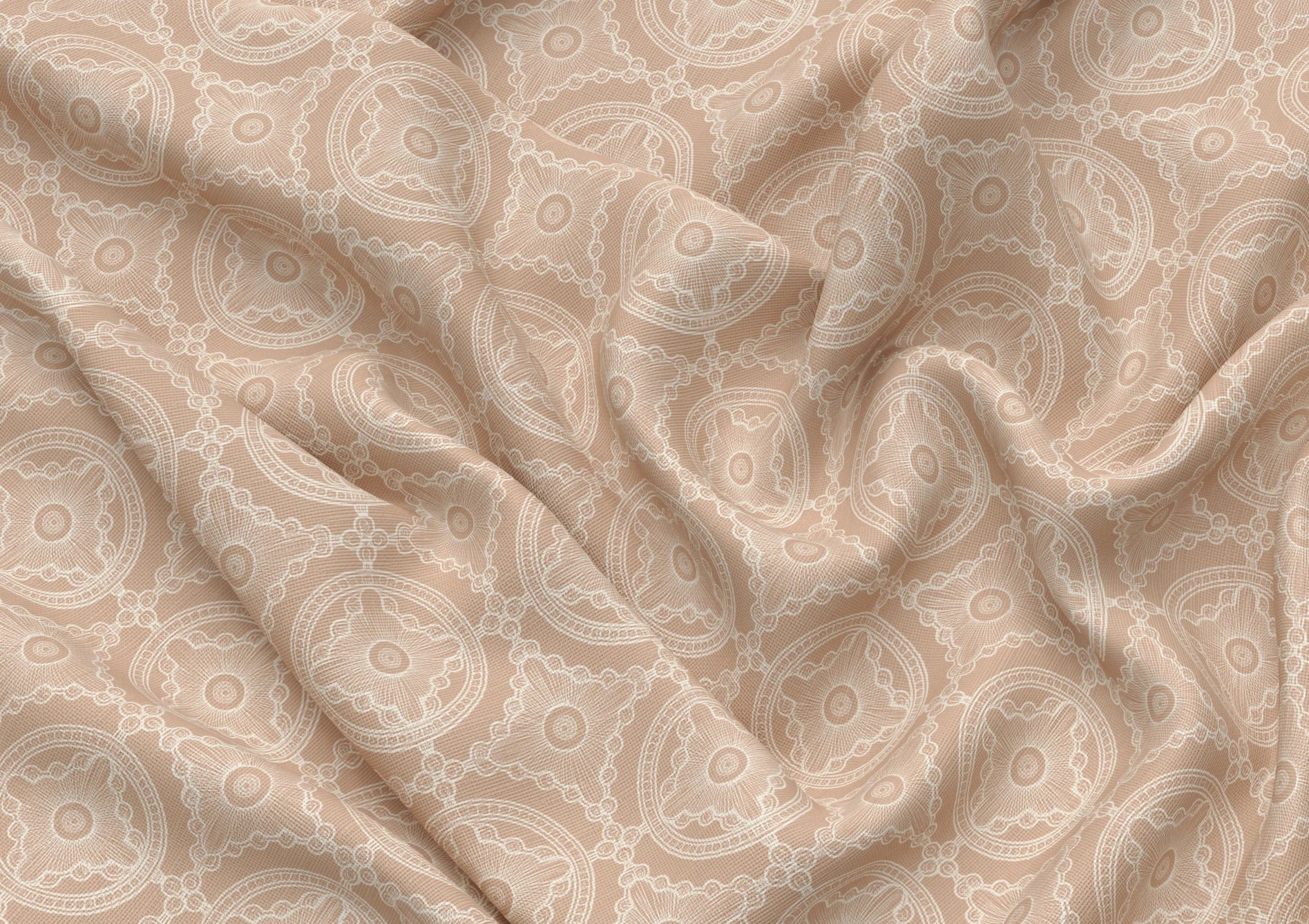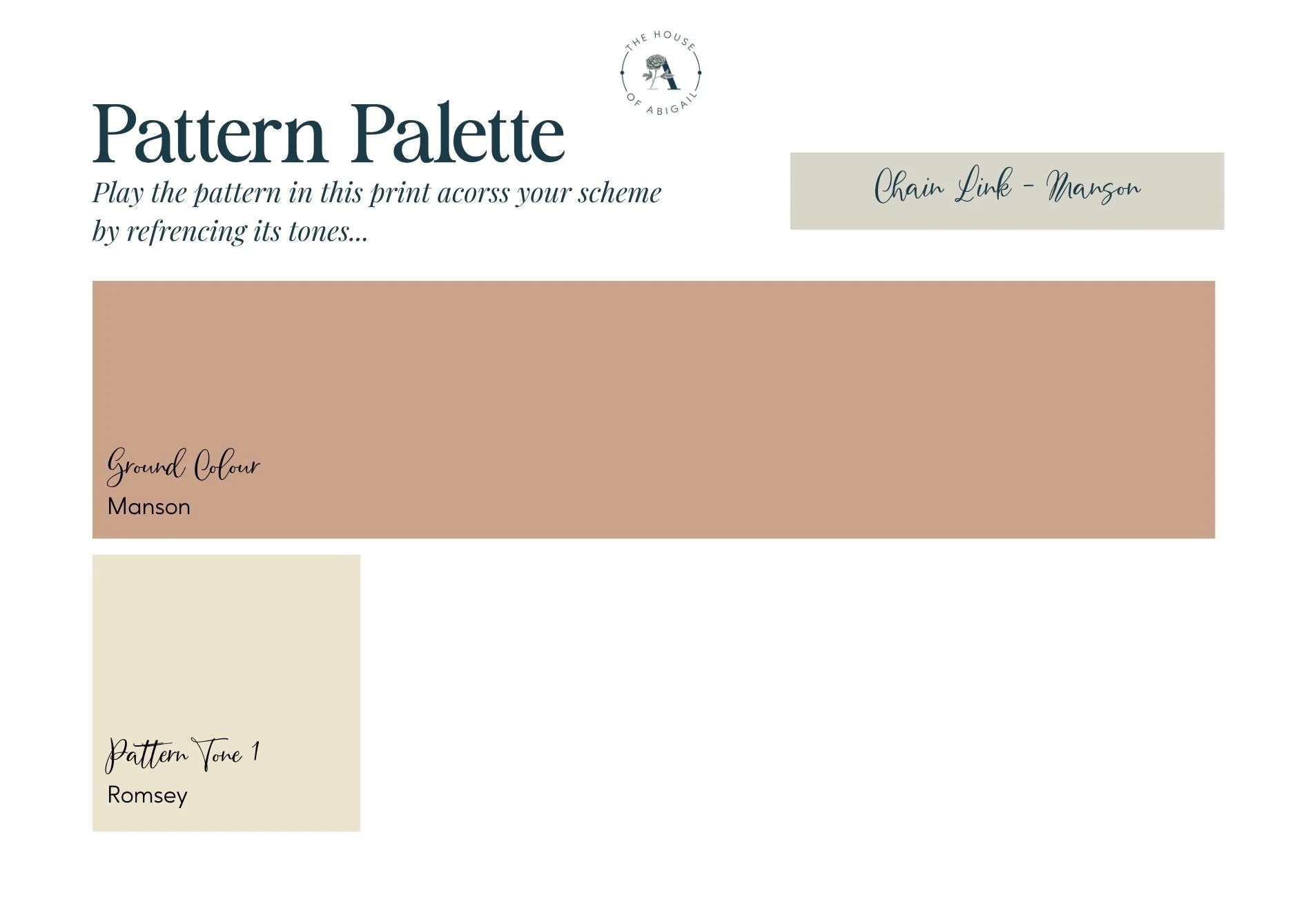 Chain Link is a rhythmic, architectural repeat inspired by traditional ironwork and ornamental tracery. Referencing the repeating forms of historic chain-link fencing and cast-iron gates, this pattern layers structured geometry with delicate, hand-drawn detail. The interlocking motifs create a sense of visual continuity and quiet strength, while the soft Manson colourway adds a cool, timeless elegance.