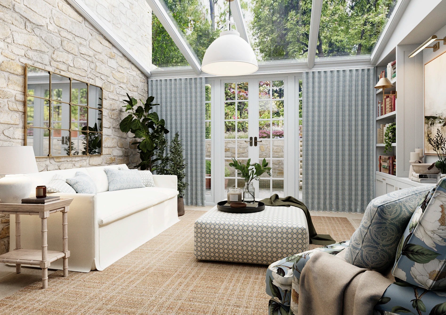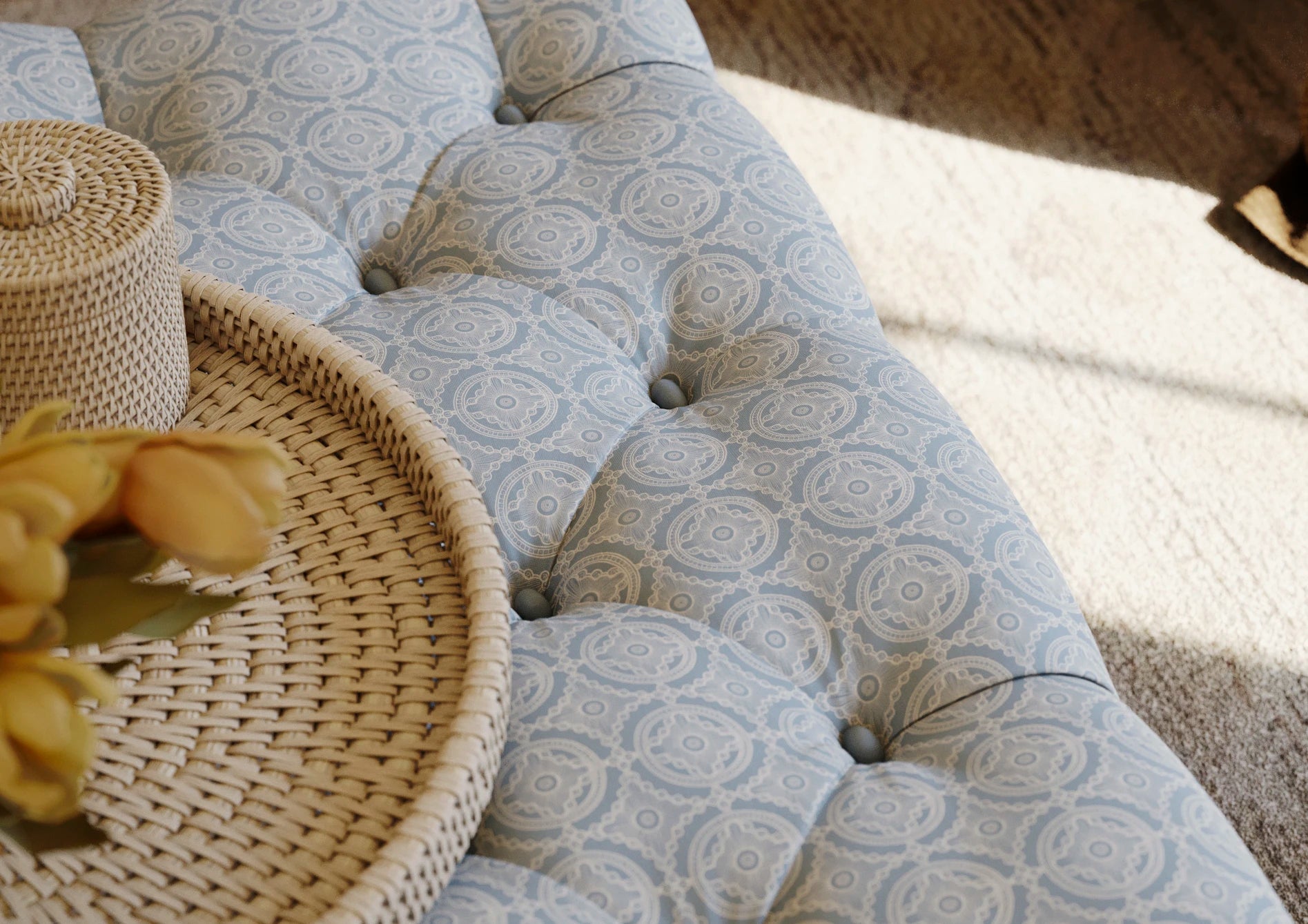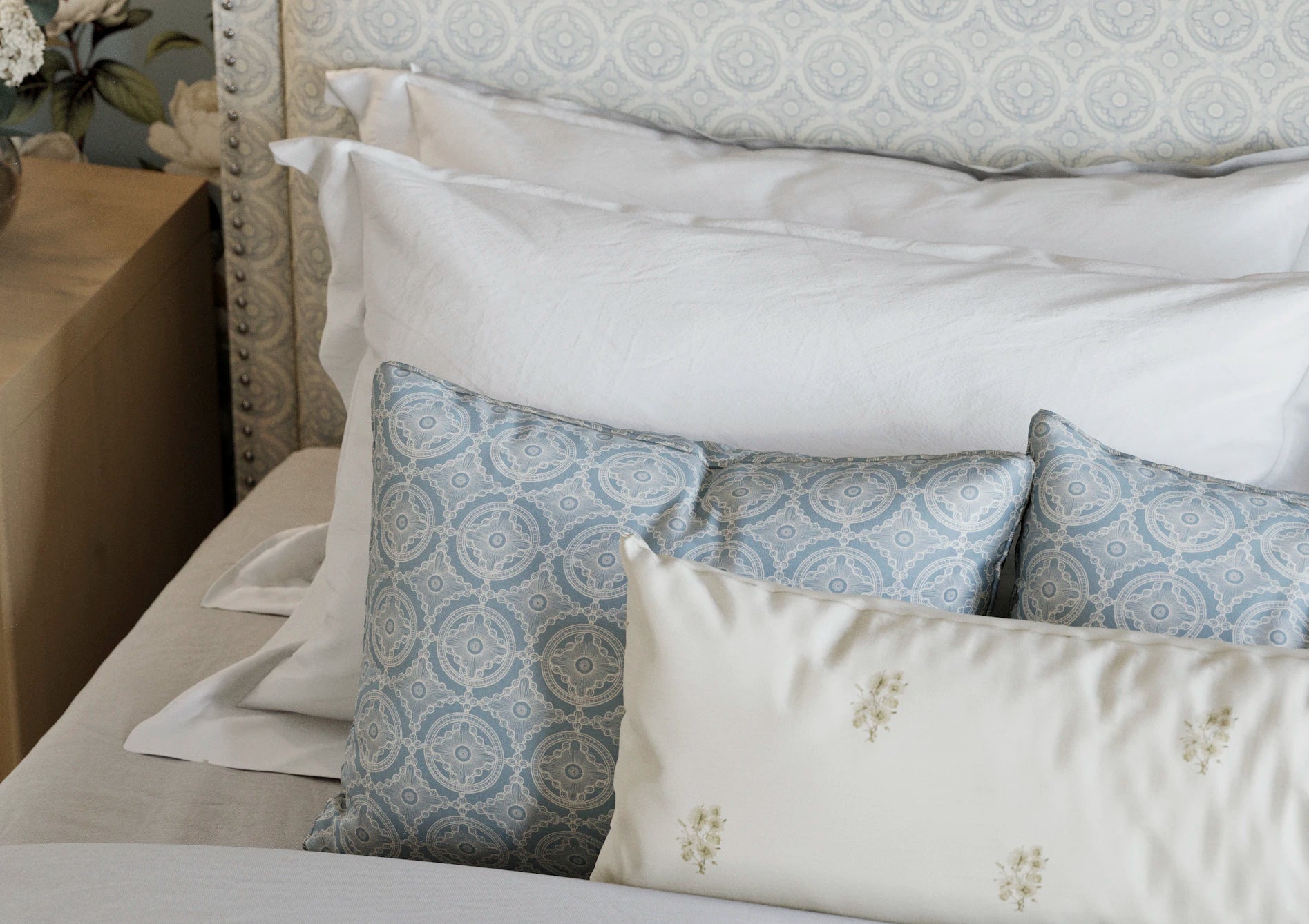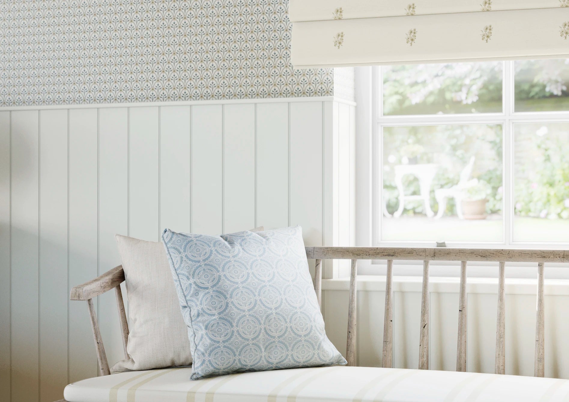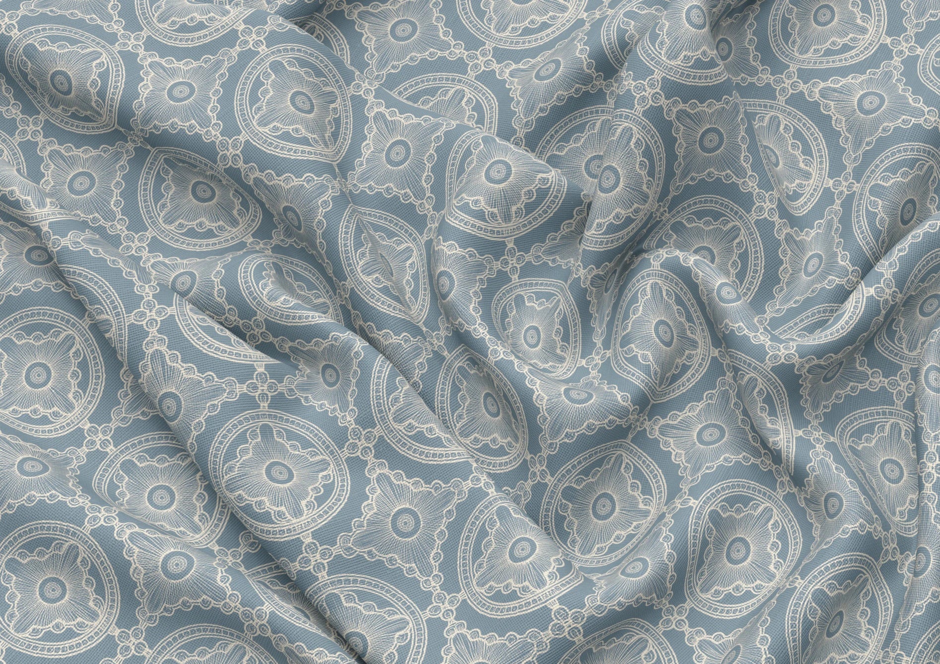 Chain Link is a rhythmic, architectural repeat inspired by traditional ironwork and ornamental tracery. Referencing the repeating forms of historic chain-link fencing and cast-iron gates, this pattern layers structured geometry with delicate, hand-drawn detail. The interlocking motifs create a sense of visual continuity and quiet strength, while the soft Raffs Blue colourway adds a cool, timeless elegance.