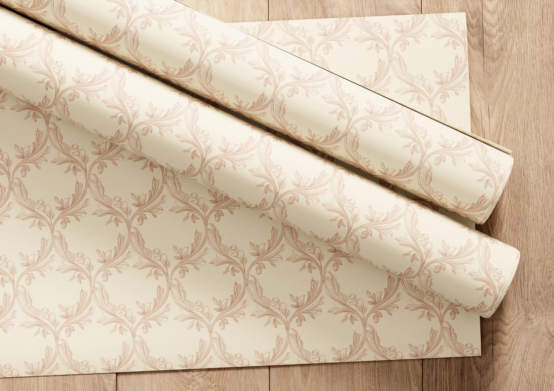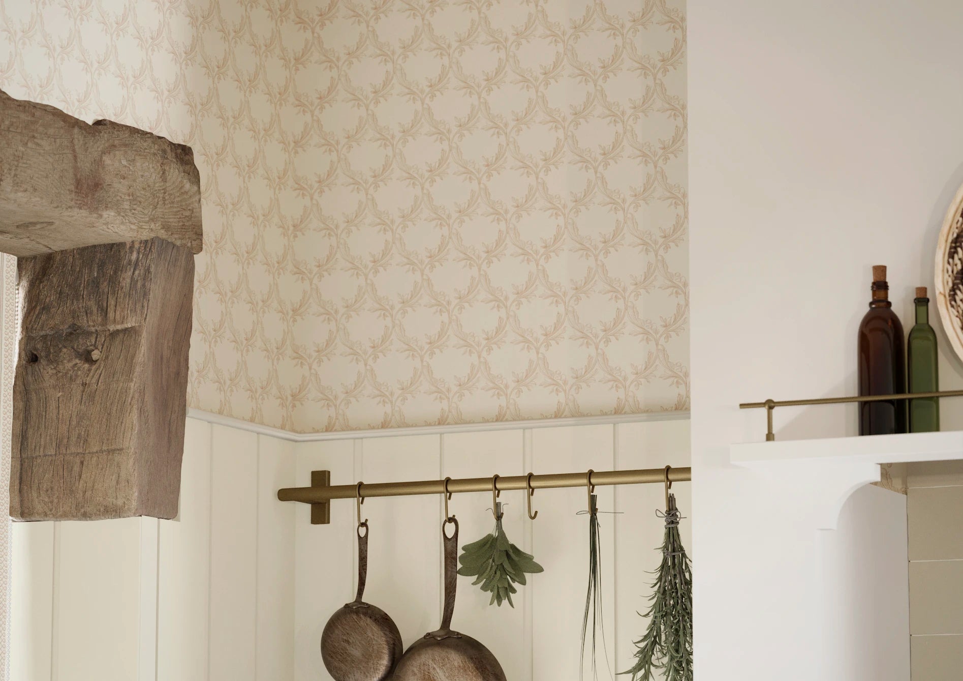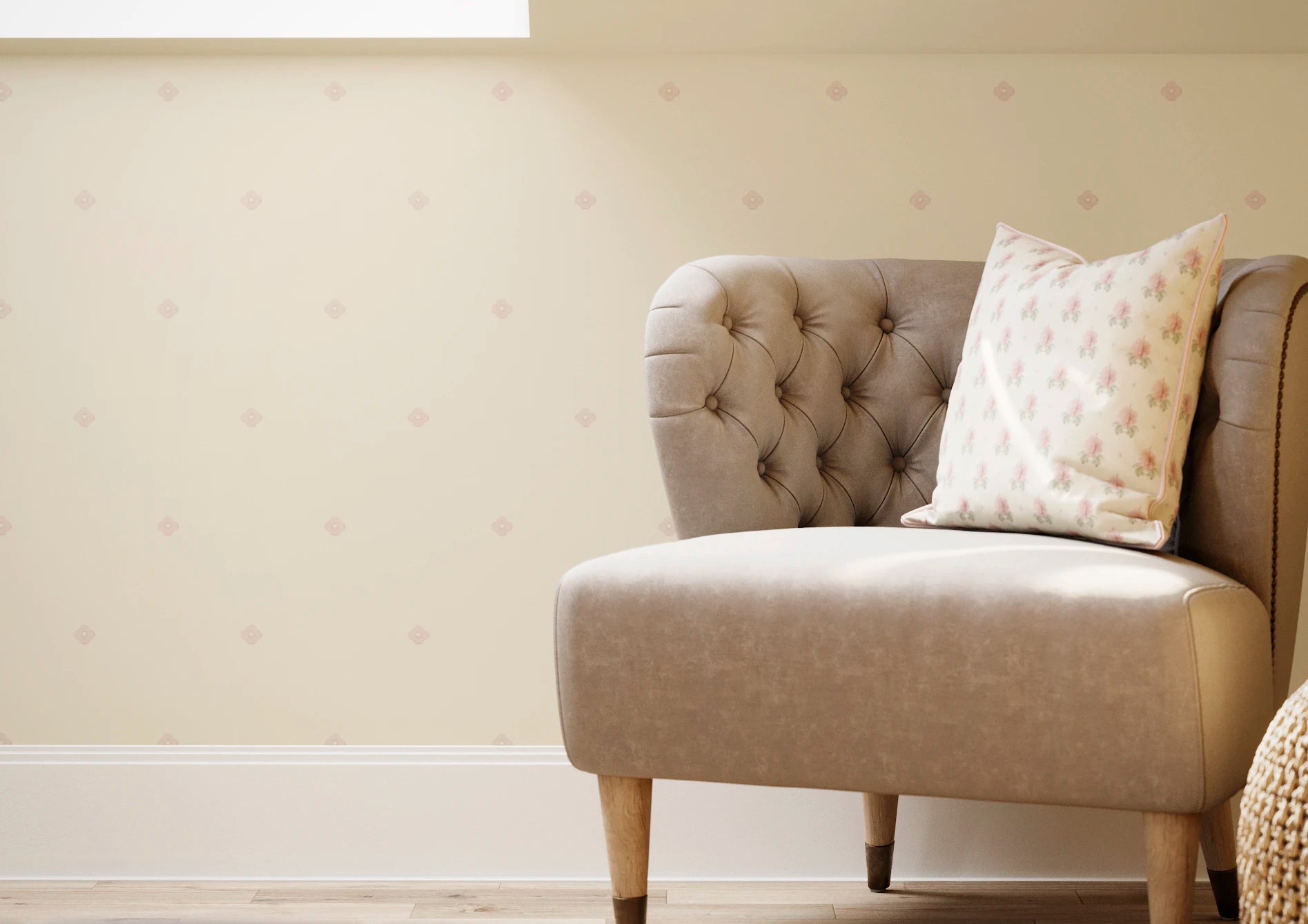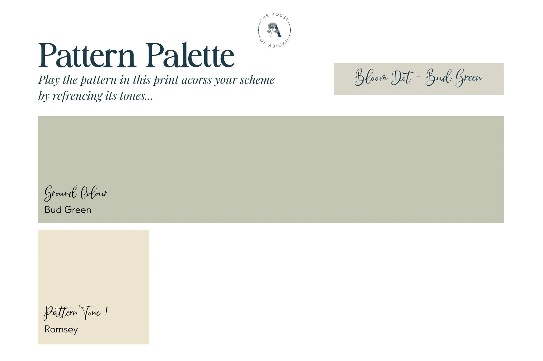 Noble Stripe is a quietly structured design, featuring a hand-drawn rope stripe at its centre, flanked by delicate trellis and double ticking stripes. In a soft Bud Green colourway, its balanced composition brings a tailored elegance to interiors, evoking vintage haberdashery and refined upholstery.