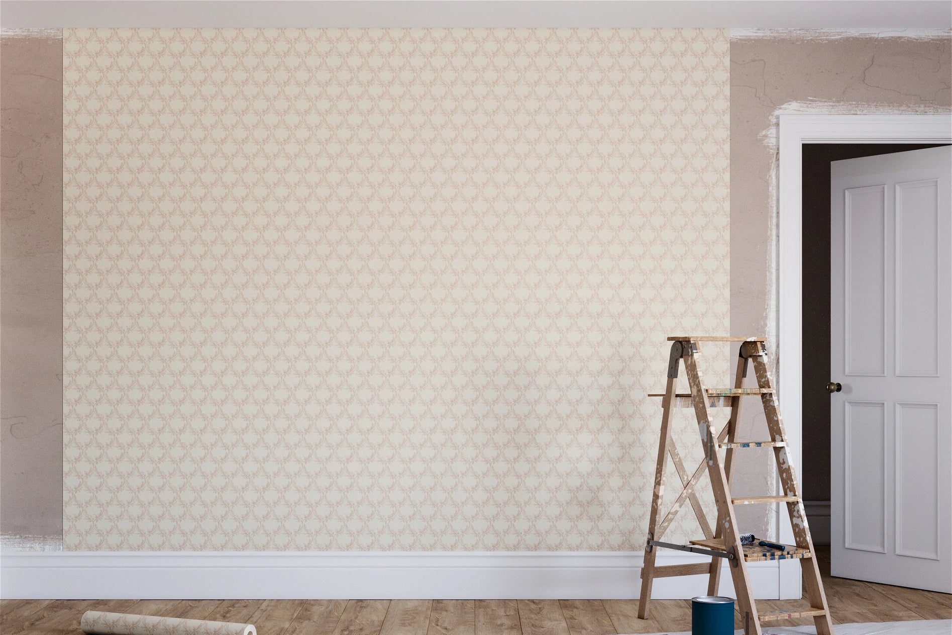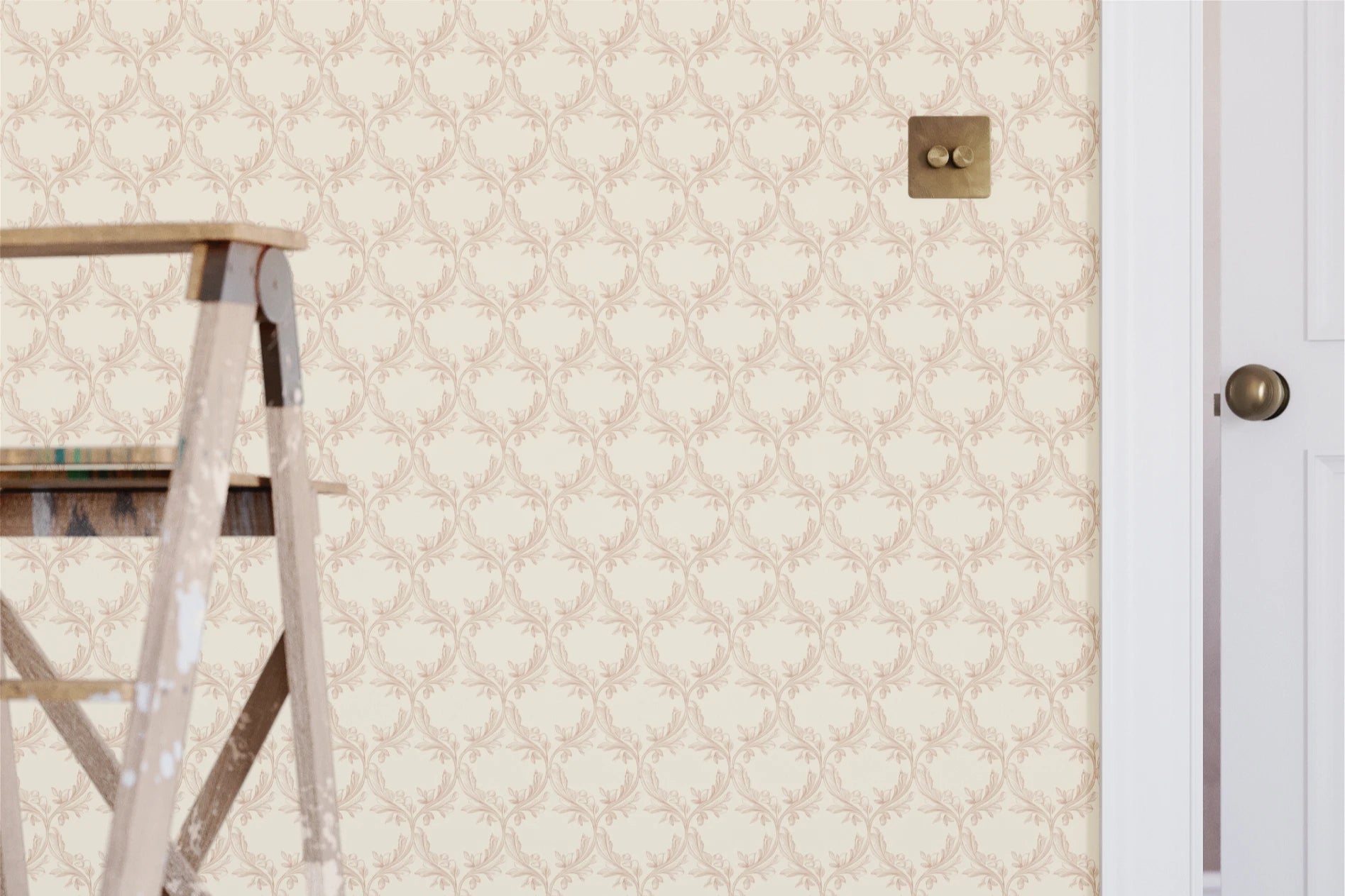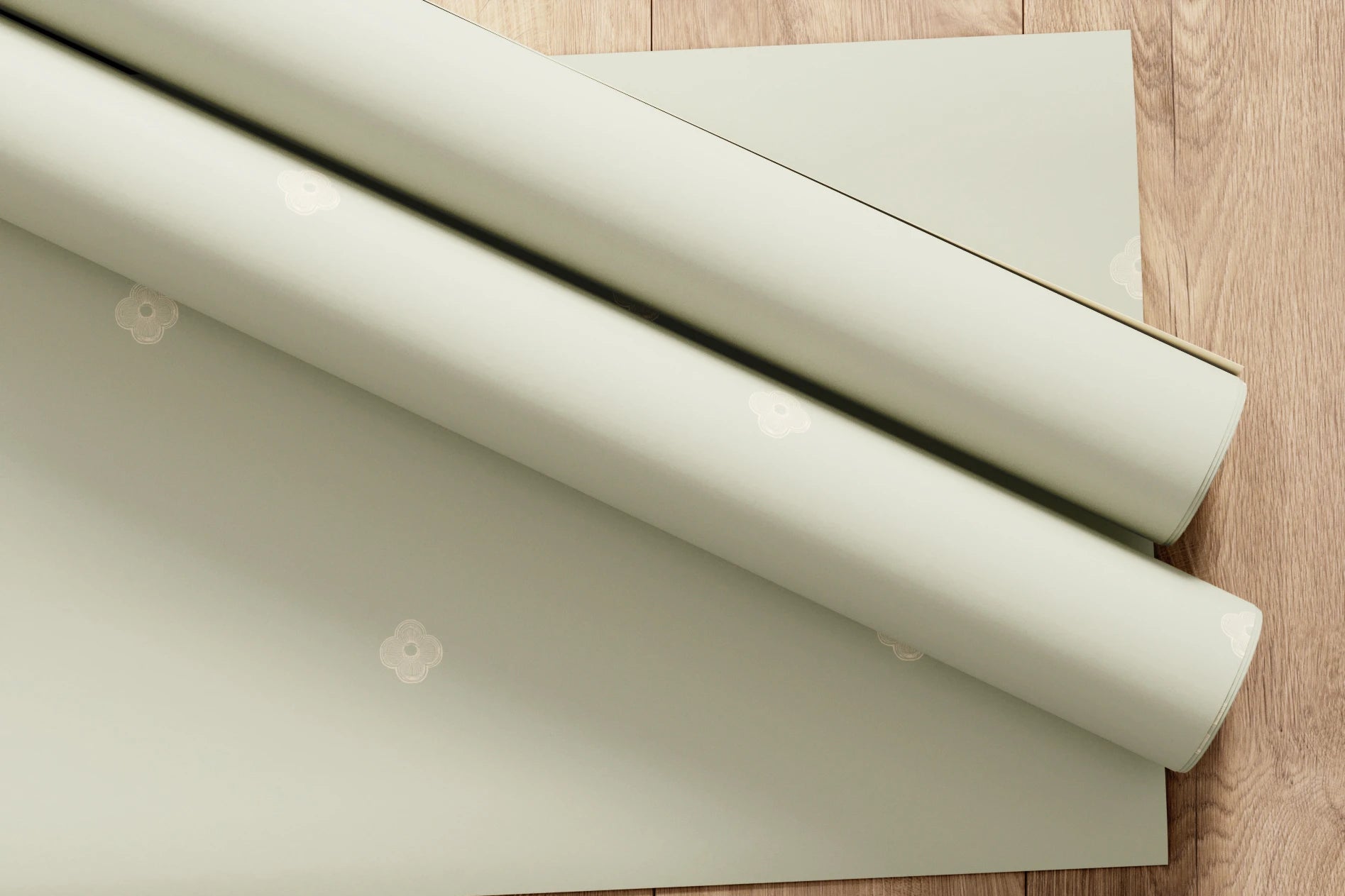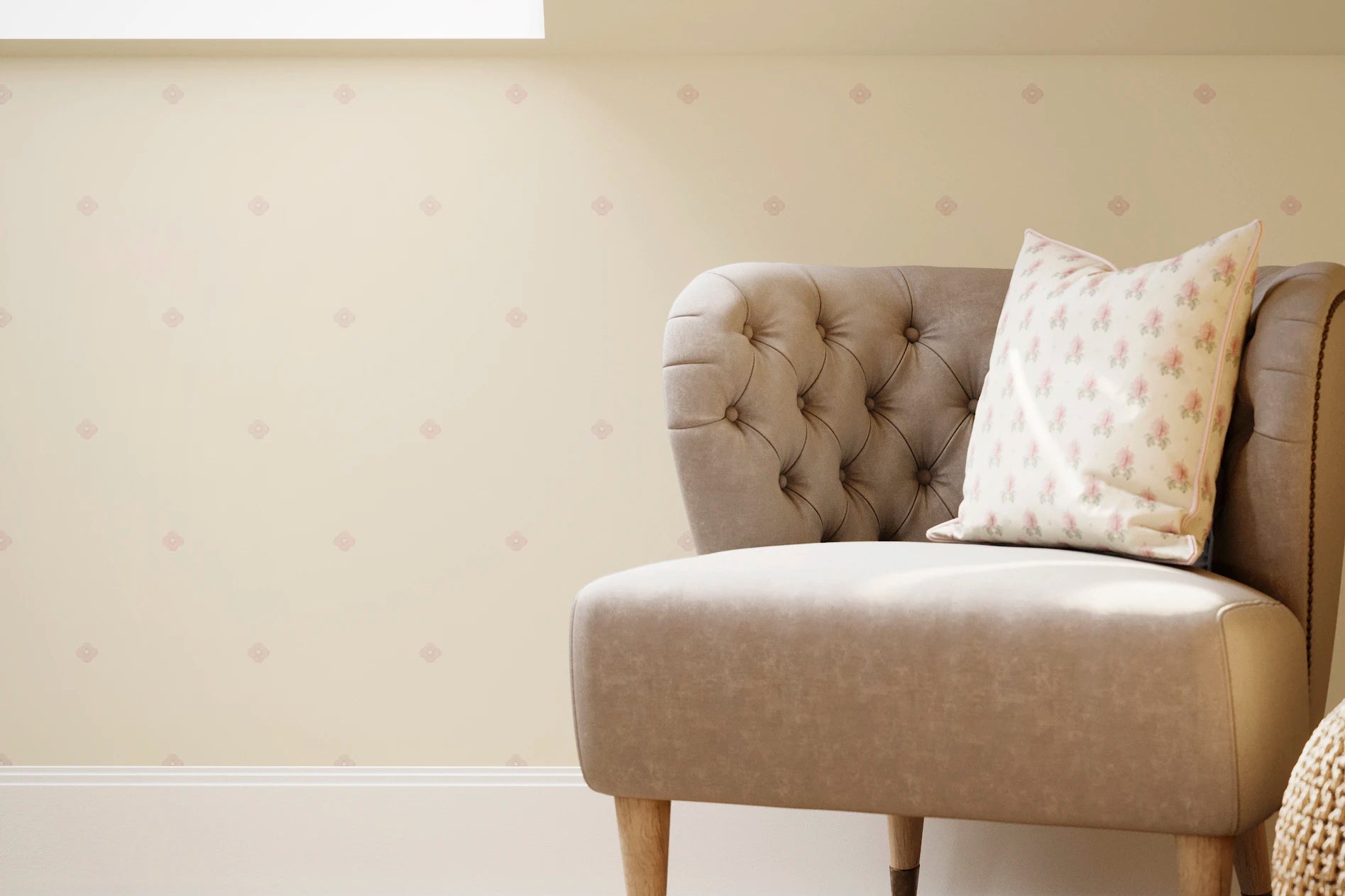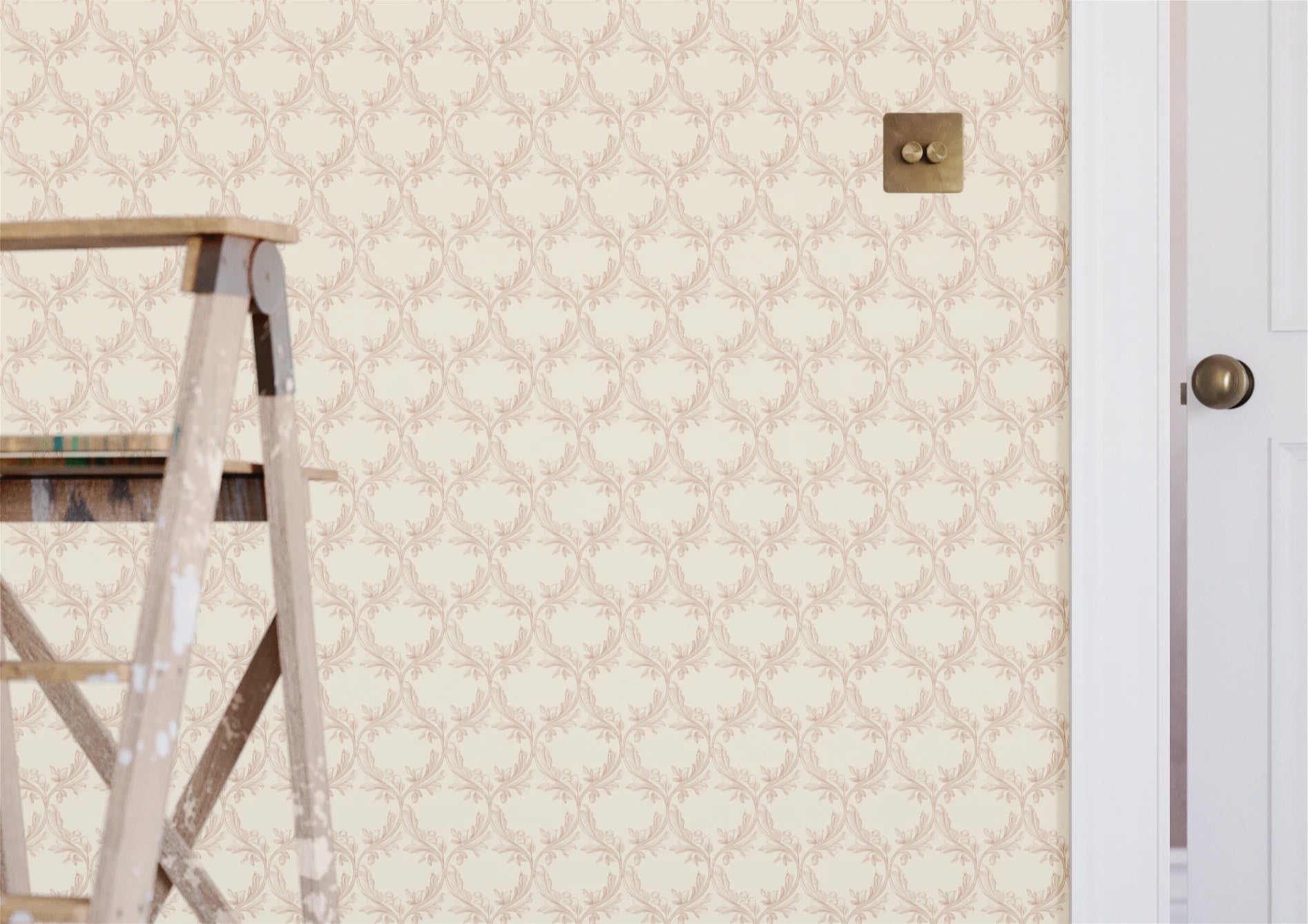 Noble Stripe is a quietly structured design, featuring a hand-drawn rope stripe at its centre, flanked by delicate trellis and double ticking stripes. In a soft Bud Green colourway, its balanced composition brings a tailored elegance to interiors, evoking vintage haberdashery and refined upholstery.