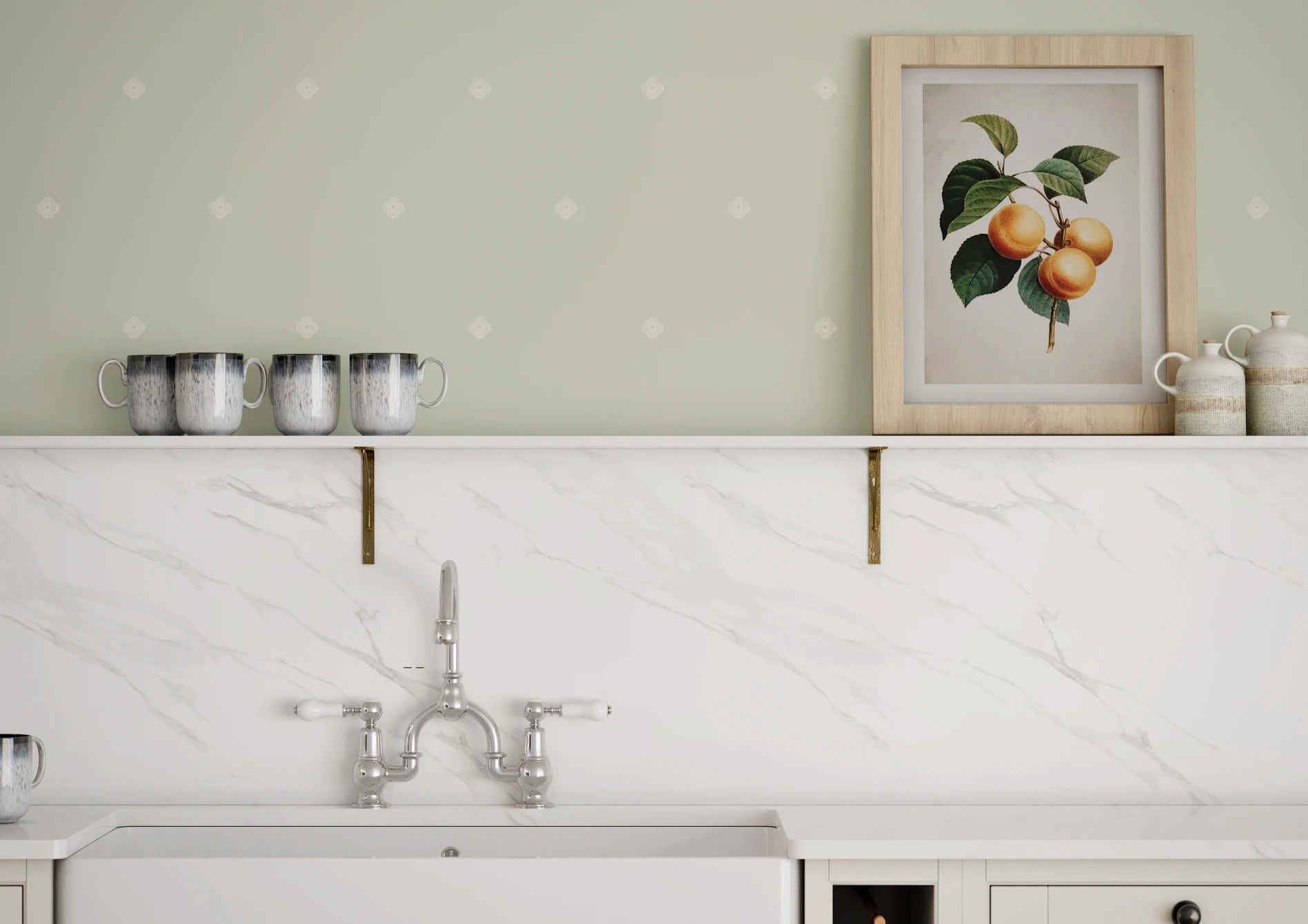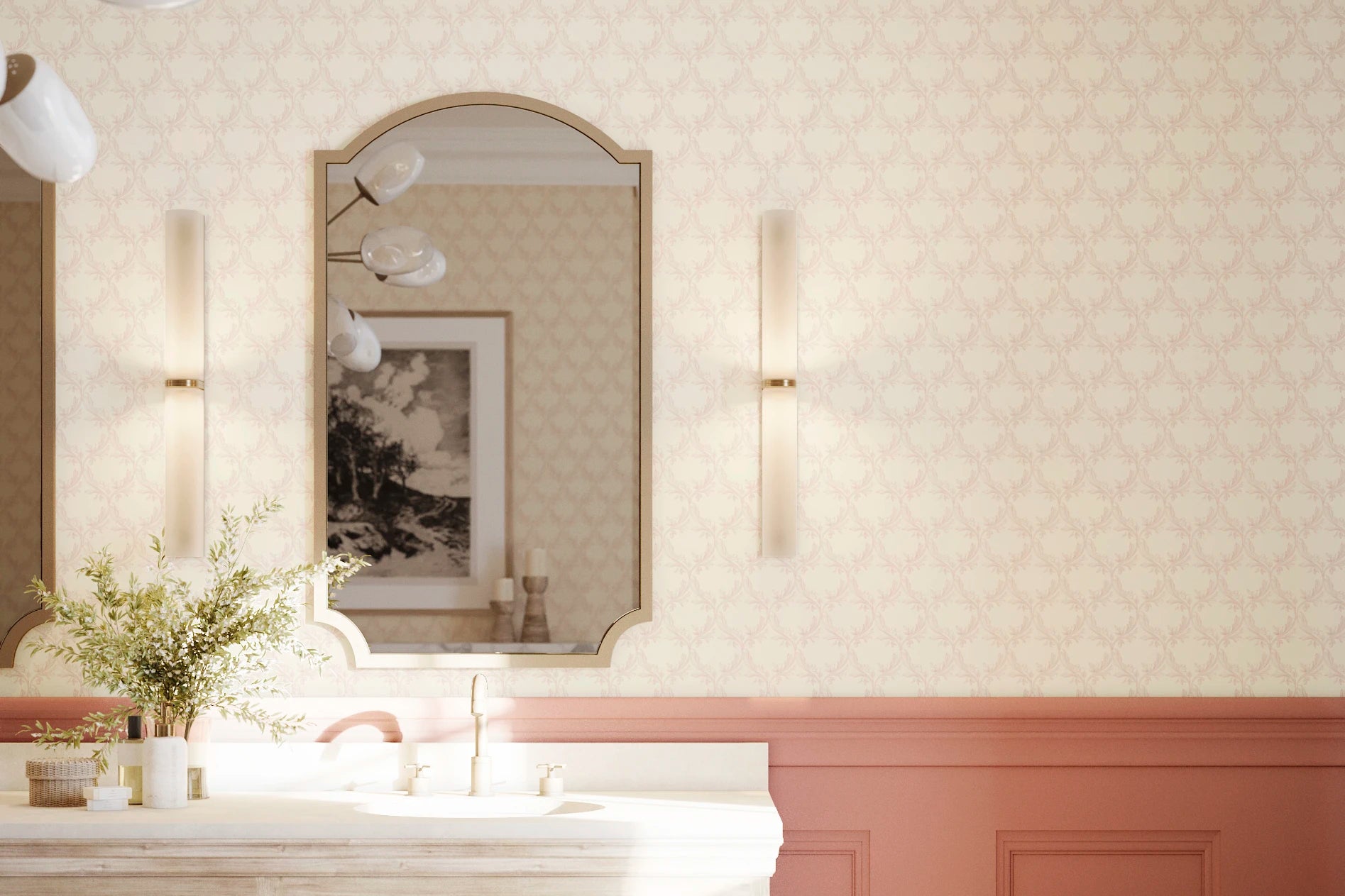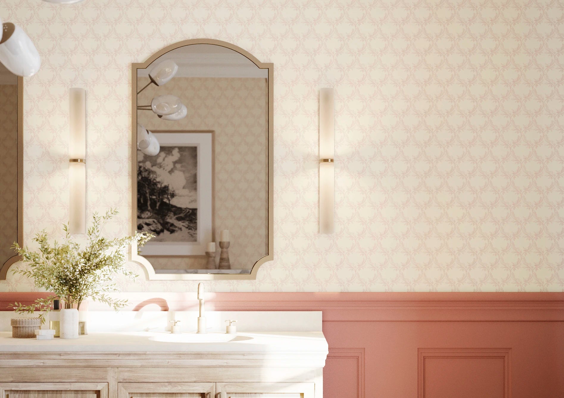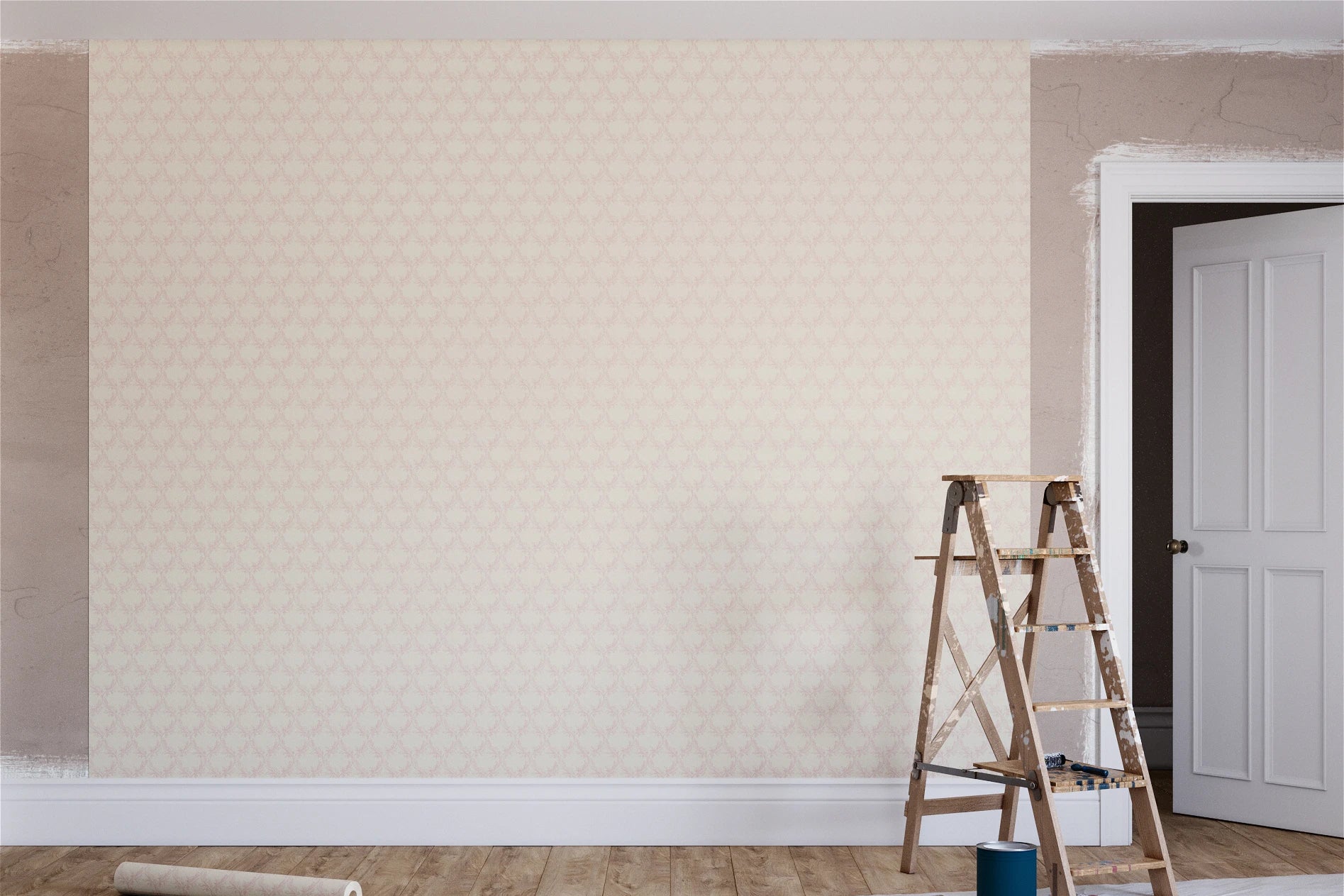 Noble Stripe is a quietly structured design, featuring a hand-drawn rope stripe at its centre, flanked by delicate trellis and double ticking stripes. In a soft Bud Green colourway, its balanced composition brings a tailored elegance to interiors, evoking vintage haberdashery and refined upholstery.