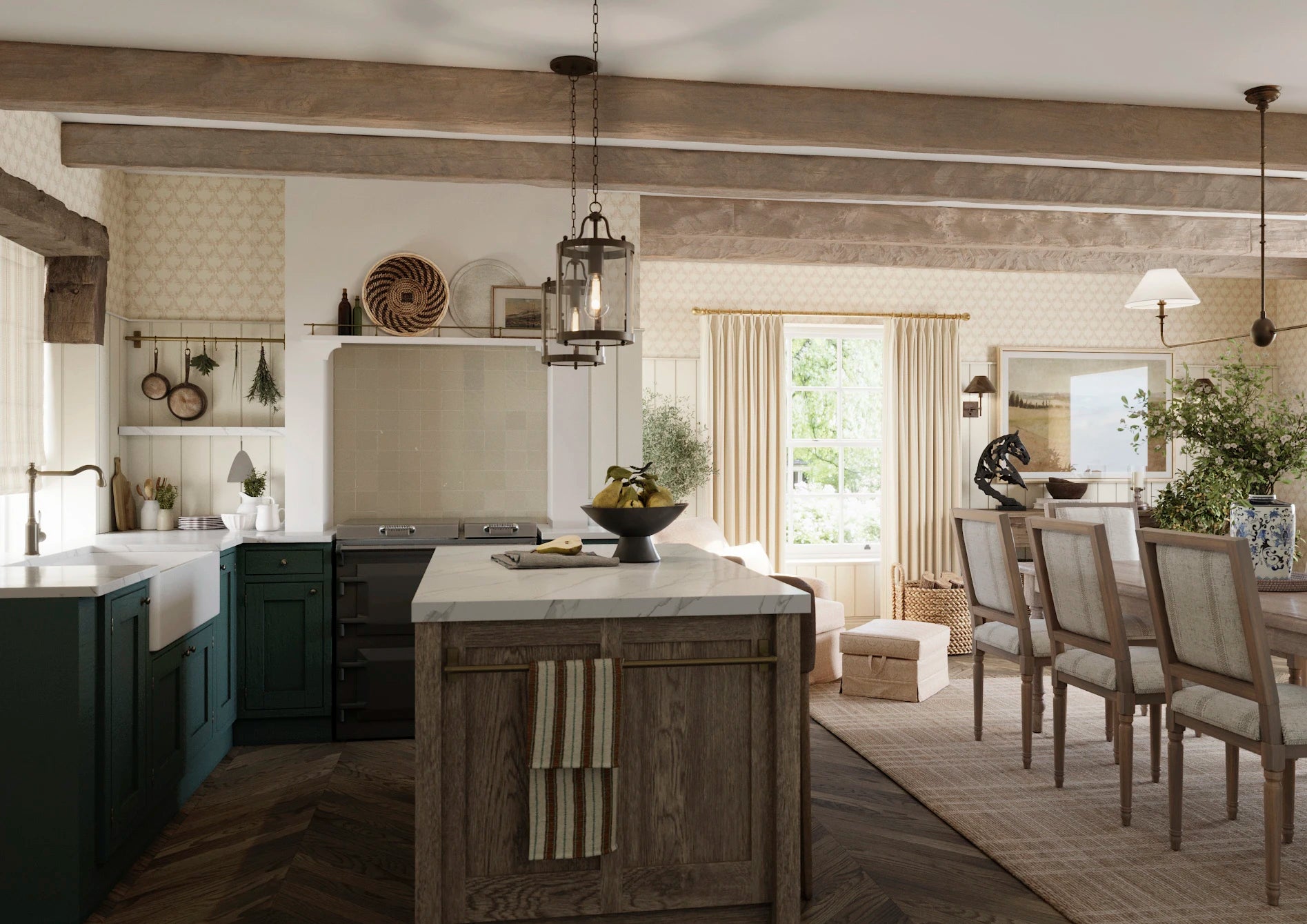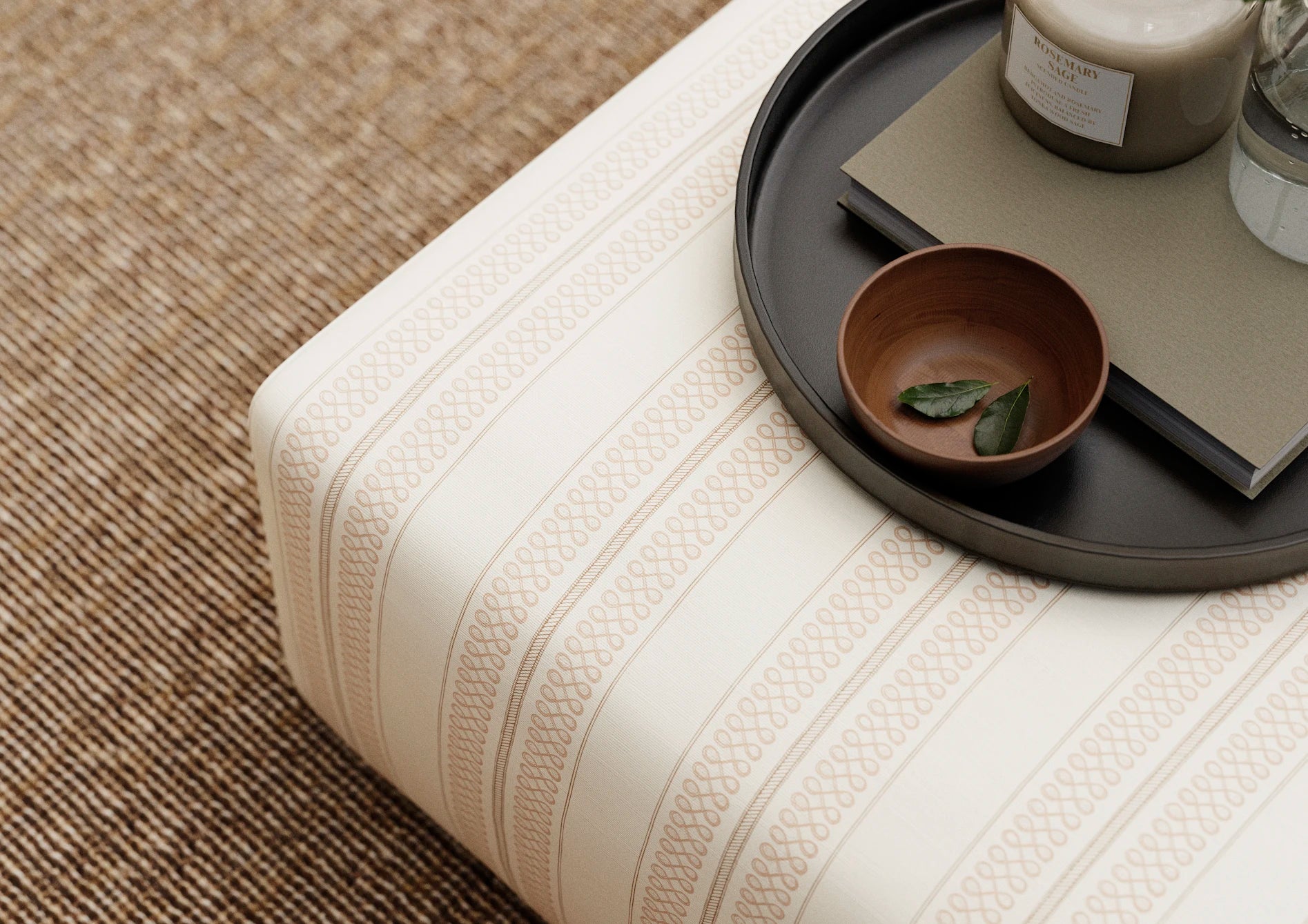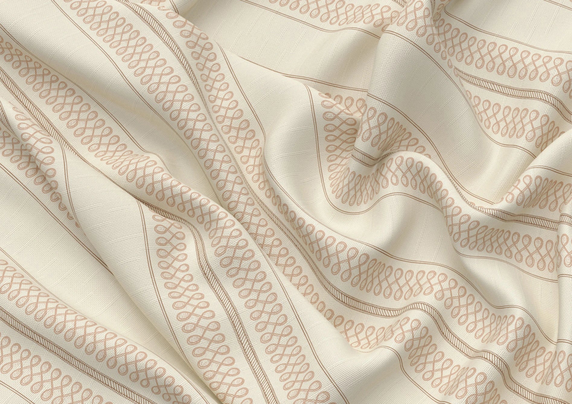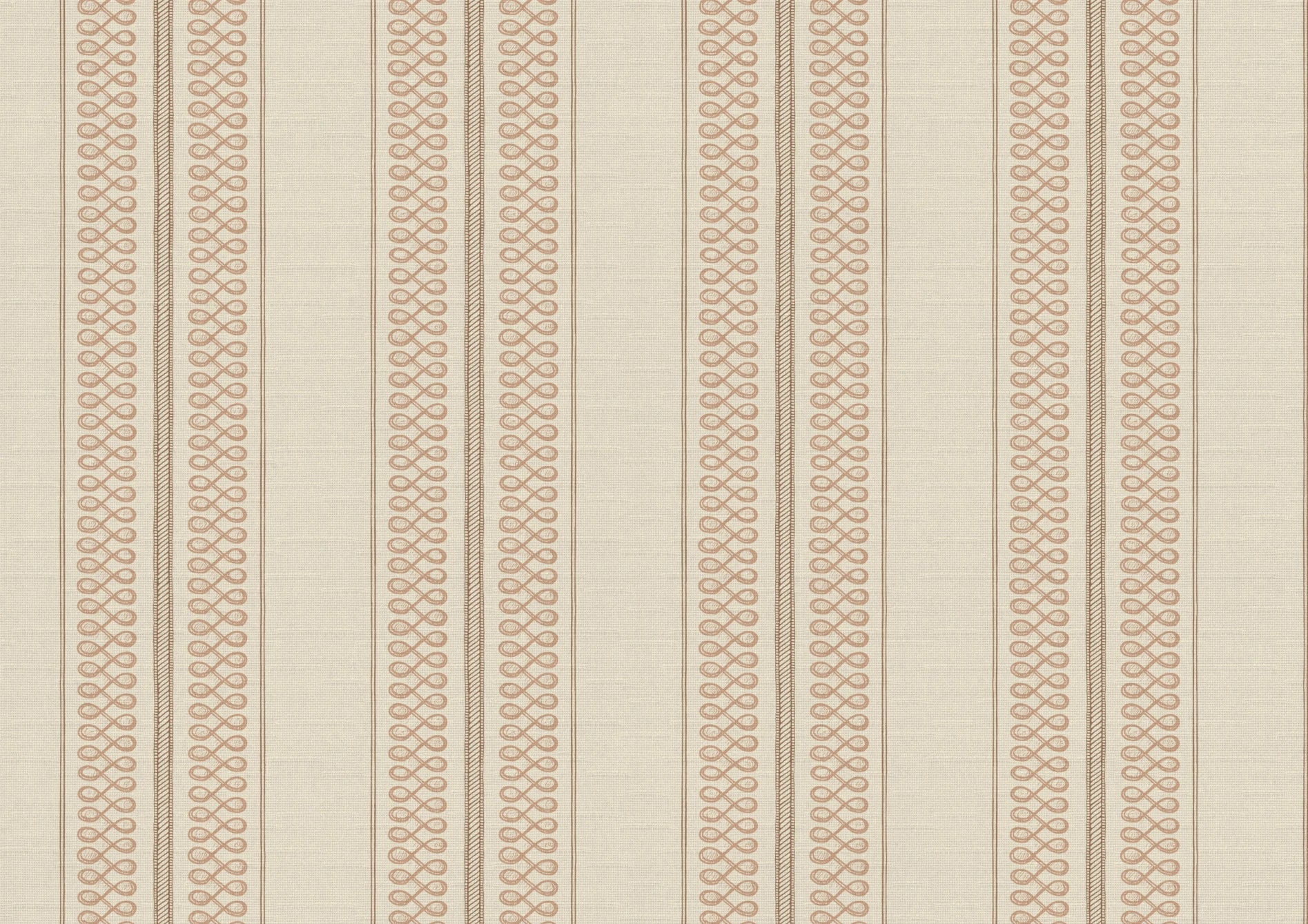 Noble Stripe is a quietly structured design, featuring a hand-drawn rope stripe at its centre, flanked by delicate trellis and double ticking stripes. In a warm, earthy Manson colourway, its balanced composition brings a tailored elegance to interiors, evoking vintage haberdashery and refined upholstery.