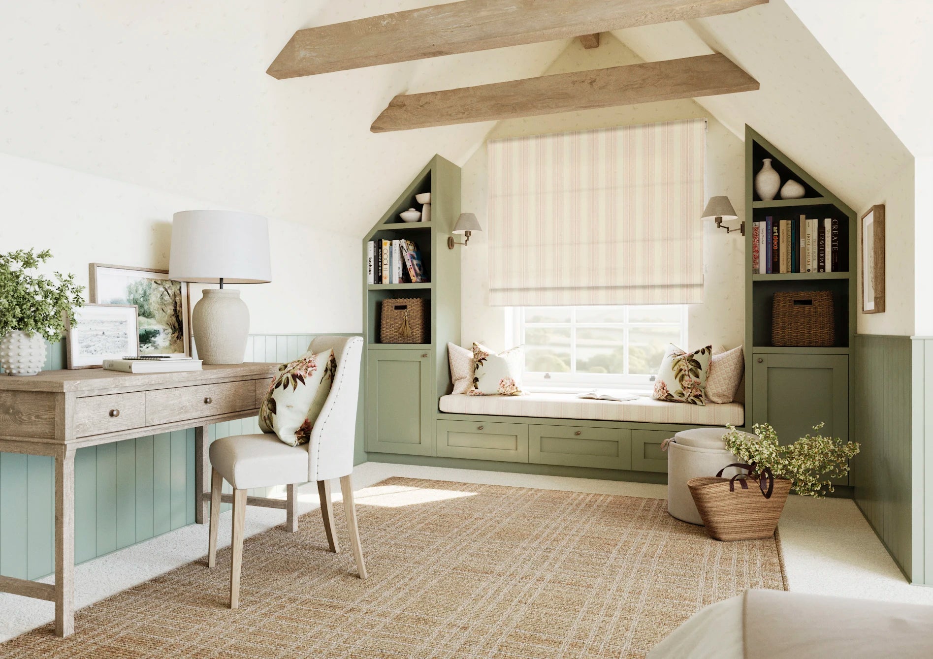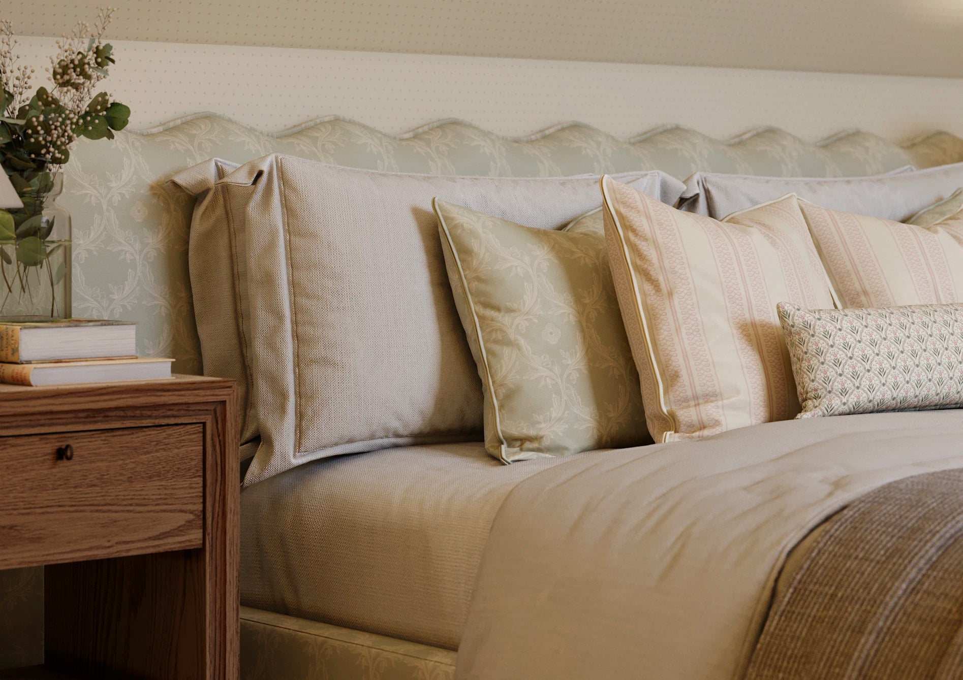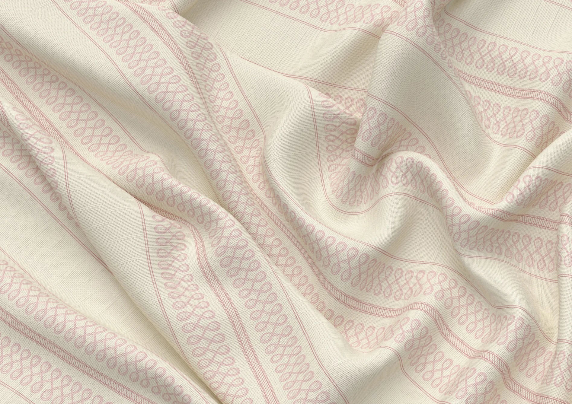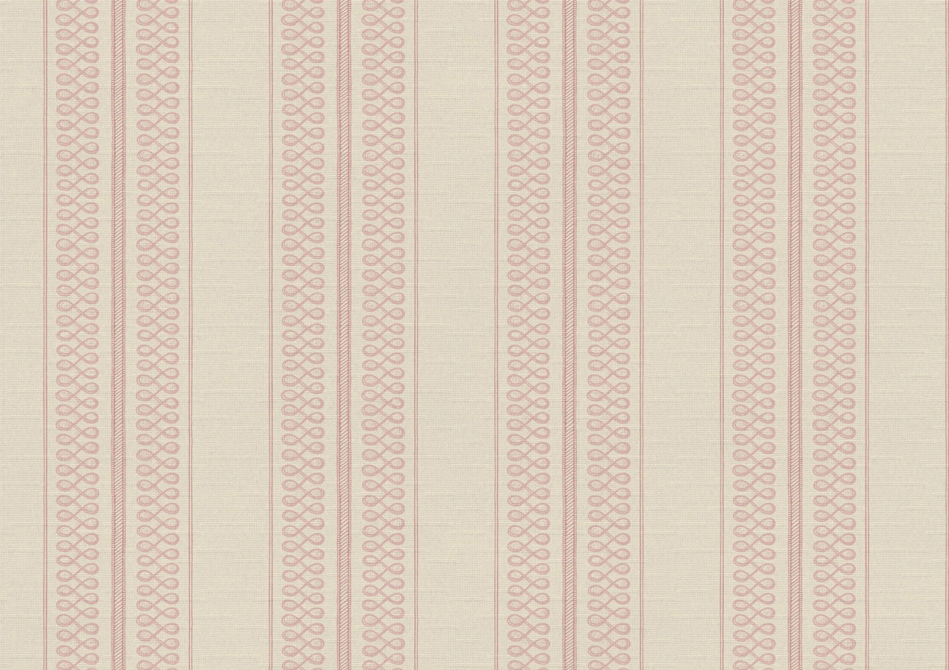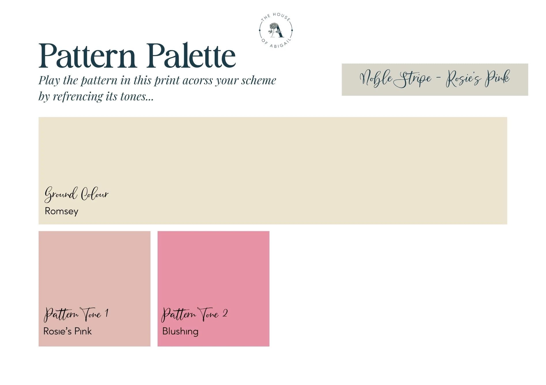 Noble Stripe is a quietly structured design, featuring a hand-drawn rope stripe at its centre, flanked by delicate trellis and double ticking stripes. In a soft Rosies Pink, its balanced composition brings a tailored elegance to interiors, evoking vintage haberdashery and refined upholstery.