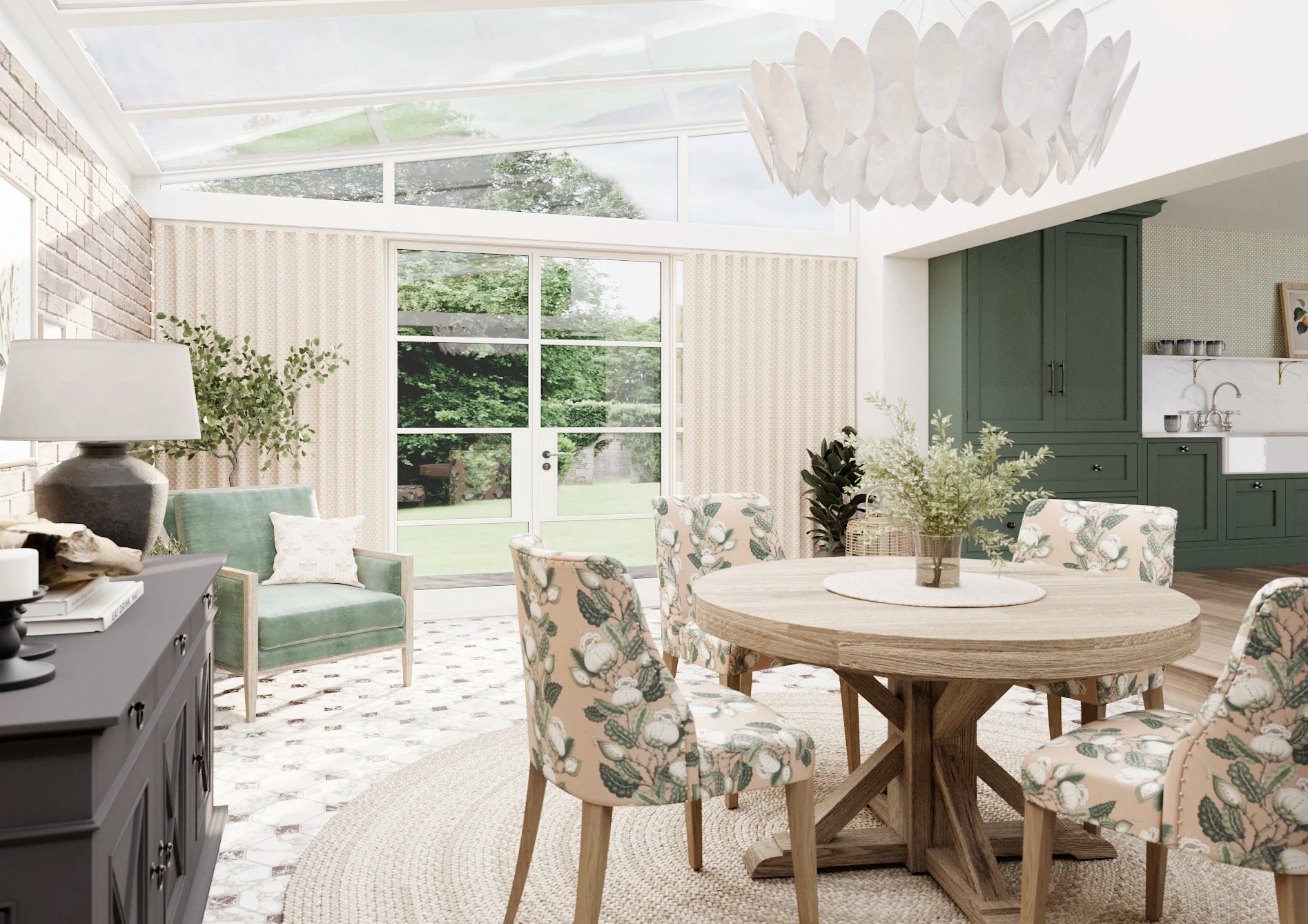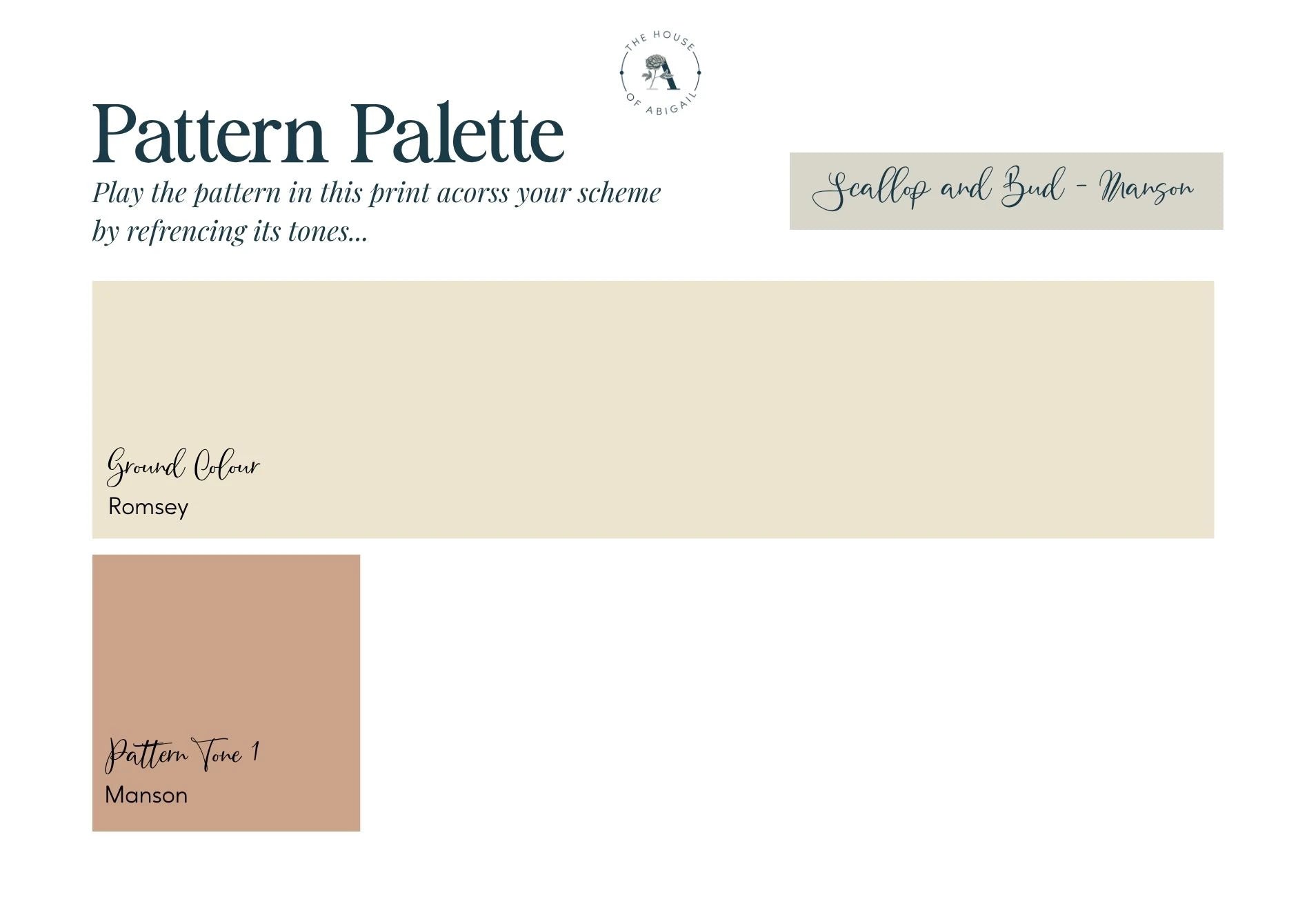 Scallop & Bud brings graceful geometry and stylised botanical form together in a quietly elegant repeat. Inspired by the flowing arches of wrought iron gates and early 20th-century garden trelliswork, each scalloped frame holds a cluster of gently drawn buds and leaves, creating a soft, structured rhythm. The Manson palette lends a natural subtlety to the design, enhancing its calming, grounded character.