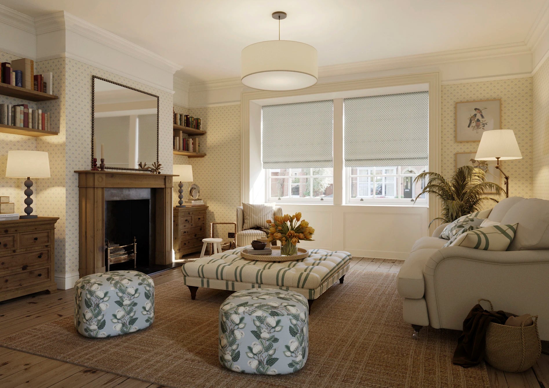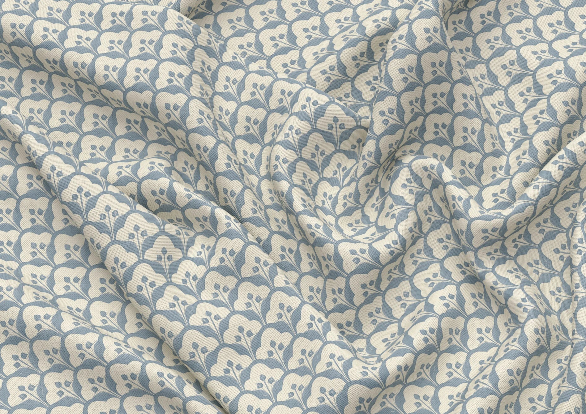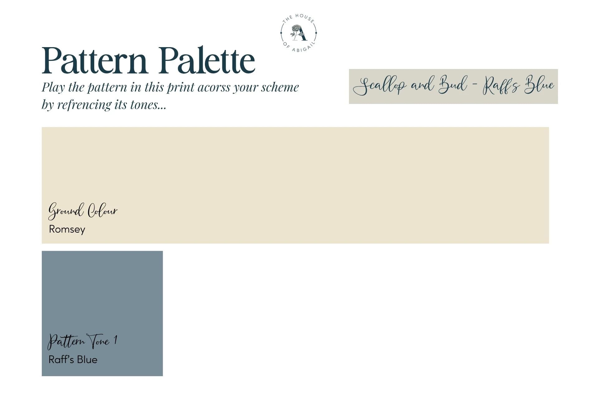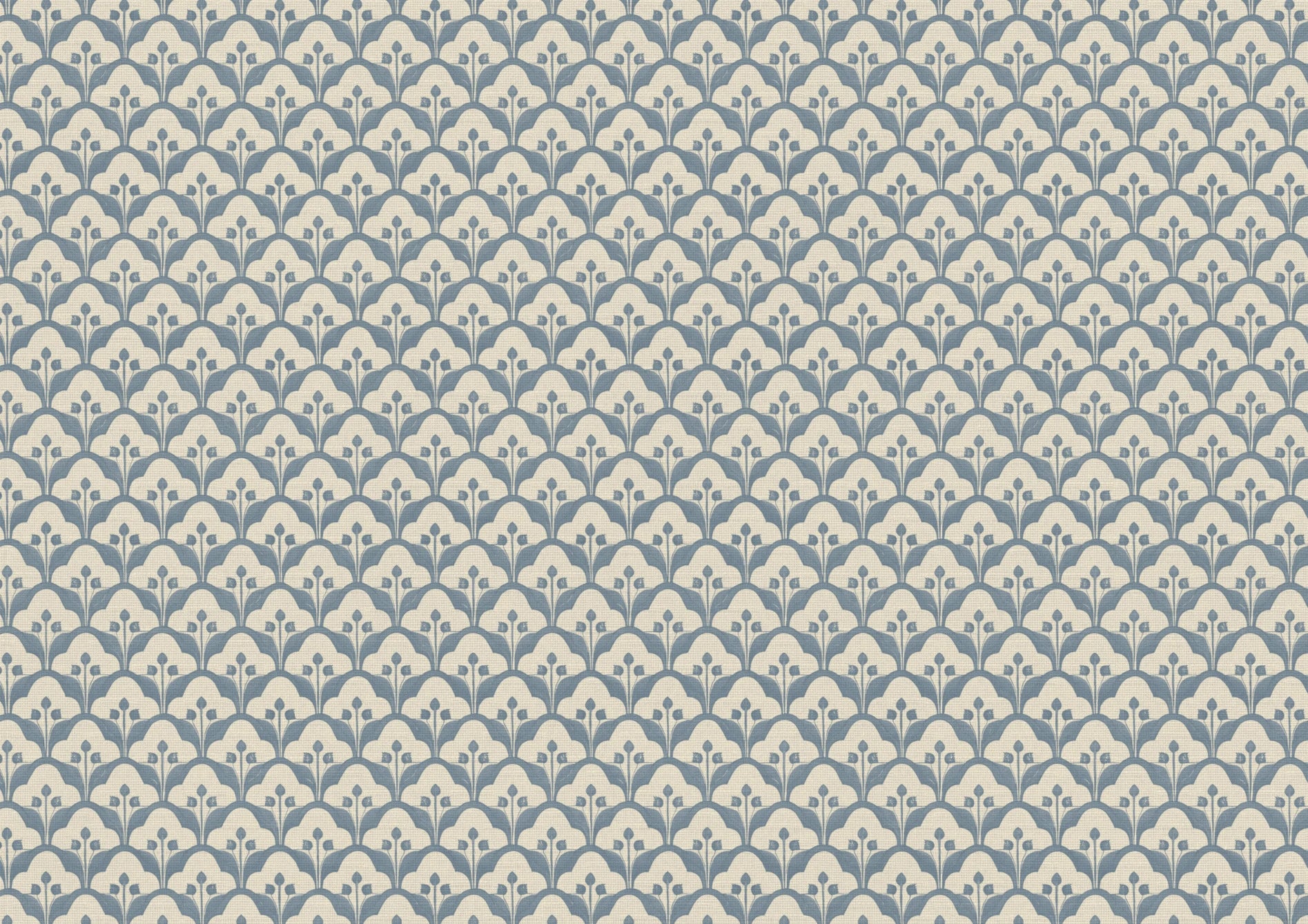 Scallop & Bud brings graceful geometry and stylised botanical form together in a quietly elegant repeat. Inspired by the flowing arches of wrought iron gates and early 20th-century garden trelliswork, each scalloped frame holds a cluster of gently drawn buds and leaves, creating a soft, structured rhythm. The Raffs Blue palette lends a natural subtlety to the design, enhancing its calming, grounded character.