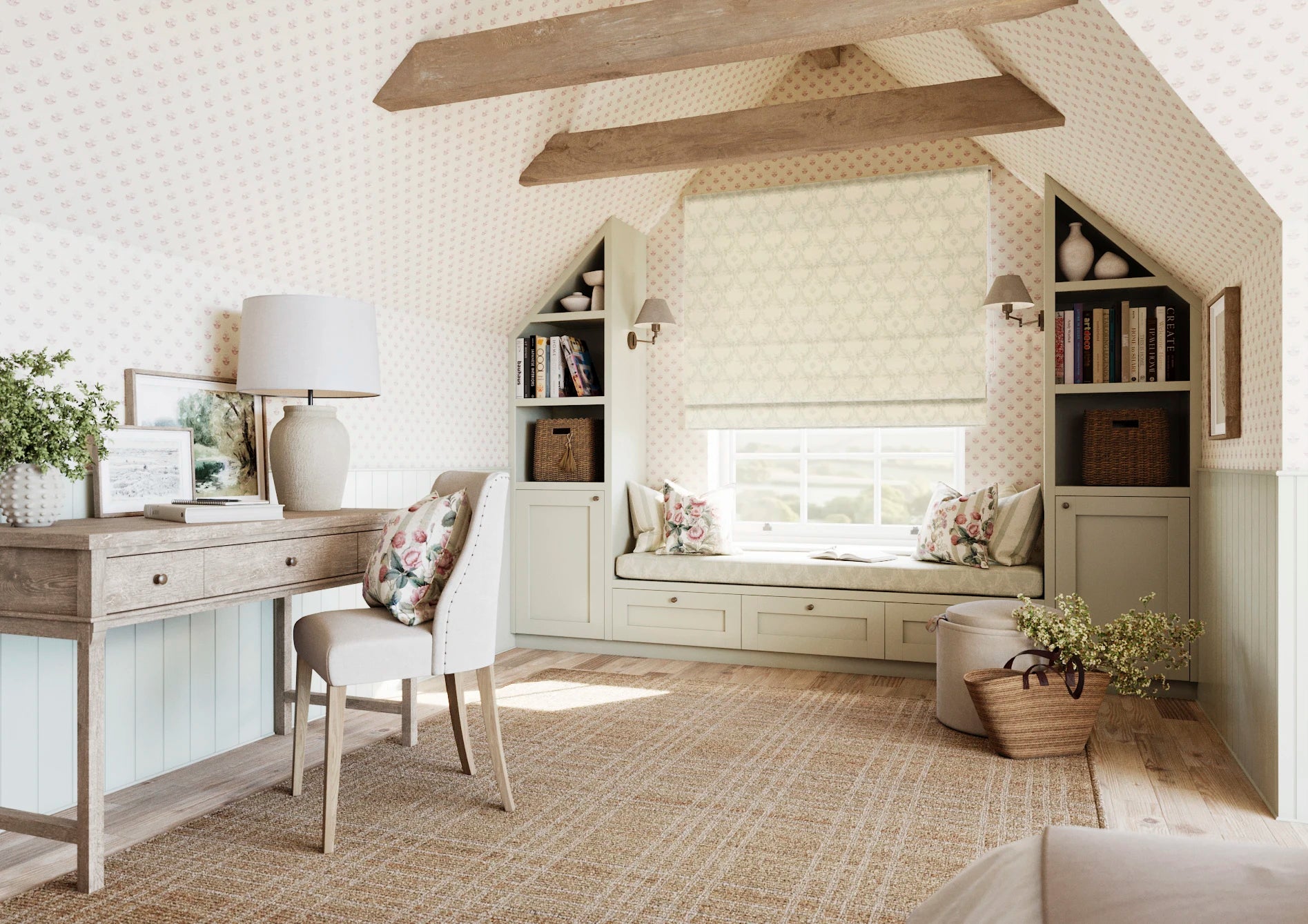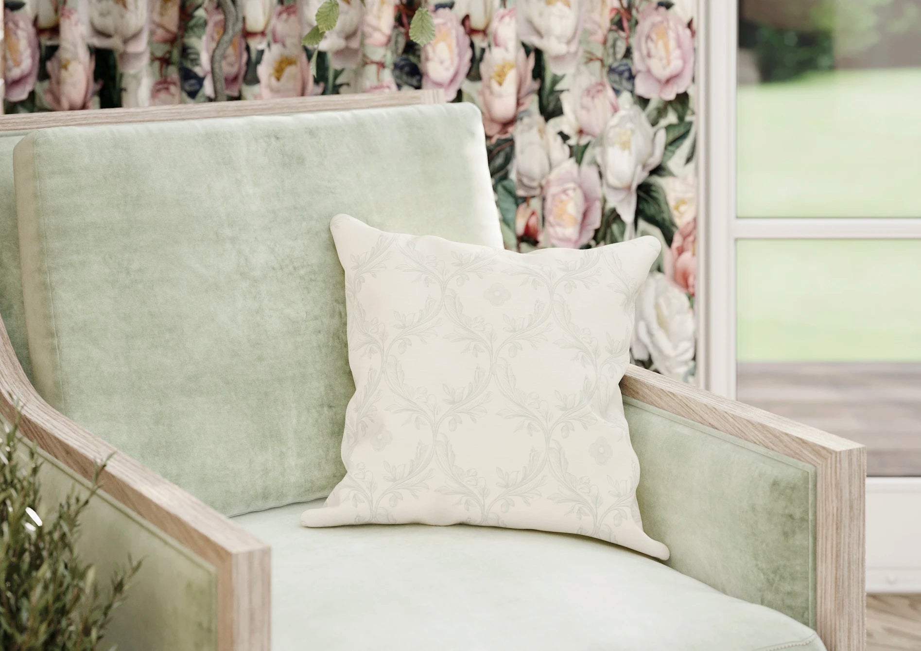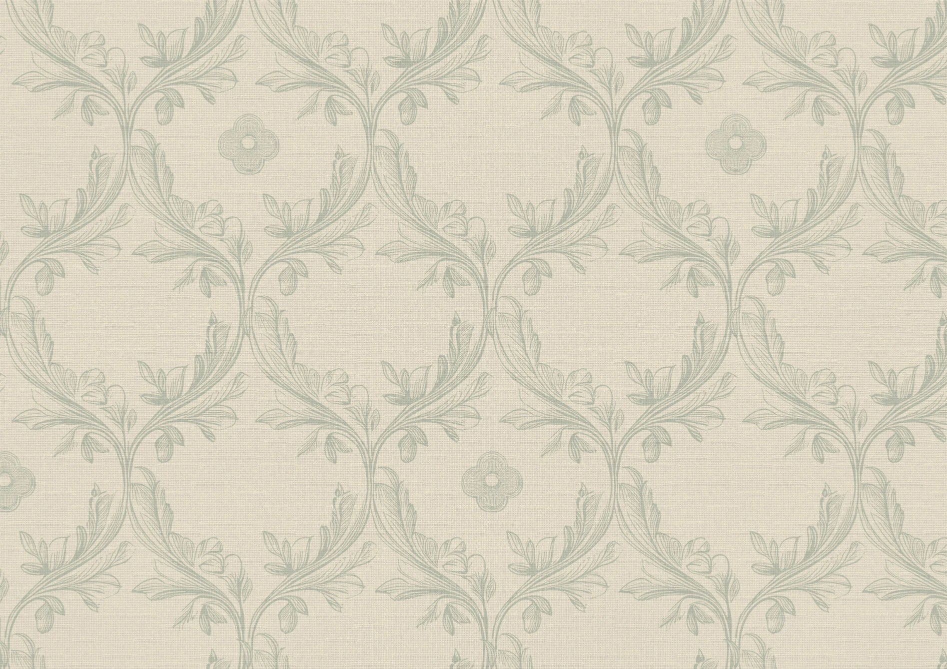Vine & Bloom is a flowing, ornamental pattern inspired by ecclesiastical stone carvings and the natural forms found in wrought iron garden gates. Curving vine work weaves gently through the design, punctuated by stylised leaf clusters and delicate floral medallions. The Bud Green palette softens its classical form, creating a design that is both structured and serene.