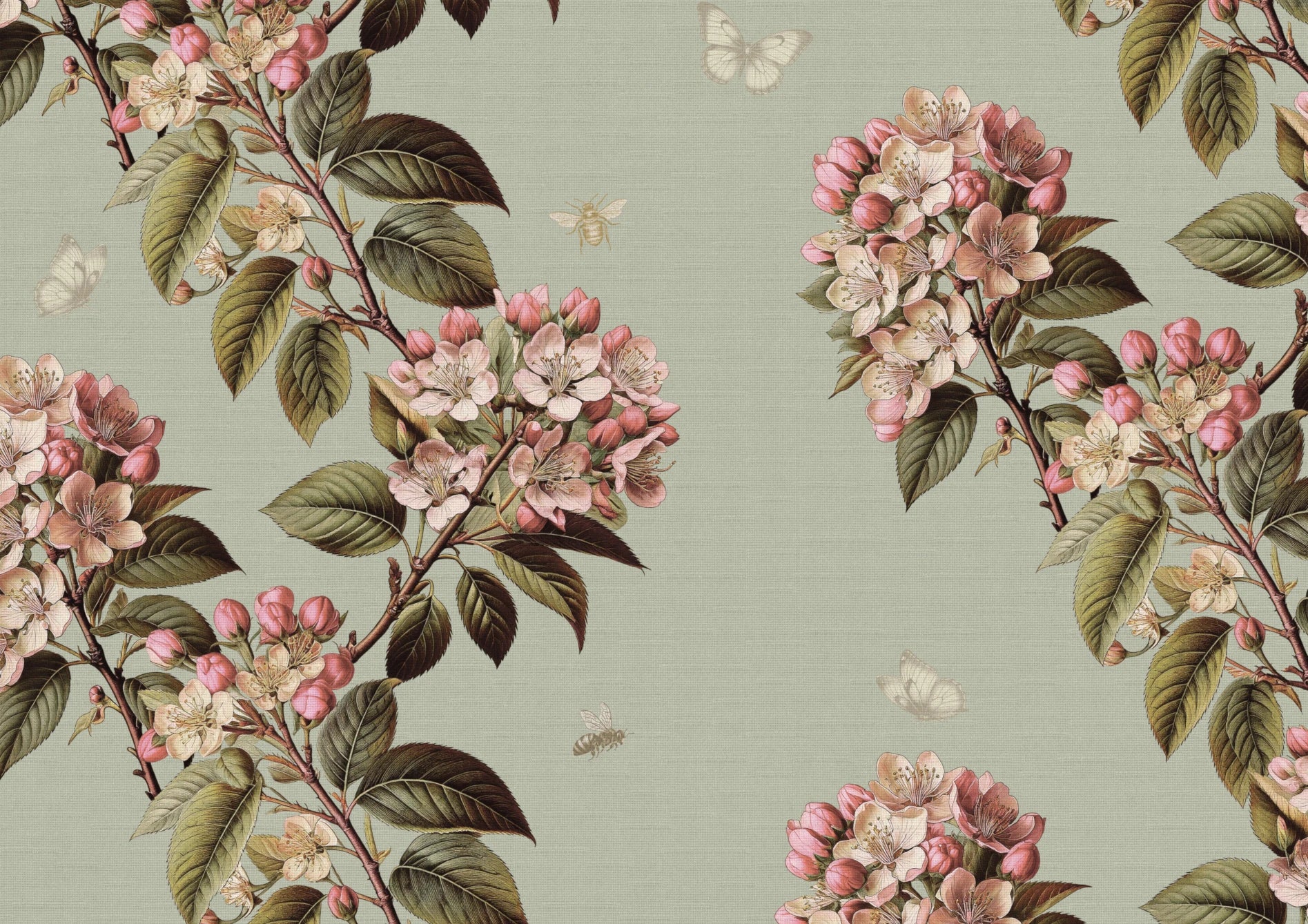 April’s Bloom is a celebration of spring’s first flourish - an expressive, hand-drawn design featuring blossoming apple branches alive with petal, leaf, and motion. Carefully composed in a vertical serpentine repeat, the design flows rhythmically across a soft Bud Green ground, with delicate bees and butterflies scattered throughout for a touch of whimsy and natural energy.