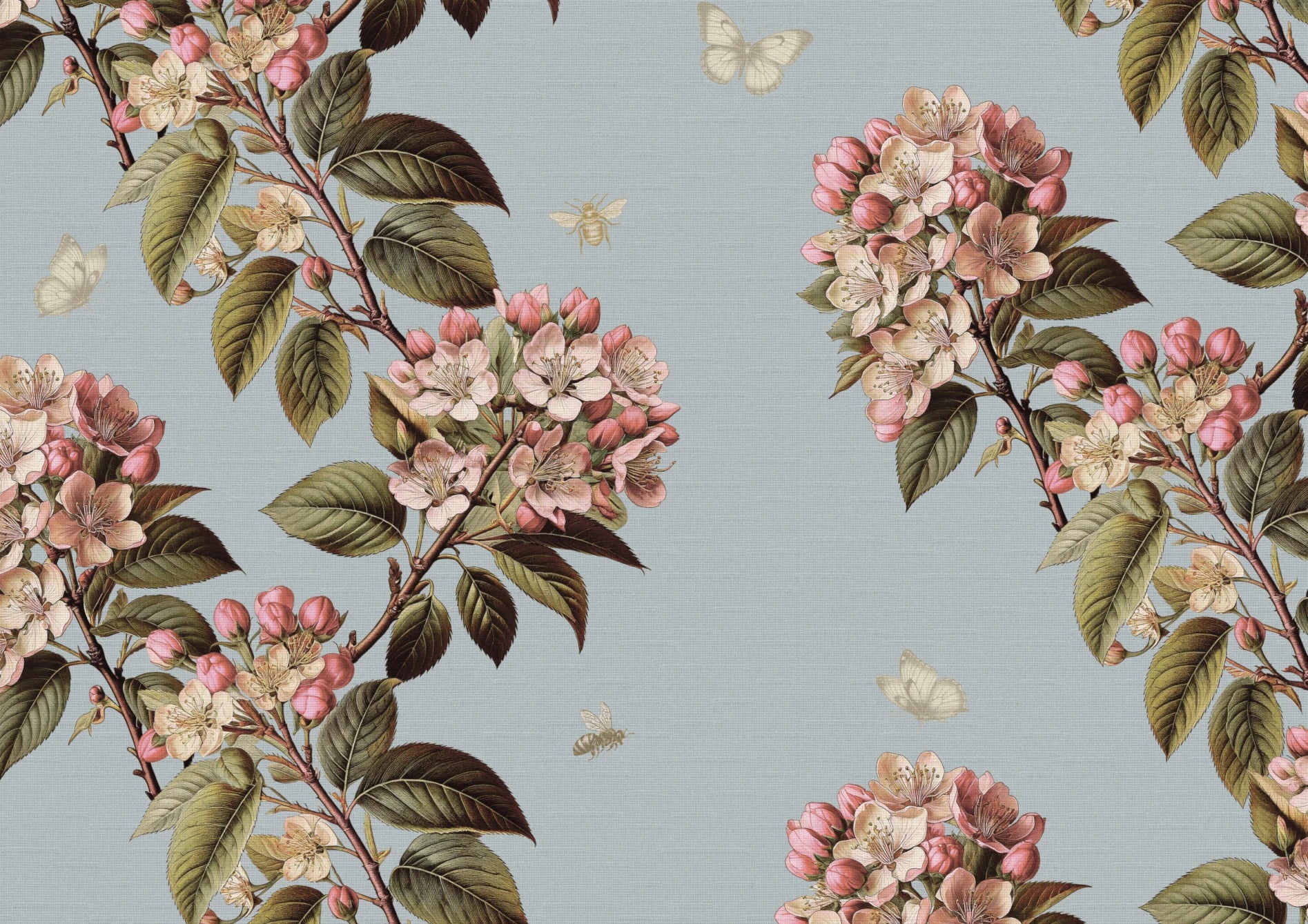 April’s Bloom is a celebration of spring’s first flourish - an expressive, hand-drawn design featuring blossoming apple branches alive with petal, leaf, and motion. Carefully composed in a vertical serpentine repeat, the design flows rhythmically across a soft Smokes ground, with delicate bees and butterflies scattered throughout for a touch of whimsy and natural energy.